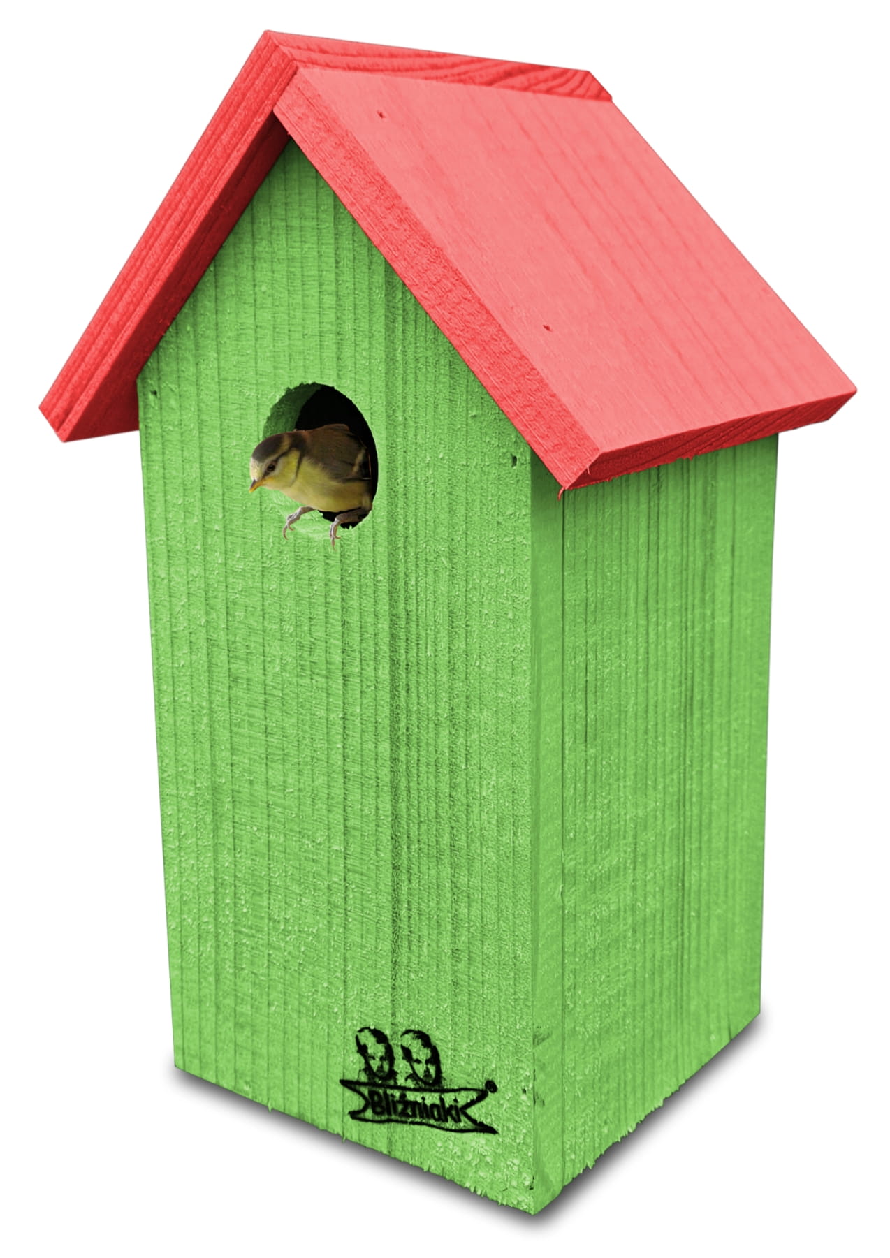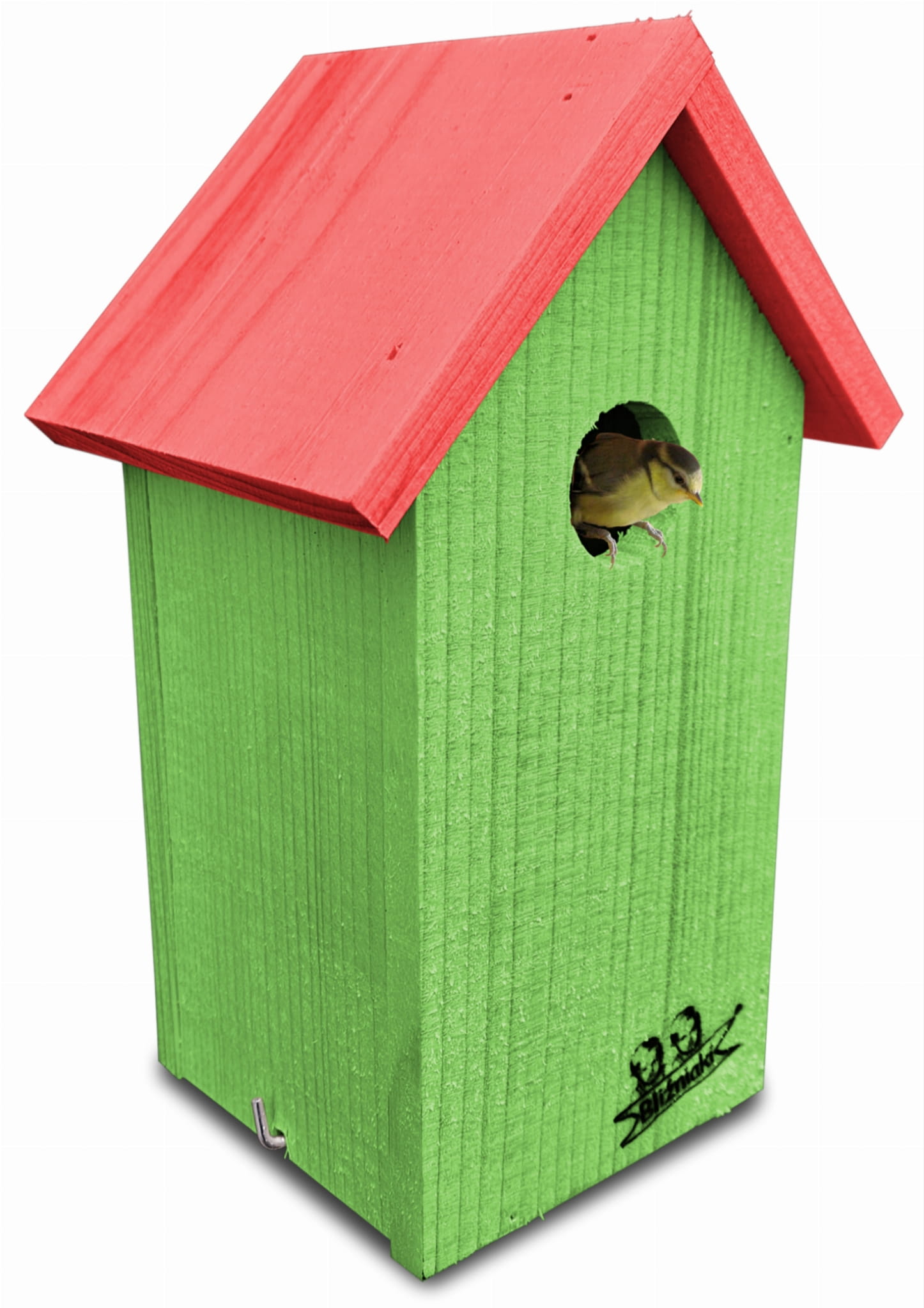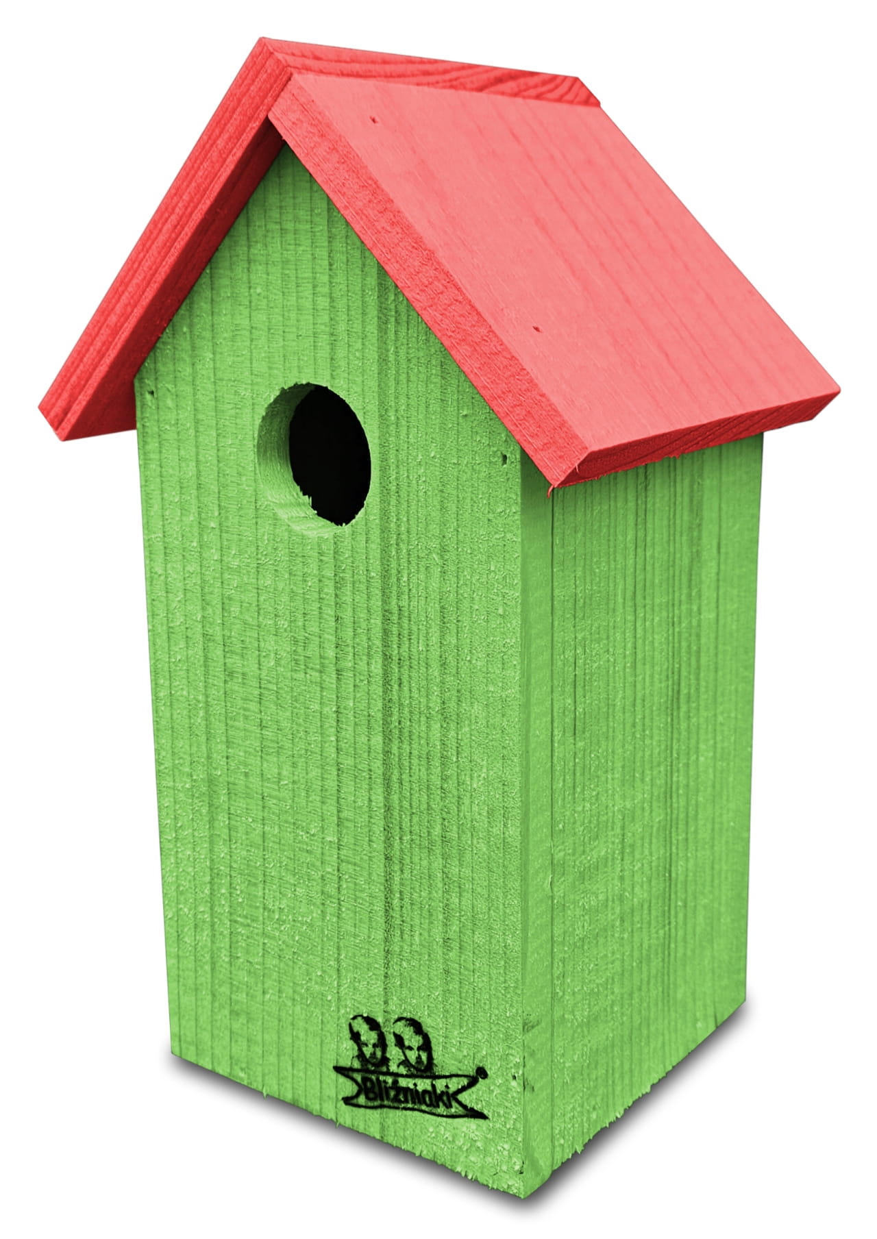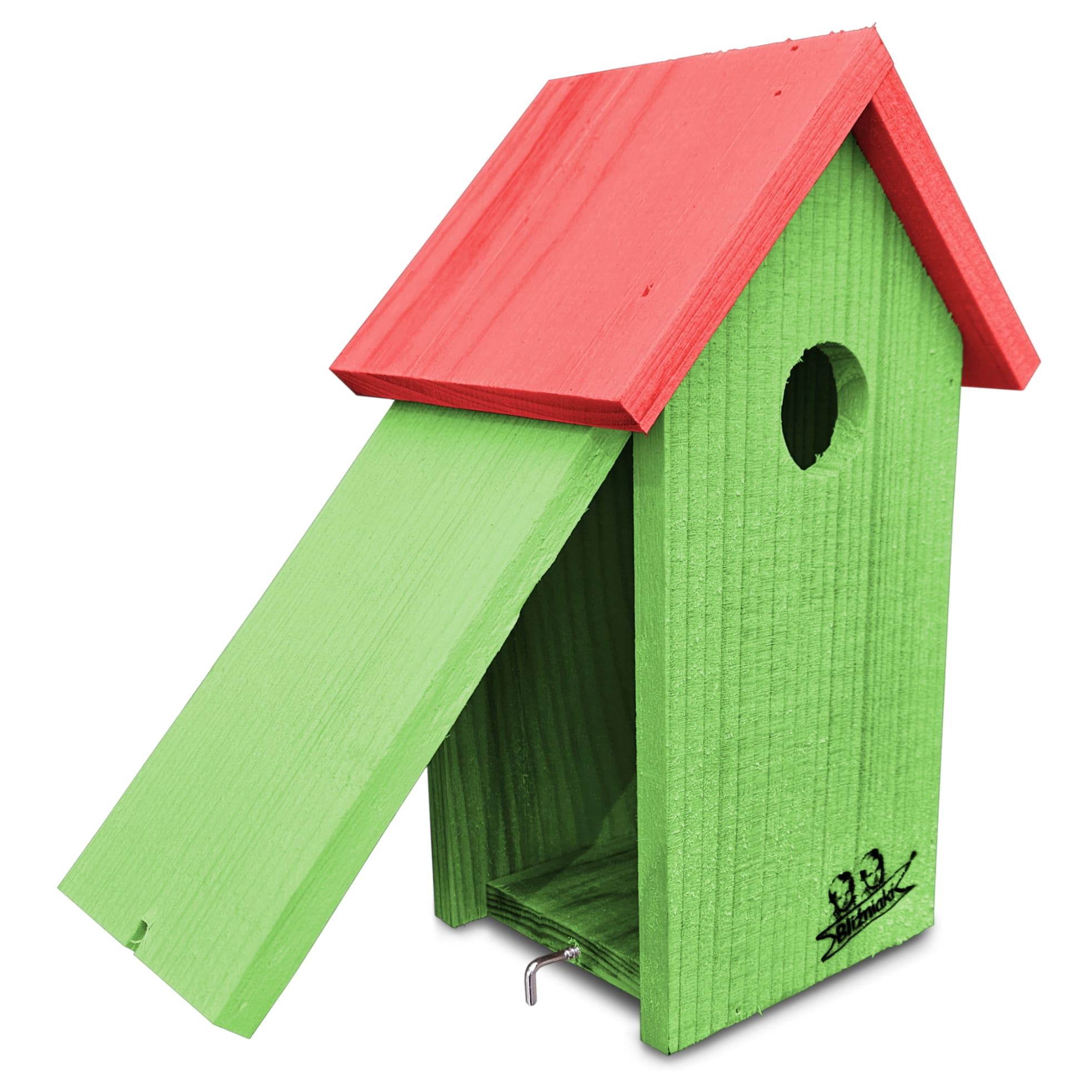 W przeważającej części skrzynka lęgowa jest w kolorze JASNYM ZIELONYM, dach pokryty został kolorem CZERWONYM.