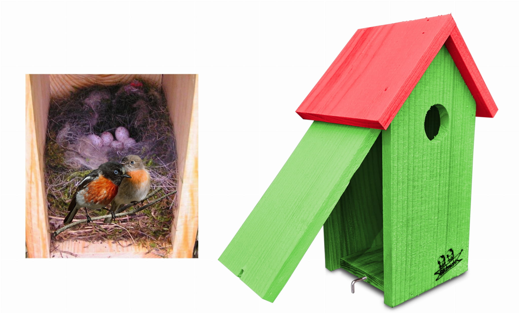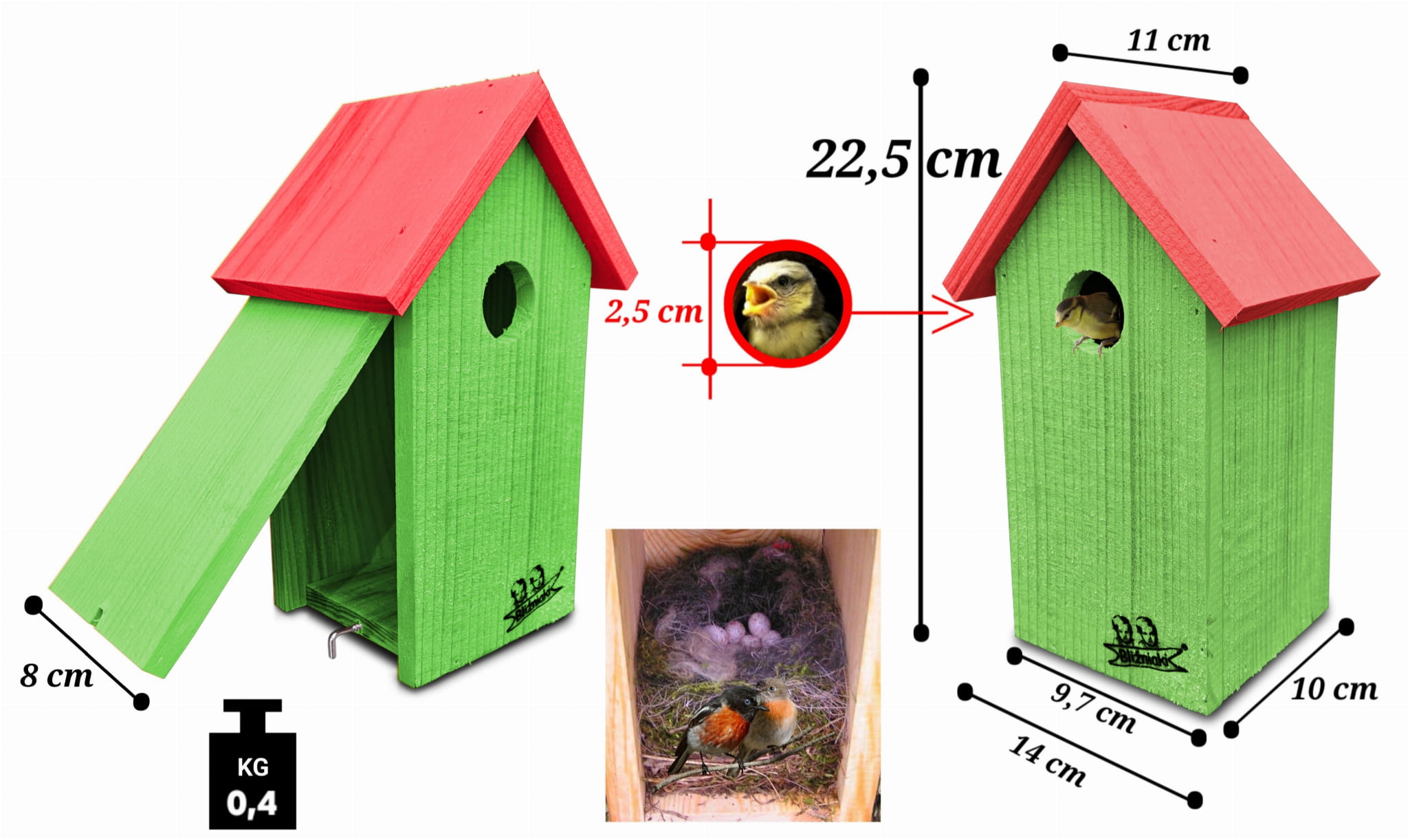 Przestrzeń i wygoda: zaprojektowane specjalnie z myślą o małych ptakach, zapewnią im odpowiednią przestrzeń do swobodnego poruszania się i zakładania gniazd. Skrzynki posiadają wlot o średnicy 25 mm oraz otwieraną boczną ścianę.
