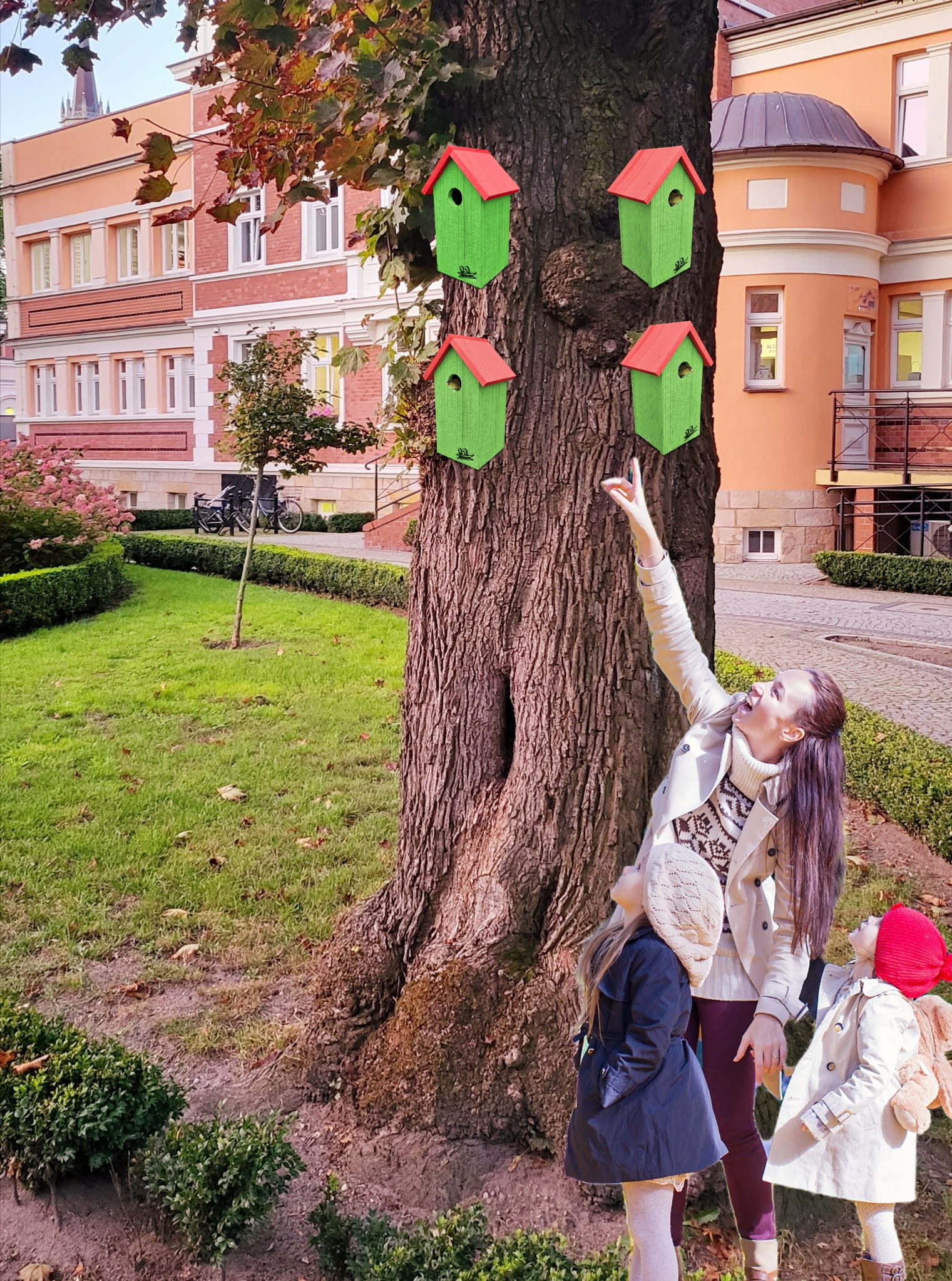 Budki lęgowe, które imitują dziuplę w drzewie warto umieścić w miejscu zacienionym, spokojnym, w odległości ok. 2 m od siebie.