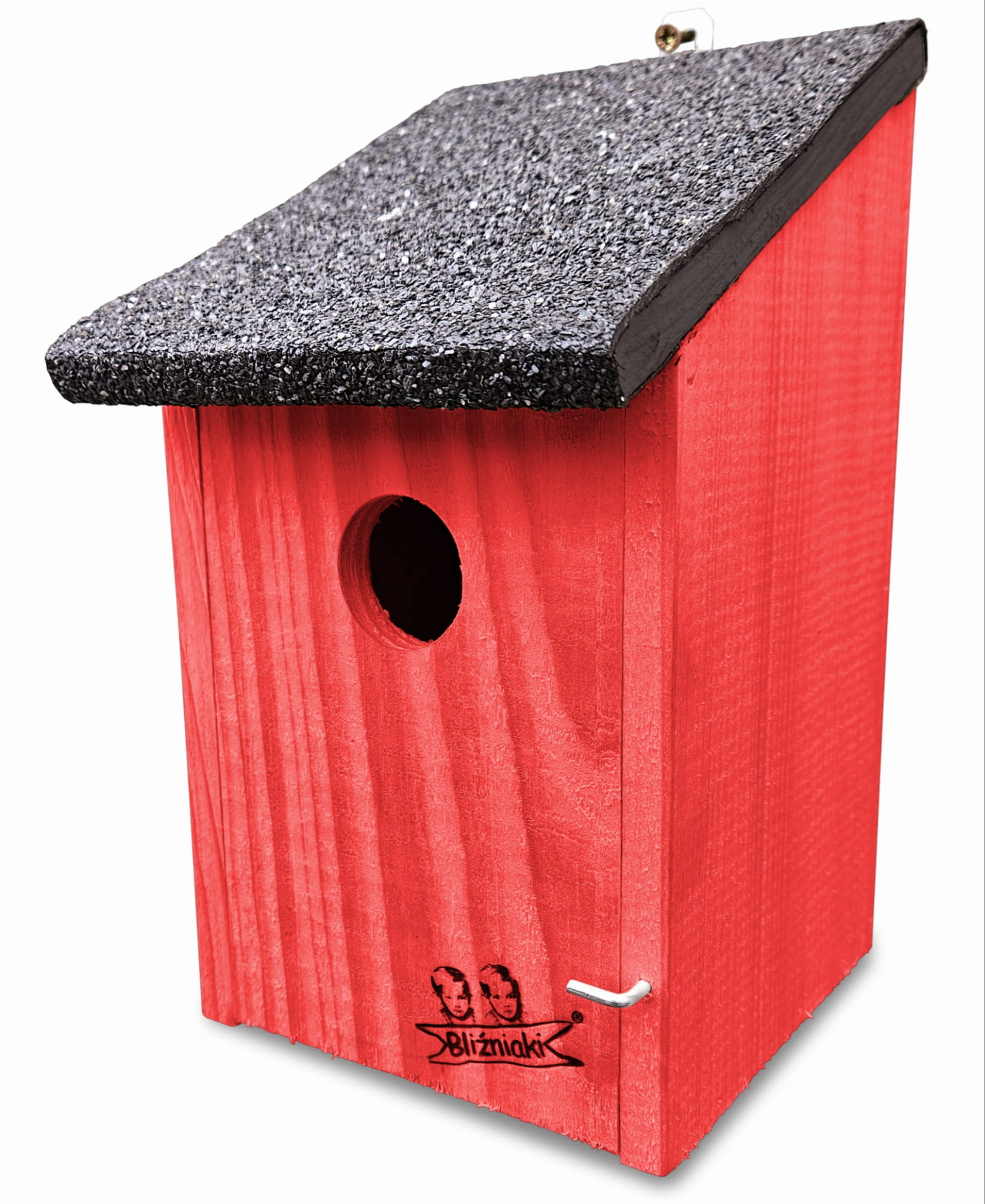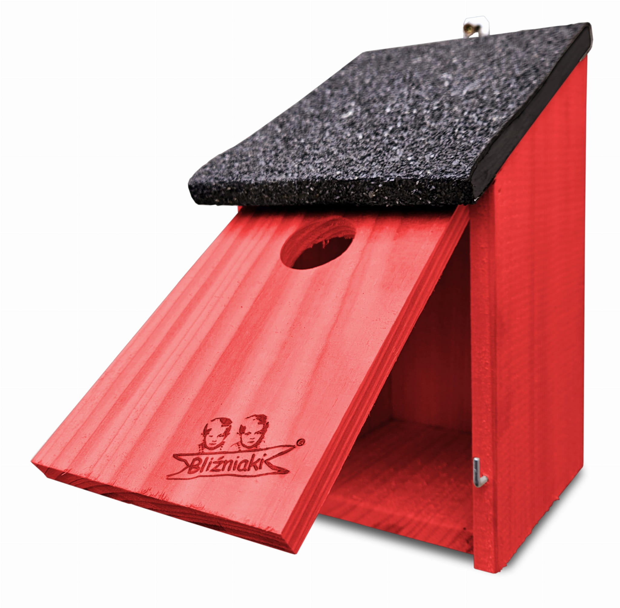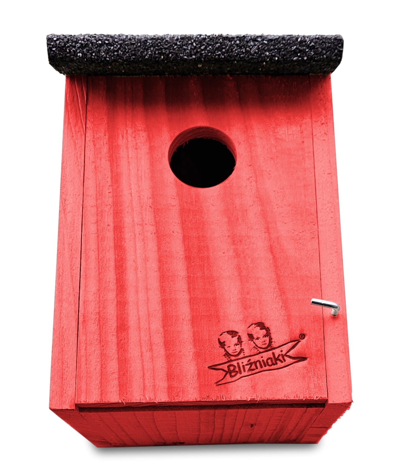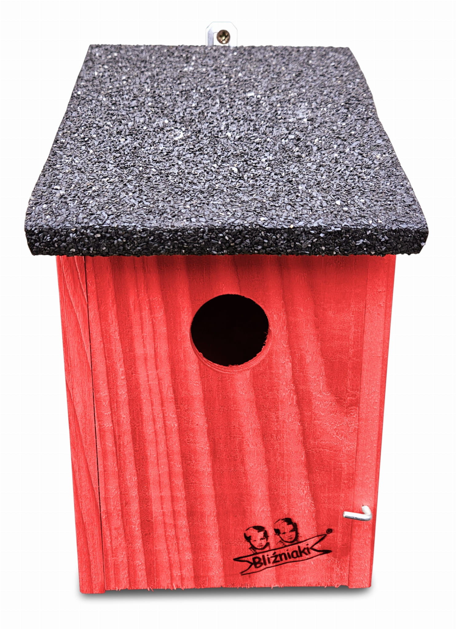 W przeważającej części skrzynka lęgowa jest w kolorze CZERWONYM, dach pokryty jest PAPĄ BITUMICZNĄ w kolorze CZARNYM.