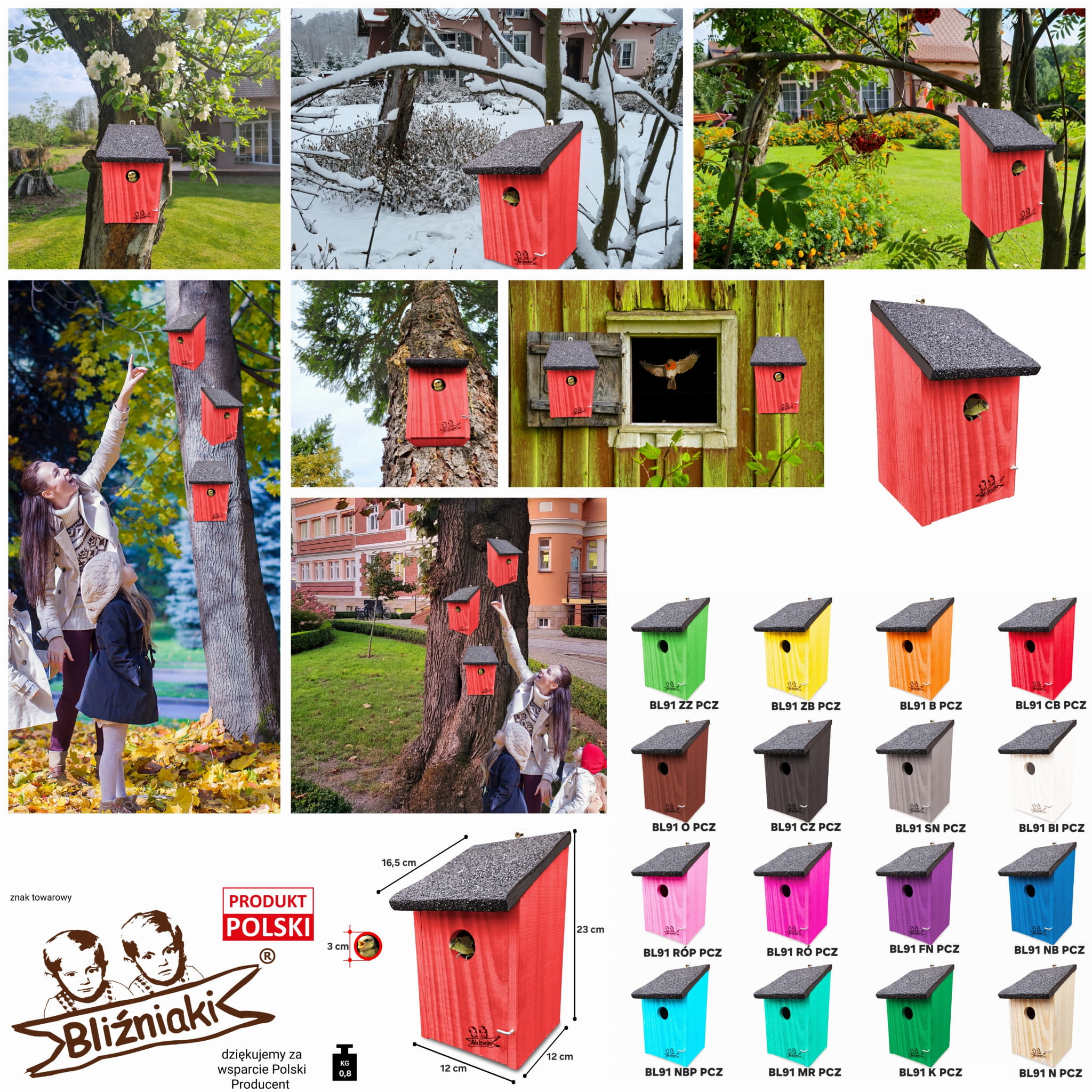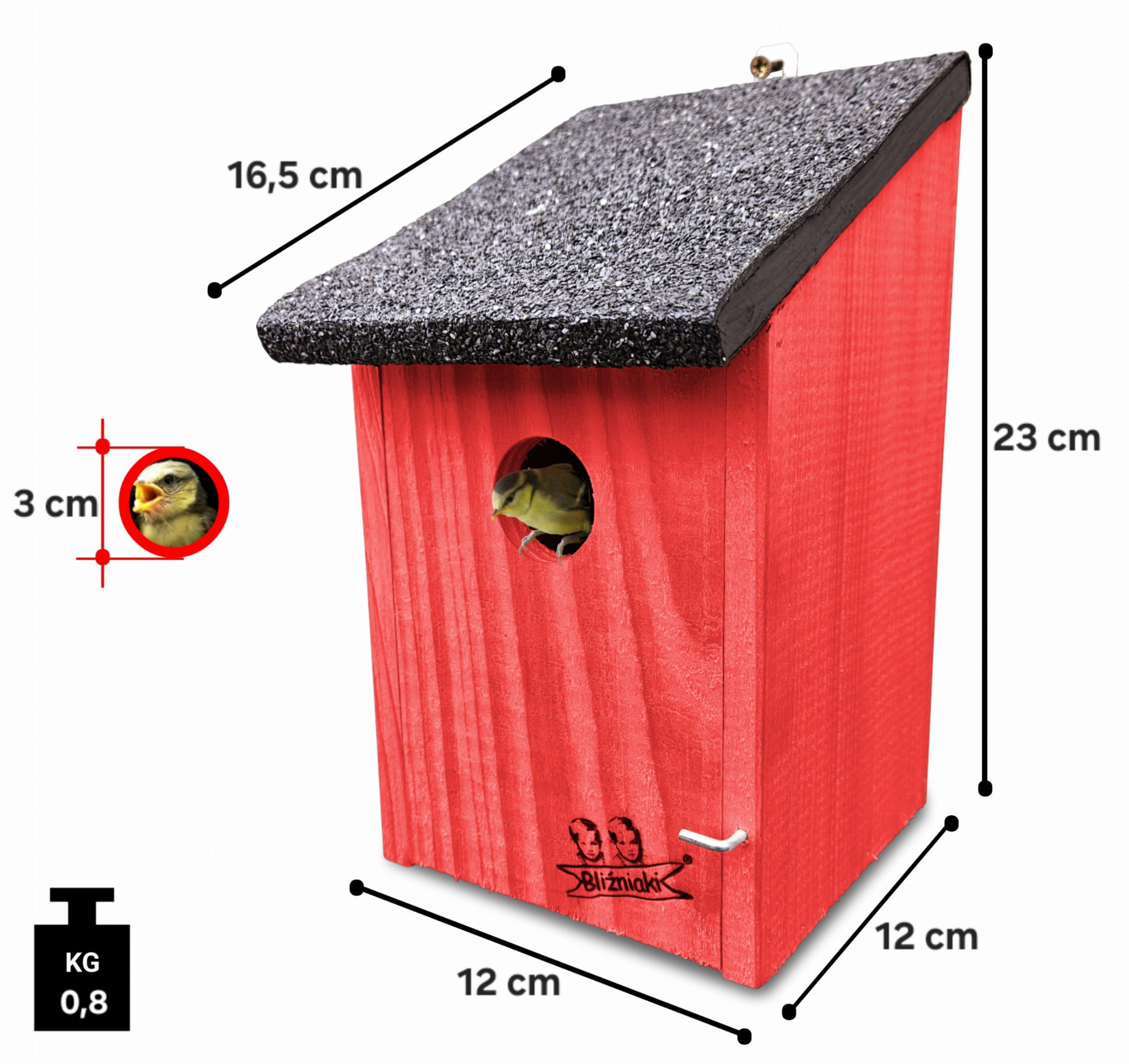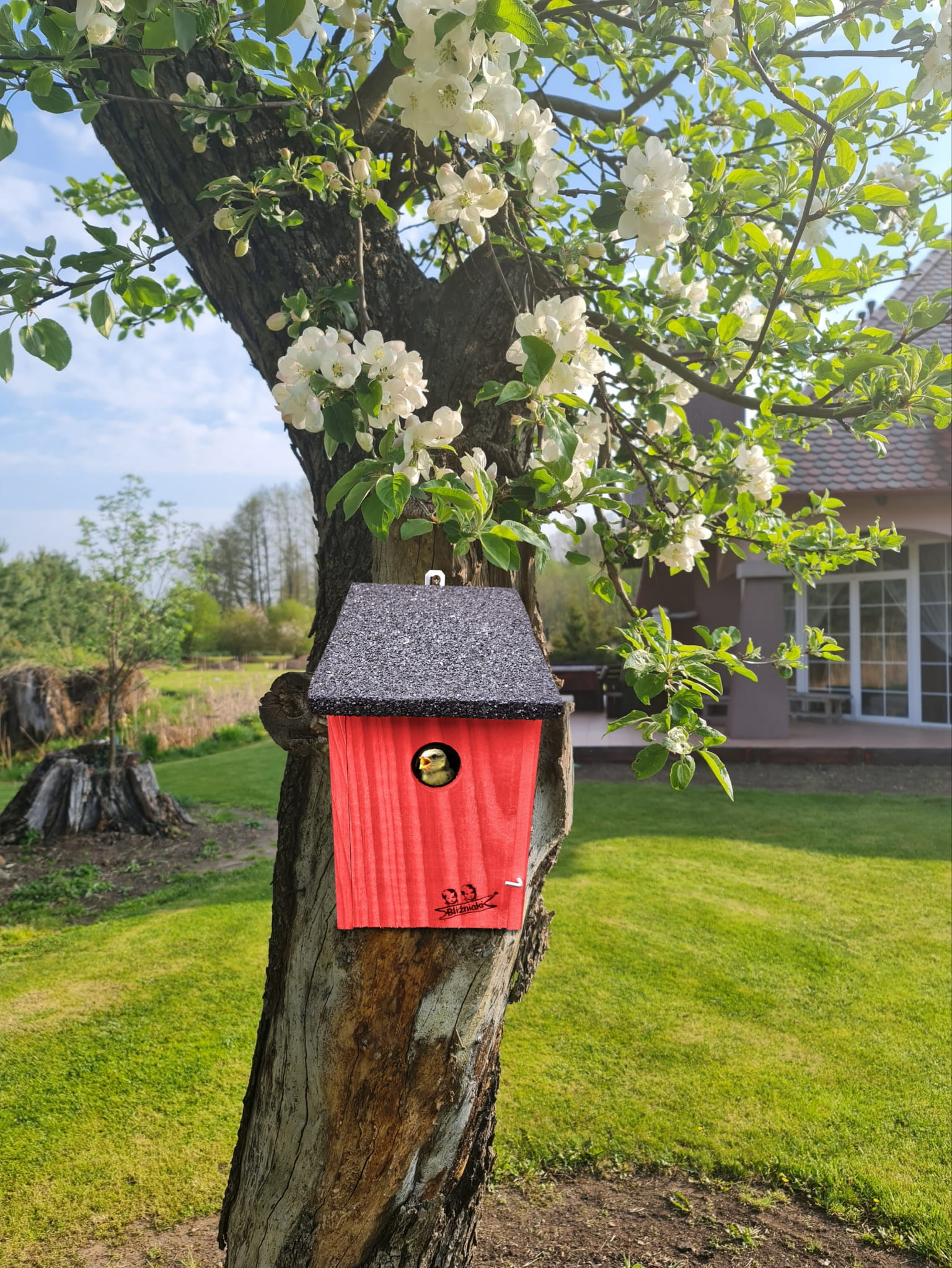 W przeważającej części skrzynka lęgowa jest w kolorze CZERWONYM, dach pokryty jest PAPĄ BITUMICZNĄ w kolorze CZARNYM.