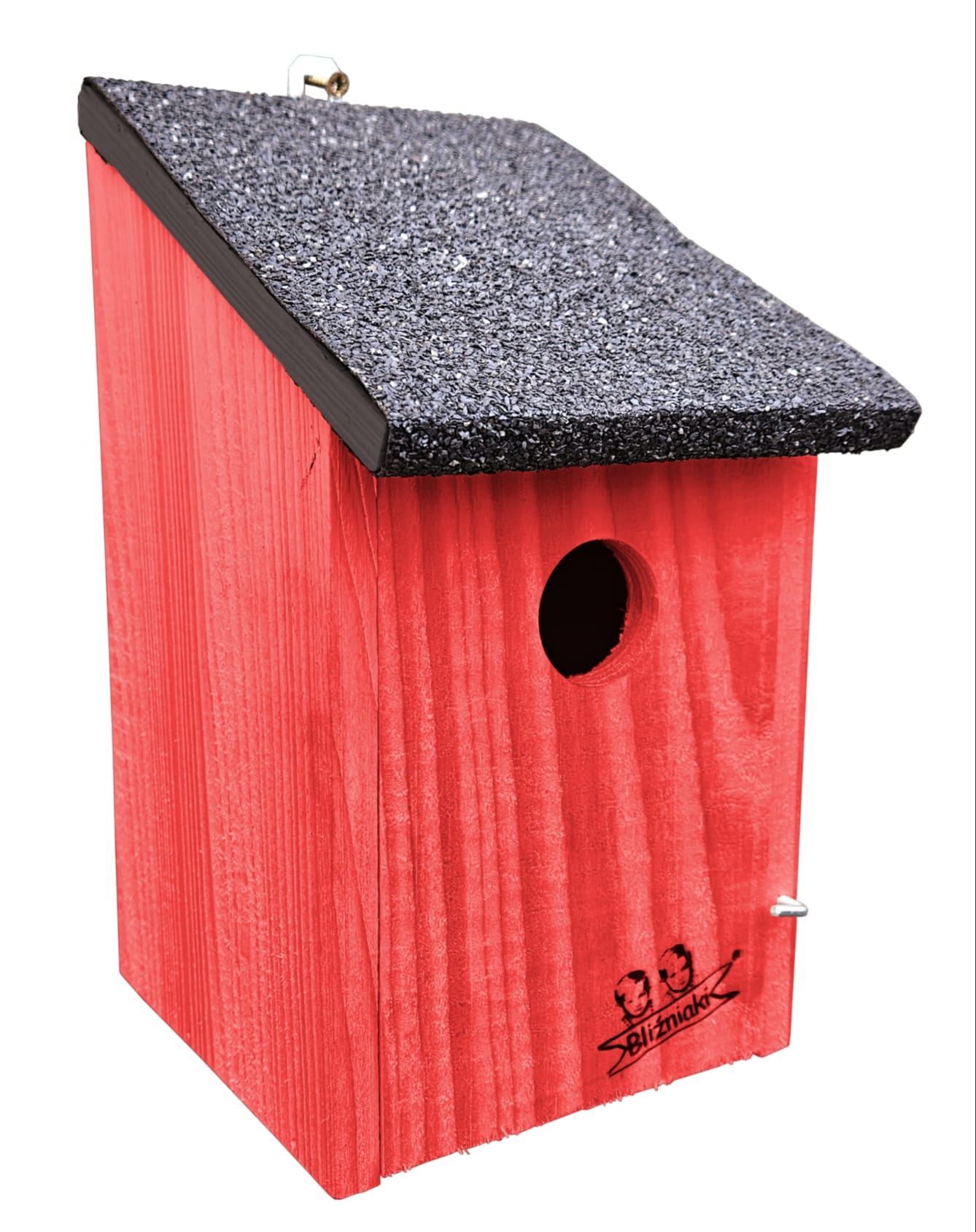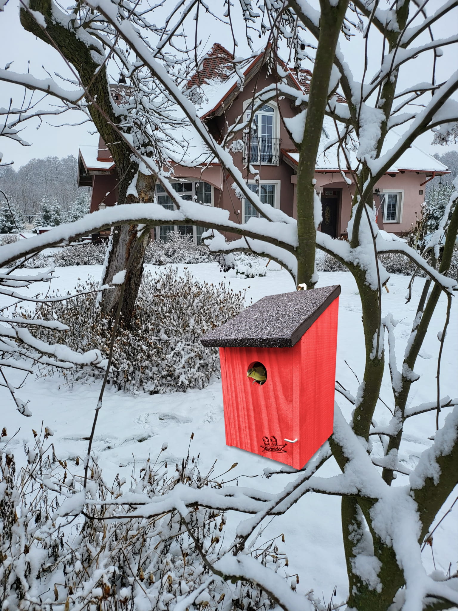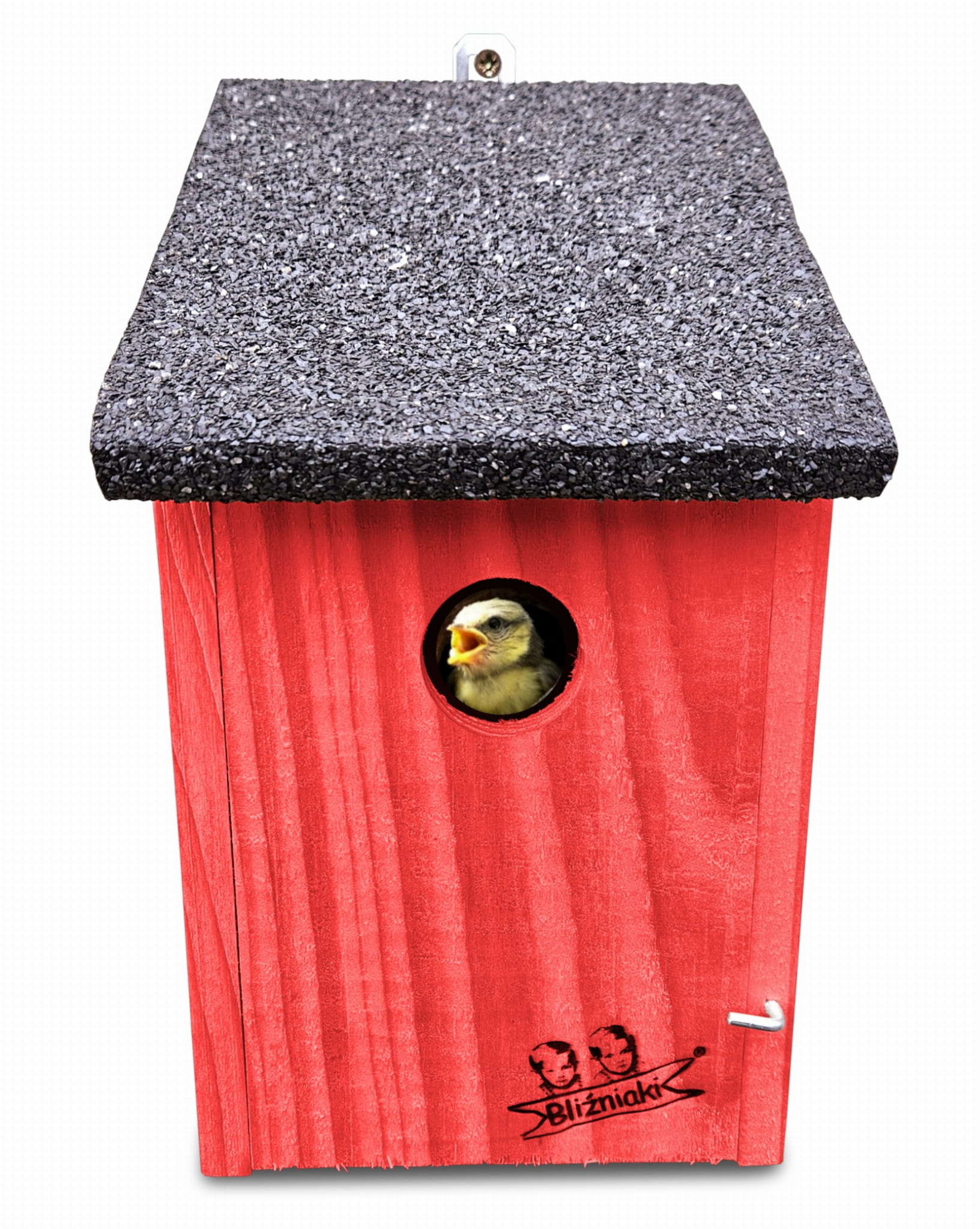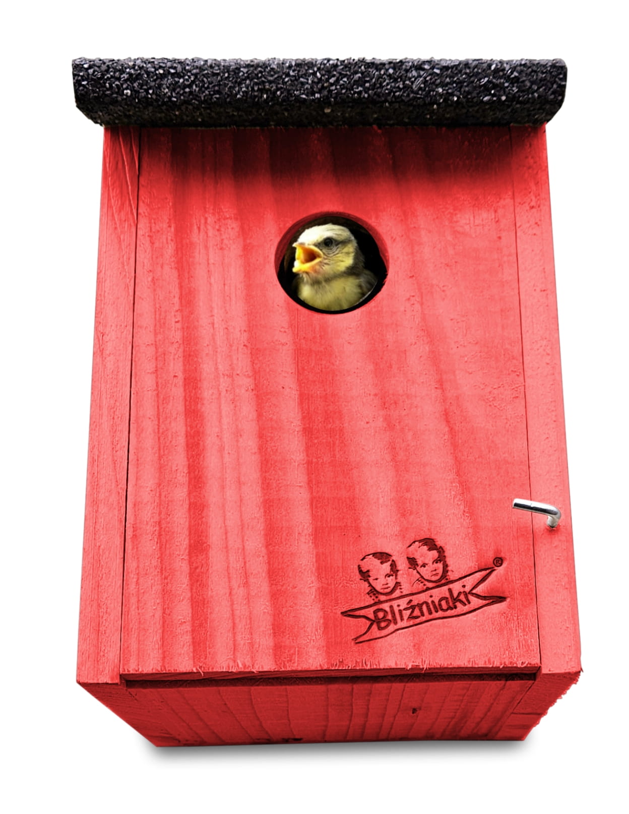 W przeważającej części skrzynka lęgowa jest w kolorze CZERWONYM, dach pokryty jest PAPĄ BITUMICZNĄ w kolorze CZARNYM.