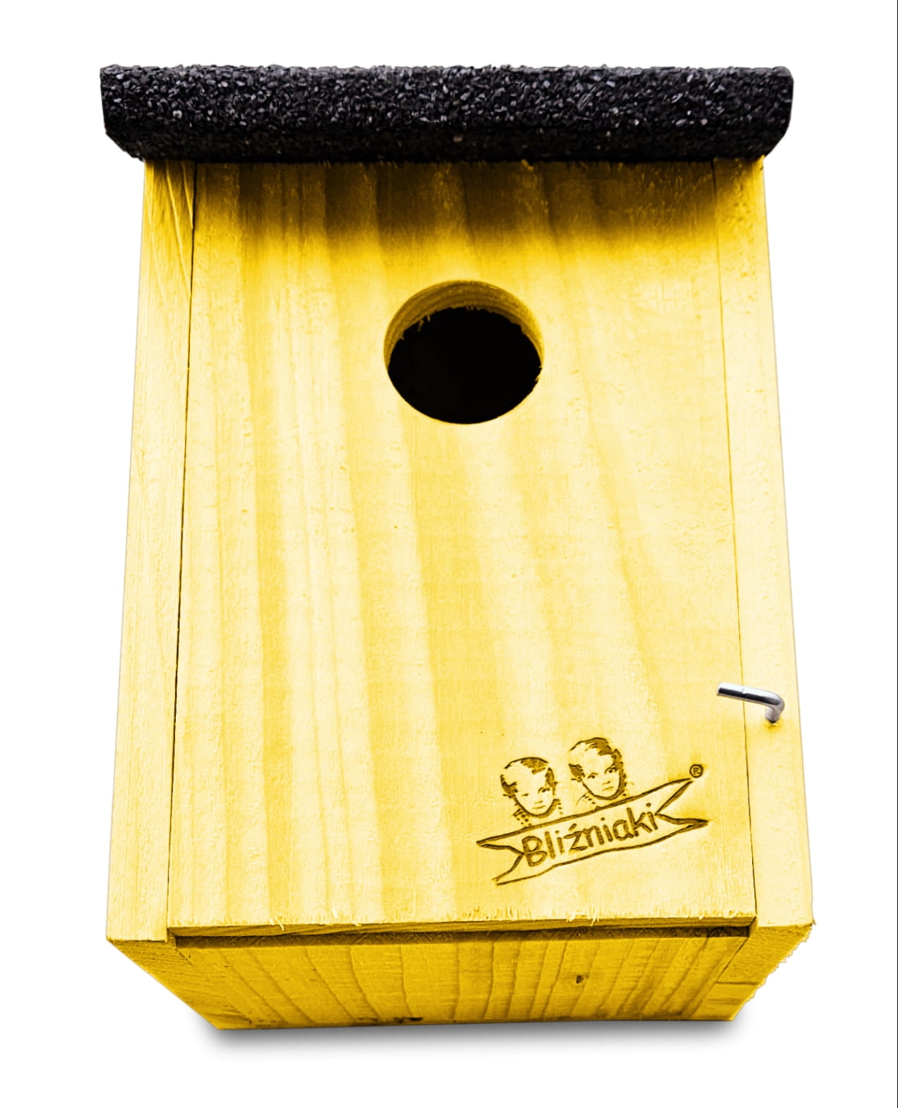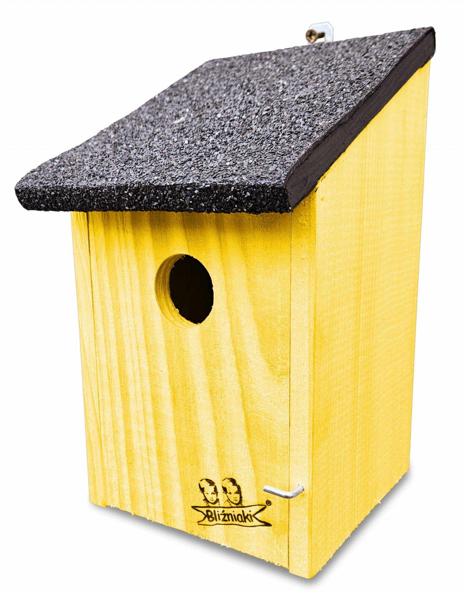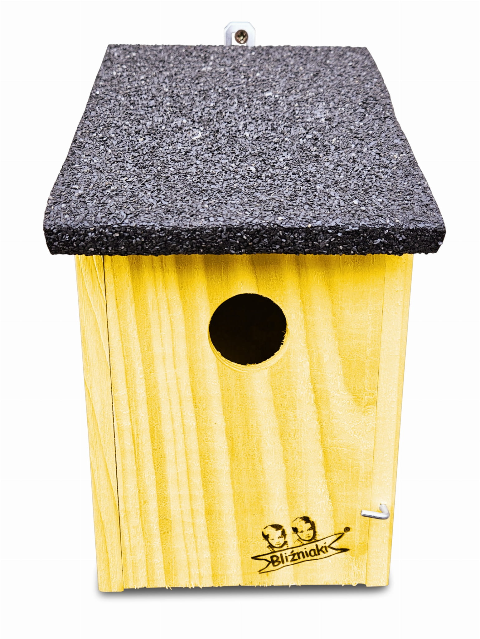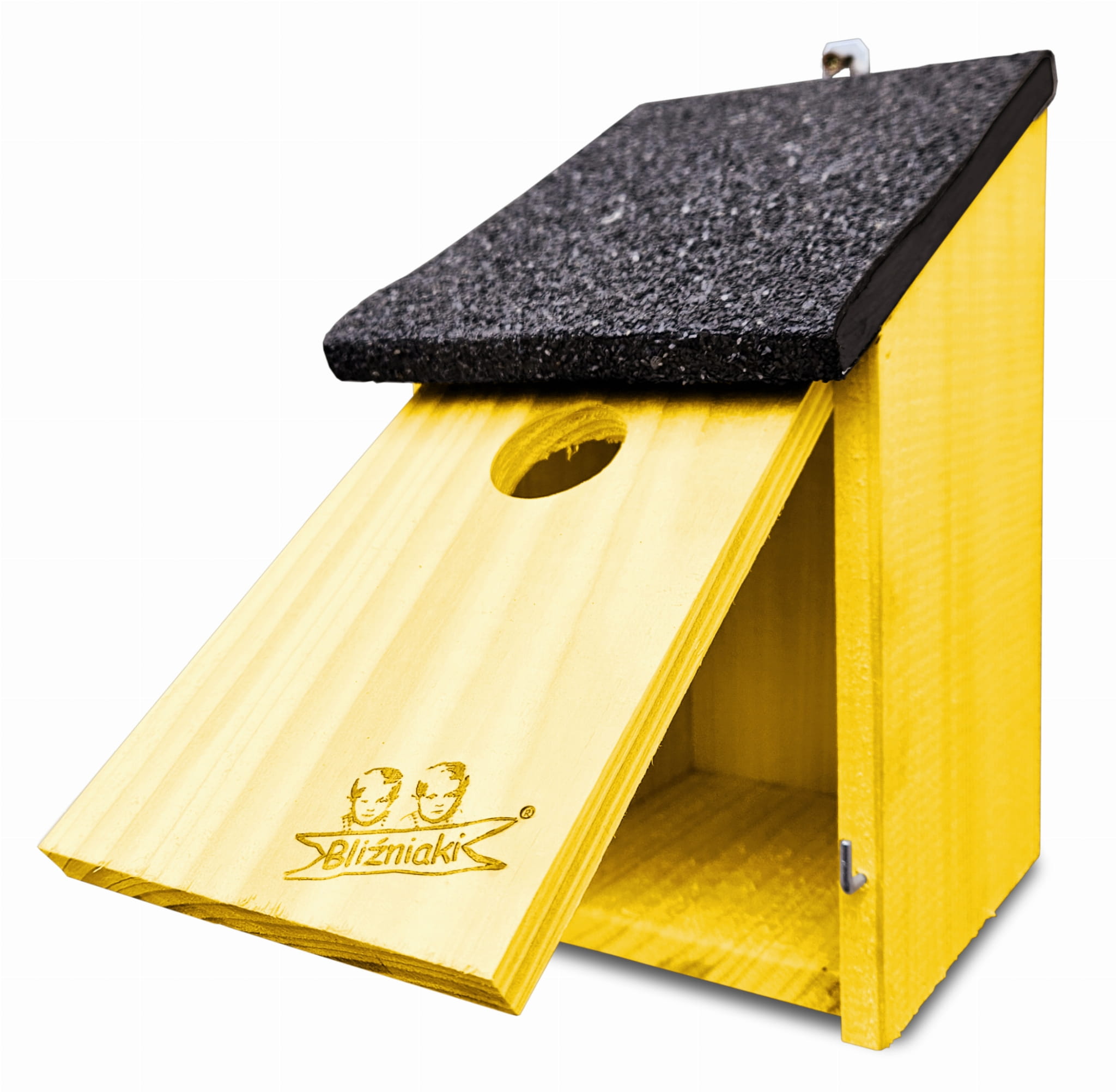W przeważającej części skrzynka lęgowa jest w kolorze ŻÓŁTYM, dach pokryty jest PAPĄ BITUMICZNĄ w kolorze CZARNYM.