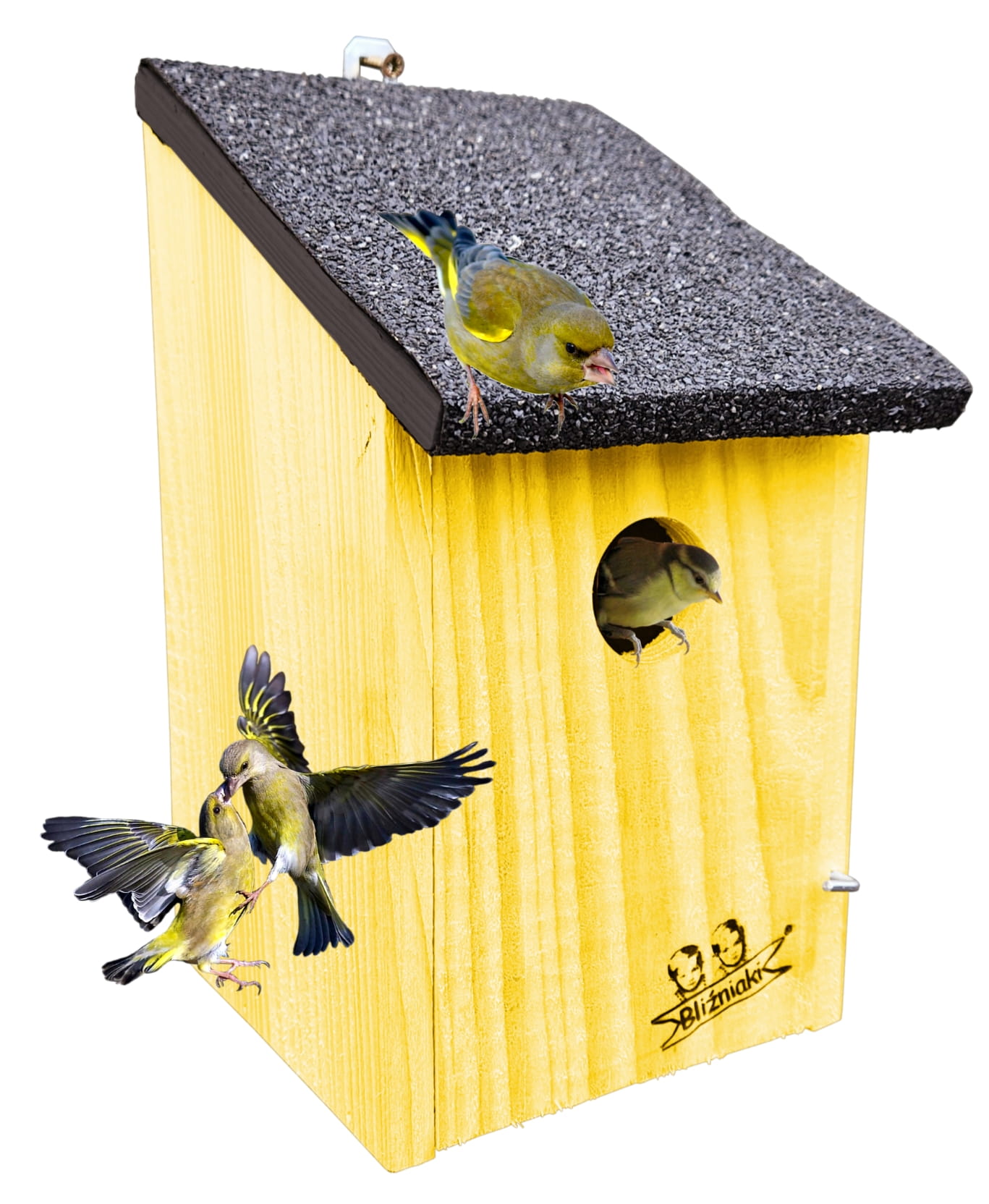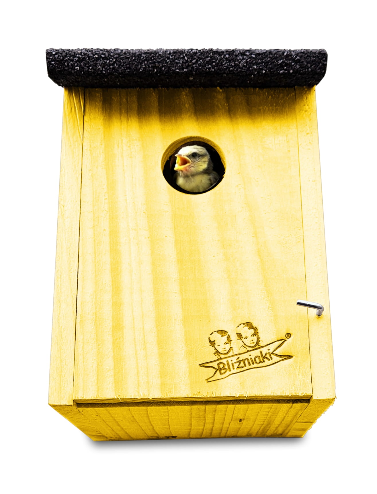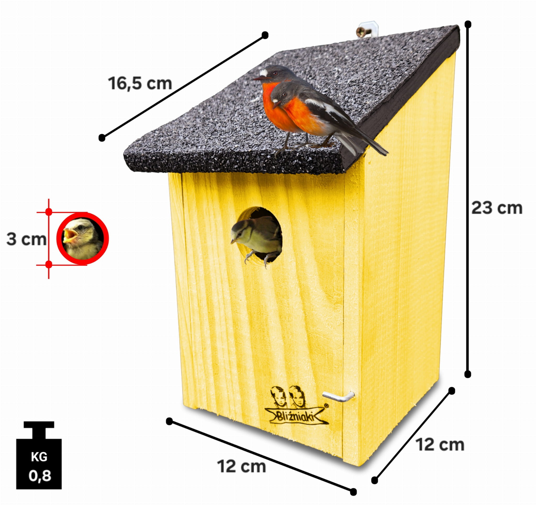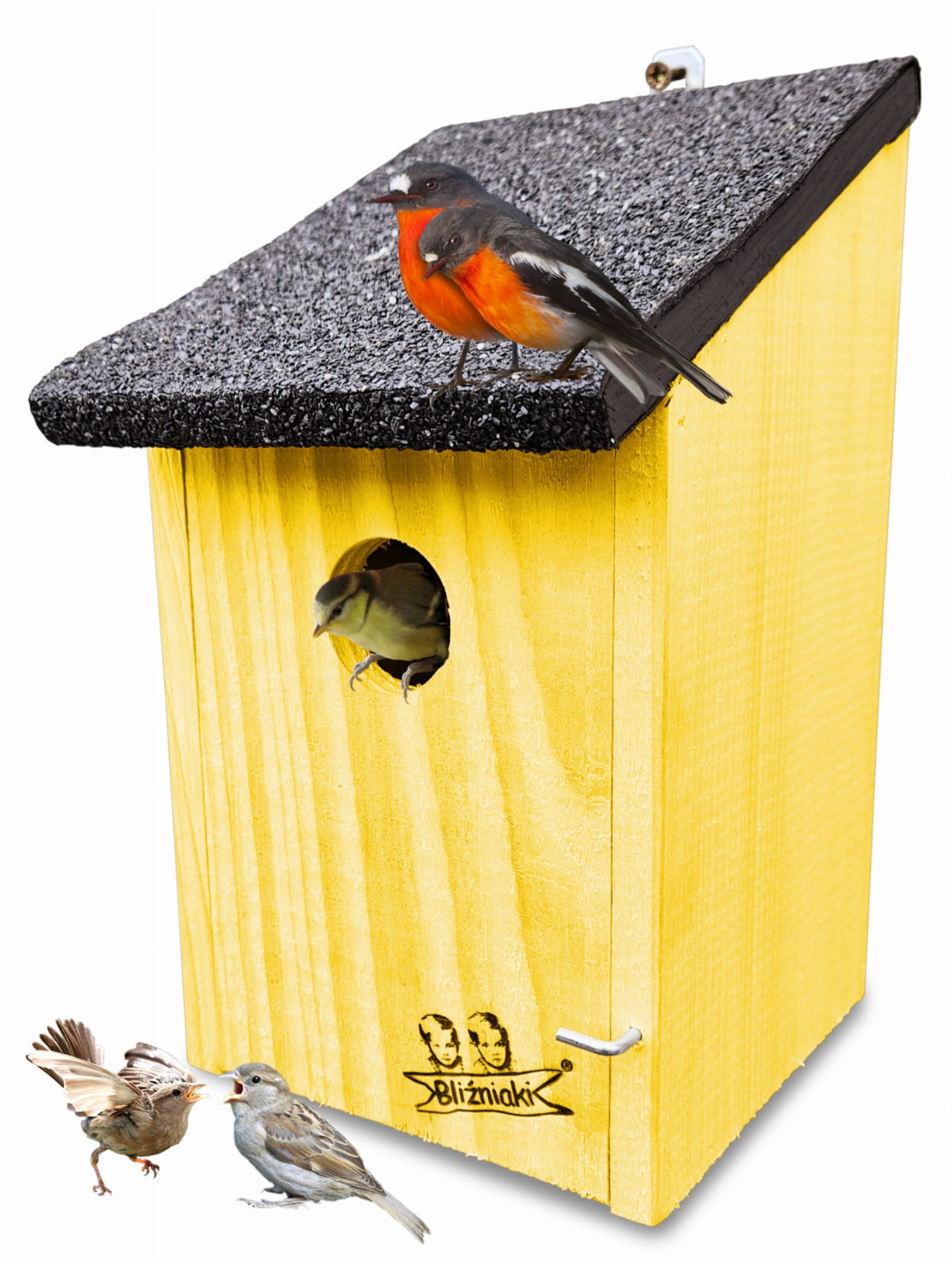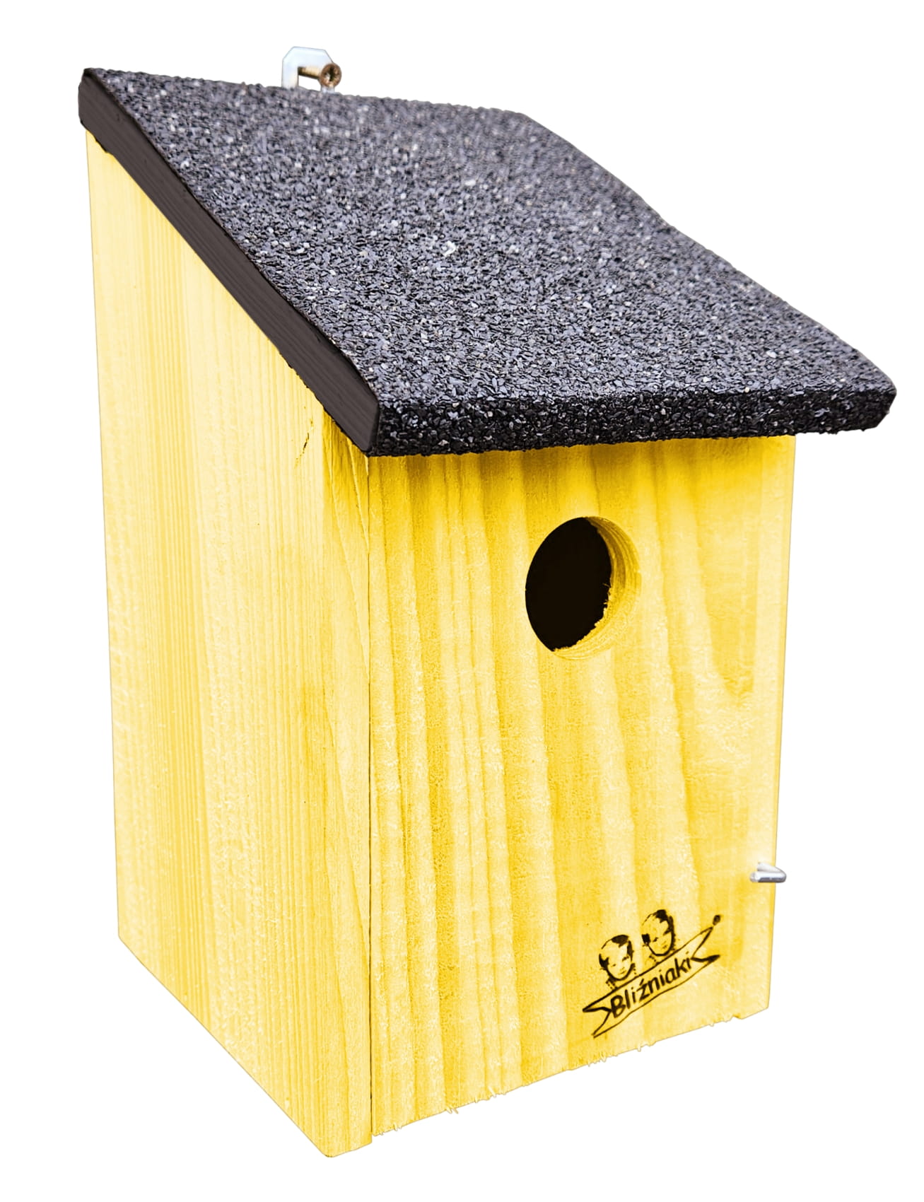 W przeważającej części skrzynka lęgowa jest w kolorze ŻÓŁTYM, dach pokryty jest PAPĄ BITUMICZNĄ w kolorze CZARNYM.