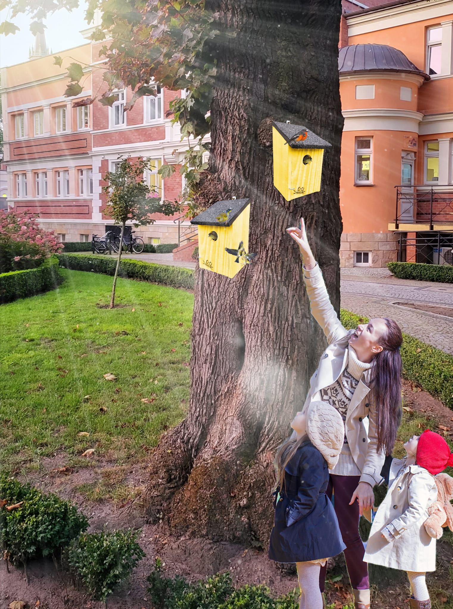 Budki lęgowe, które imitują dziuplę w drzewie warto umieścić w miejscu zacienionym, spokojnym, w odległości ok. 2 m od siebie.