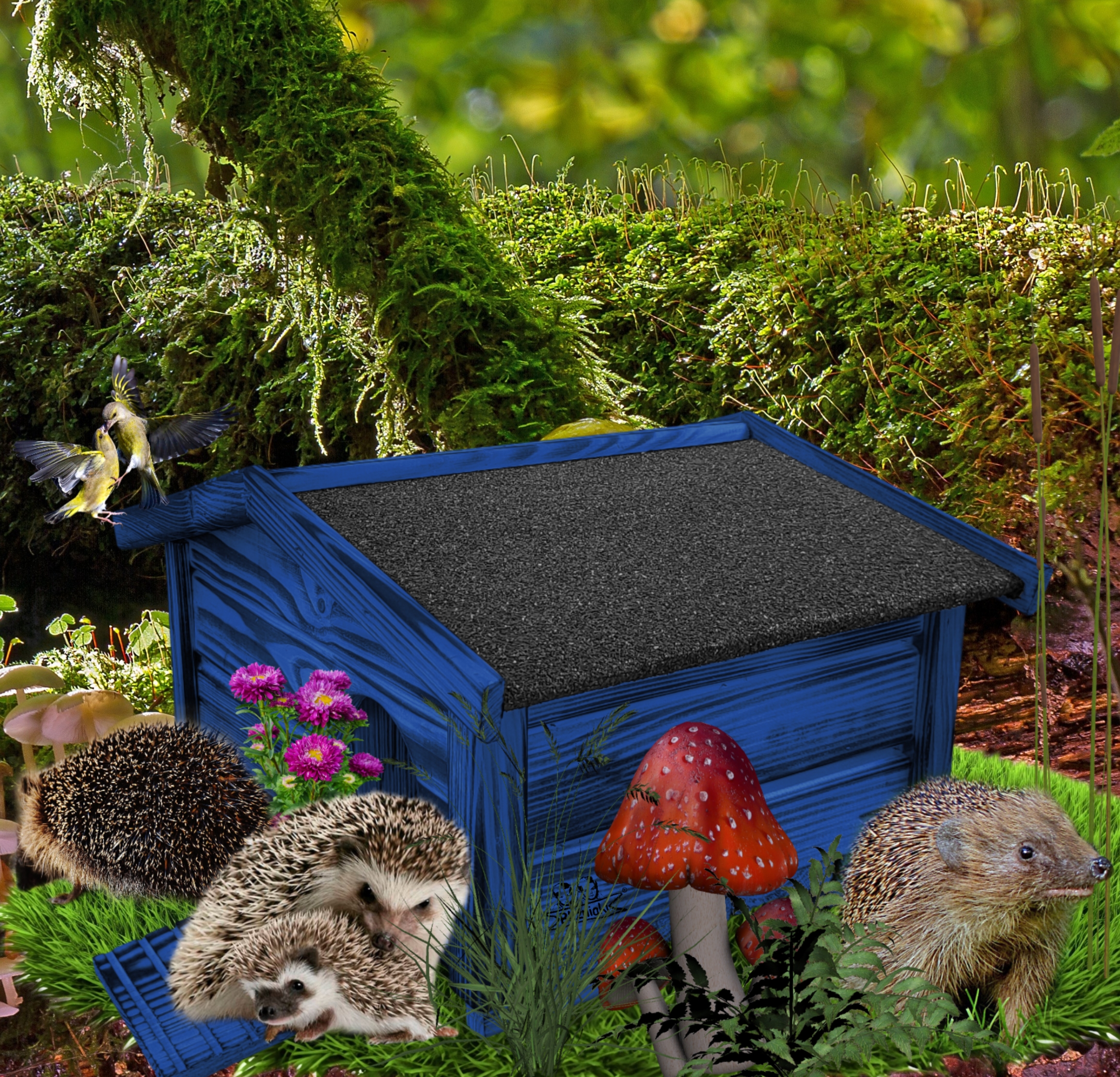 Domek zapewni bezpieczeństwo dorosłym oraz małym jeżom przed drapieżnikami oraz ochroni budowane gniazdo przed wyniesieniem siana.