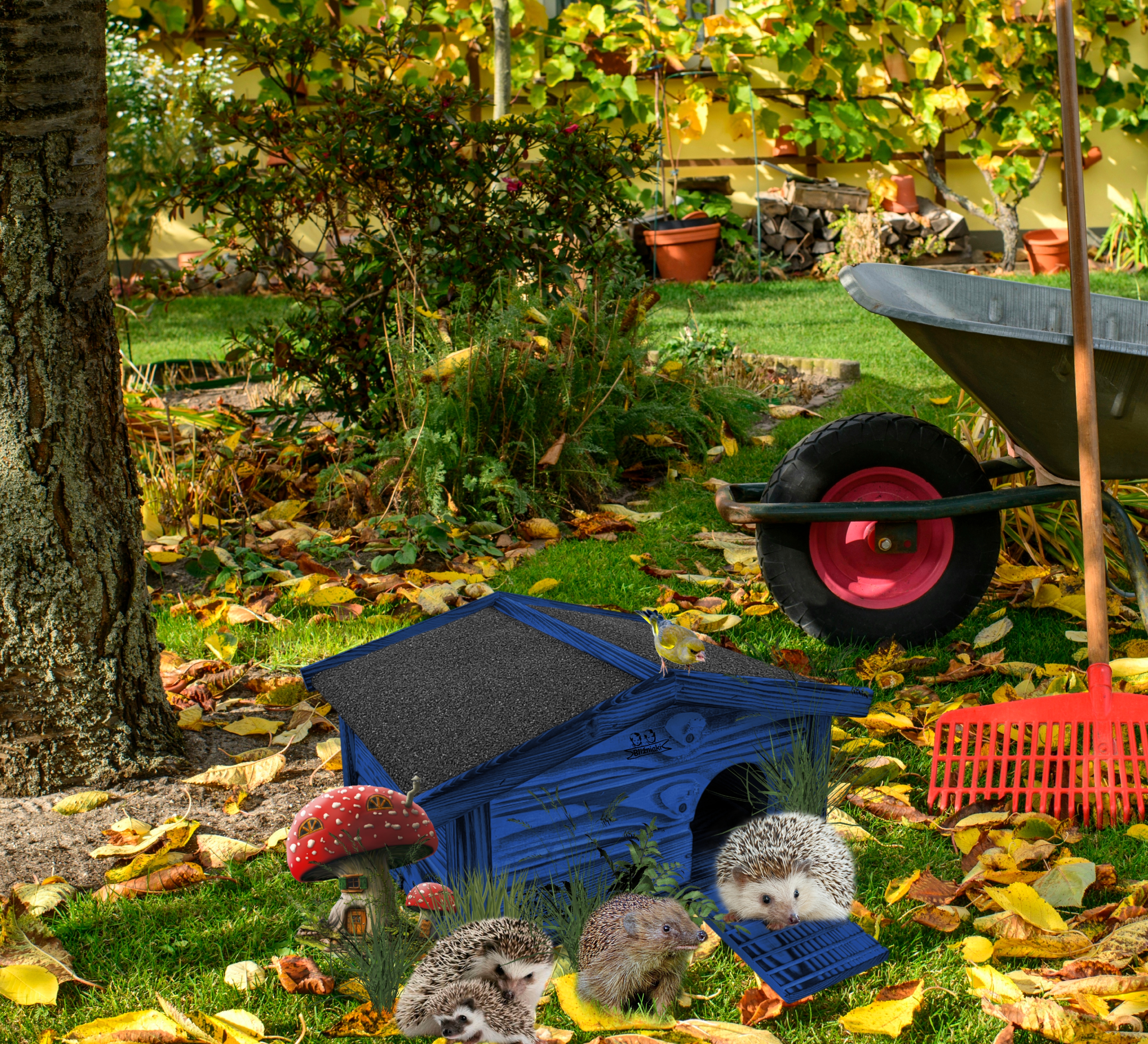 - domek dla jeża stanowi również dekoracyjny element malej architektury ogrodowej