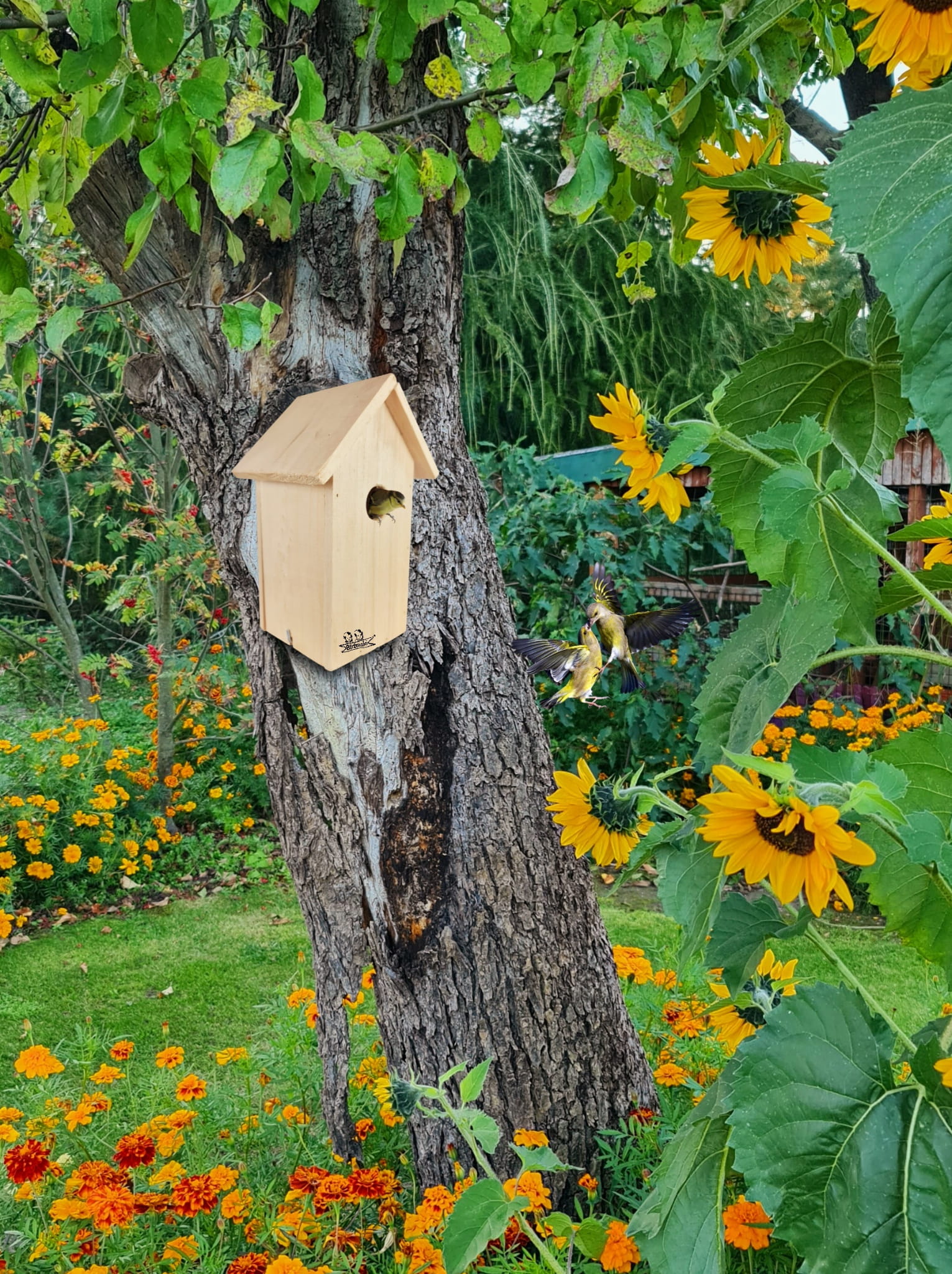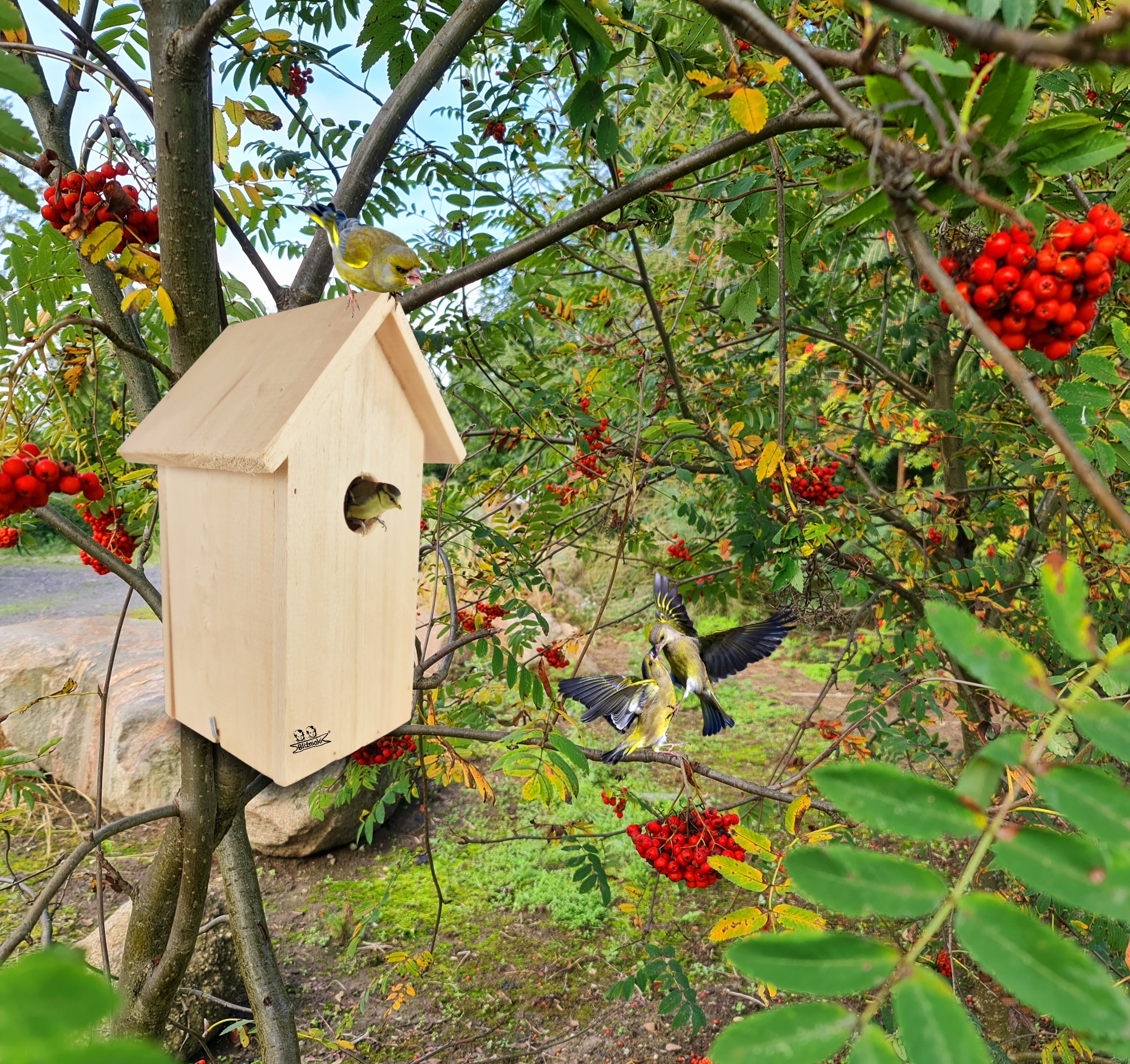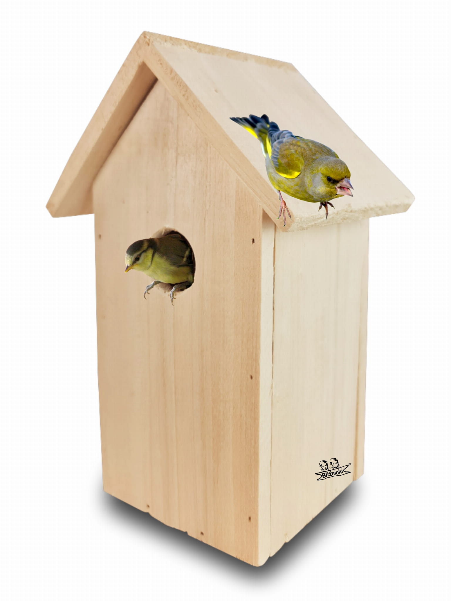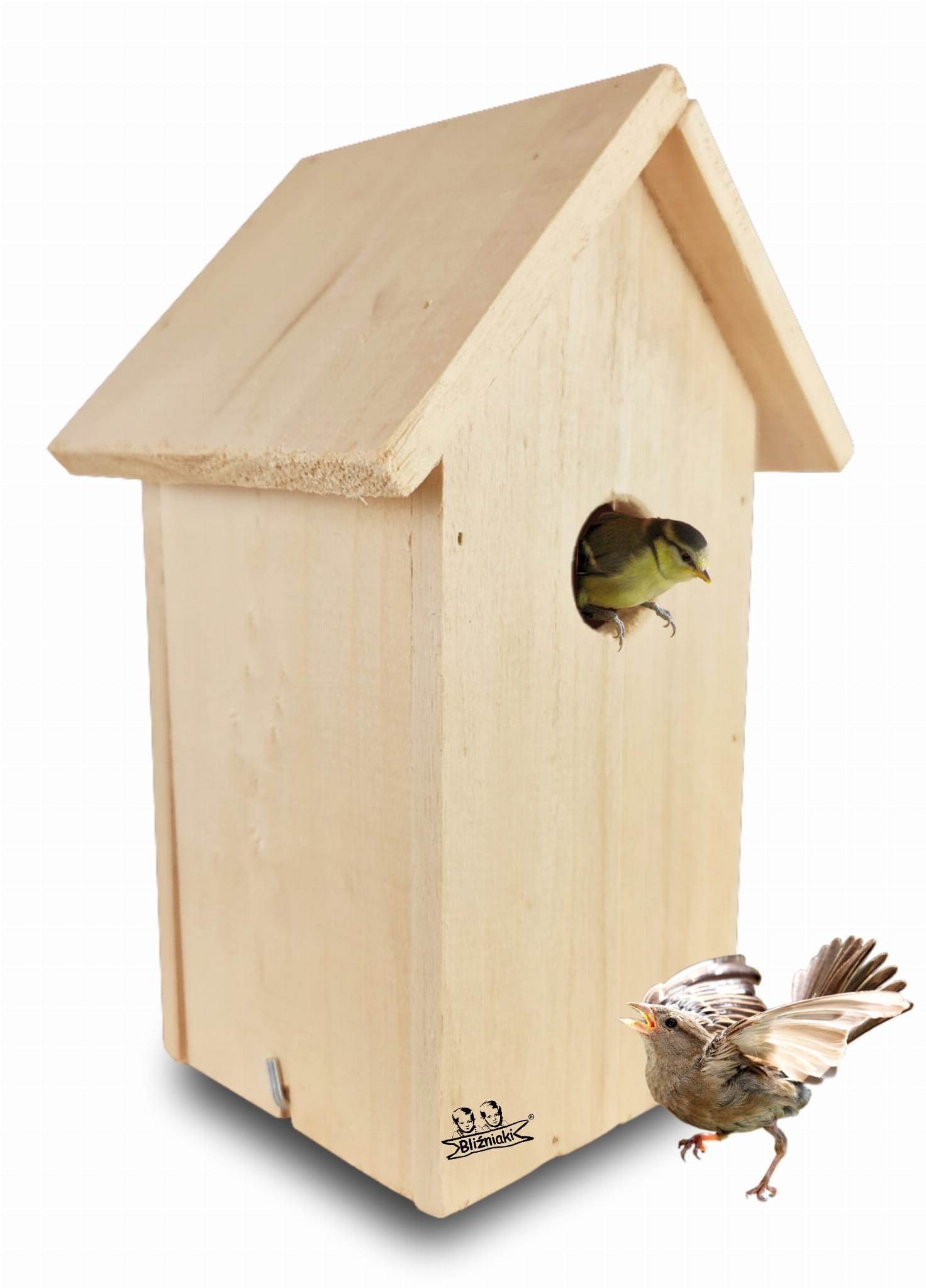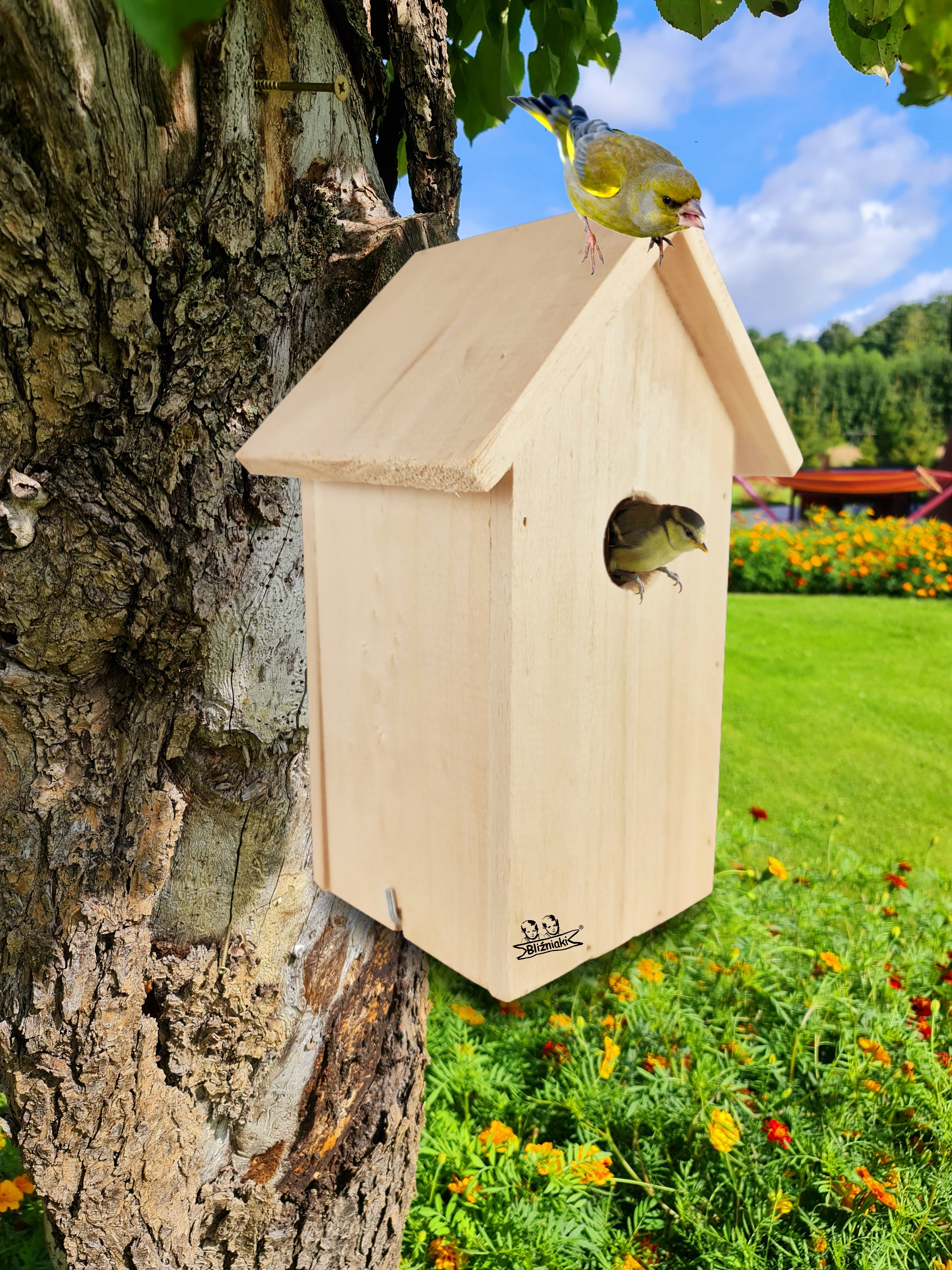 - Budki lęgowe w kolorze naturalnego drewna