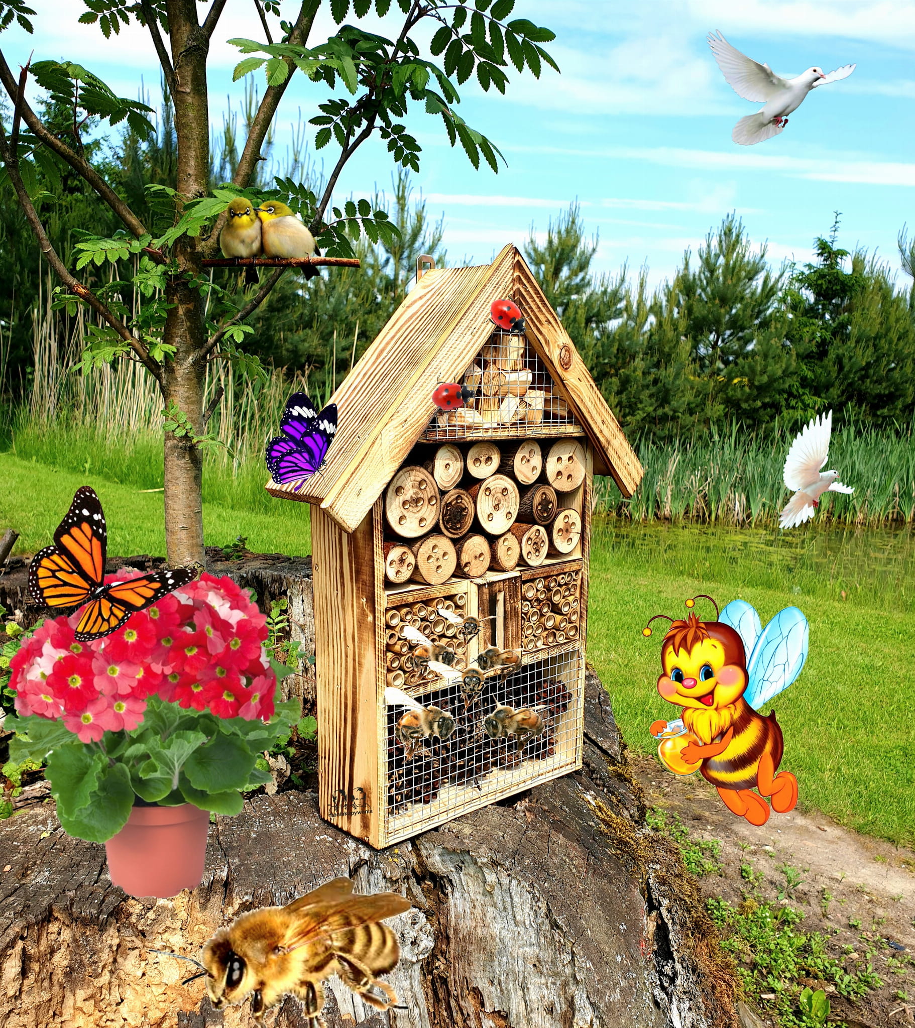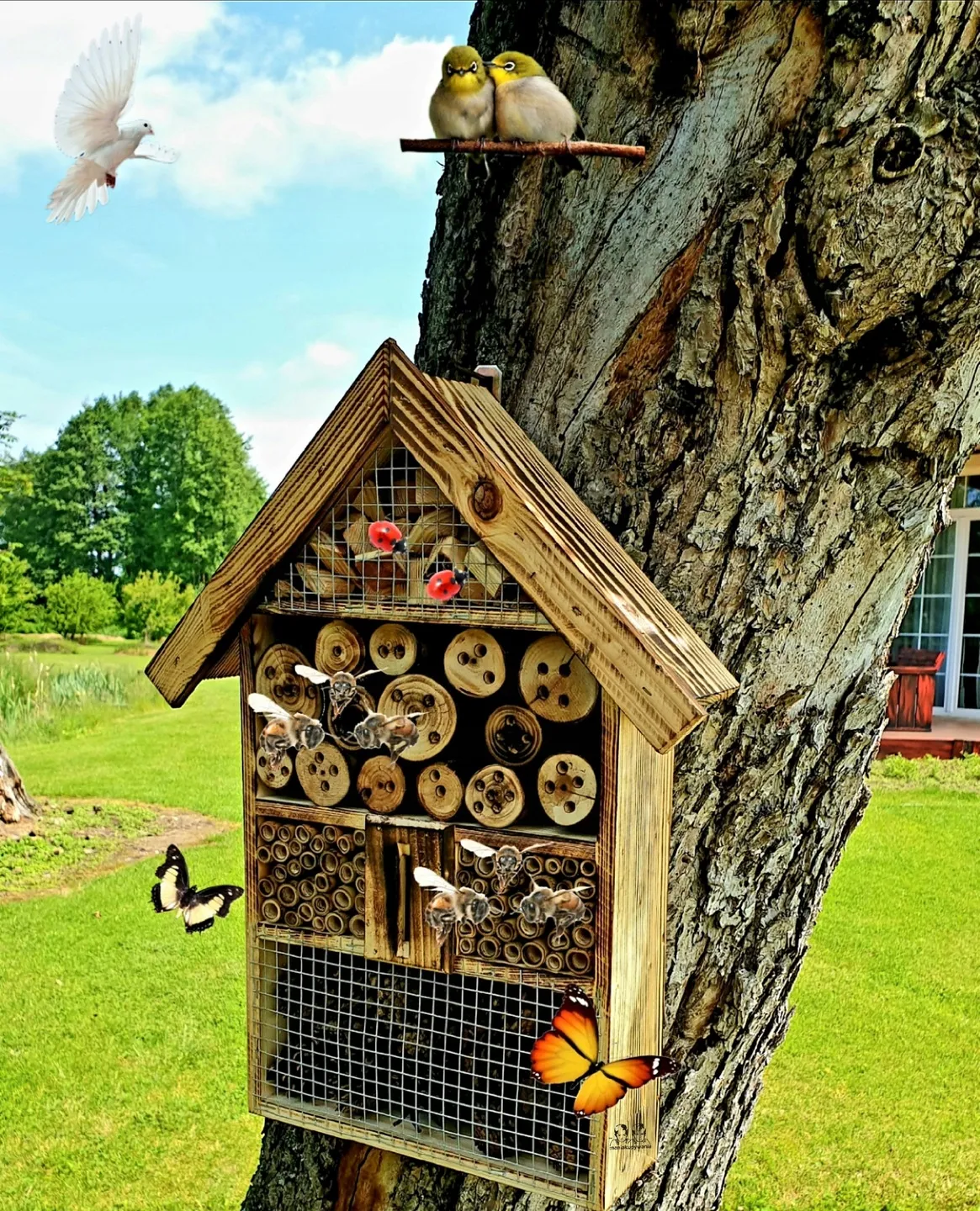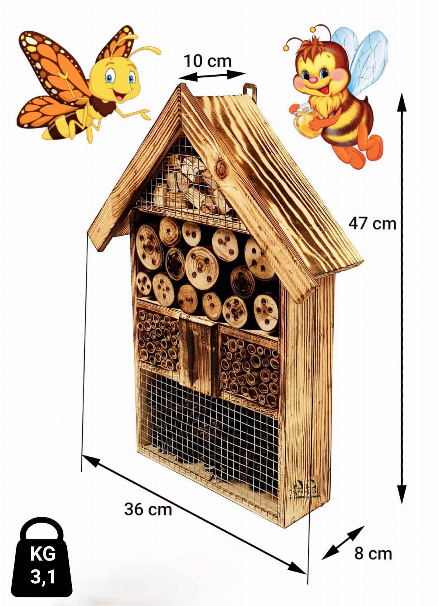 Pożyteczne owady, takie jak pszczoły murarki, biedronki, pszczoły porobnice włochatki, owady z rodziny złotookowatych, motyle, ważki, chrząszcze, błonkówki, bzygi i inne znajdują w nim idealne warunki do składania jaj, budowy gniazd i przetrwania zimy. W ten sposób domek wspomaga naturalne procesy zapylania roślin, zwalczania szkodników i utrzymania równowagi ekosystemu.
