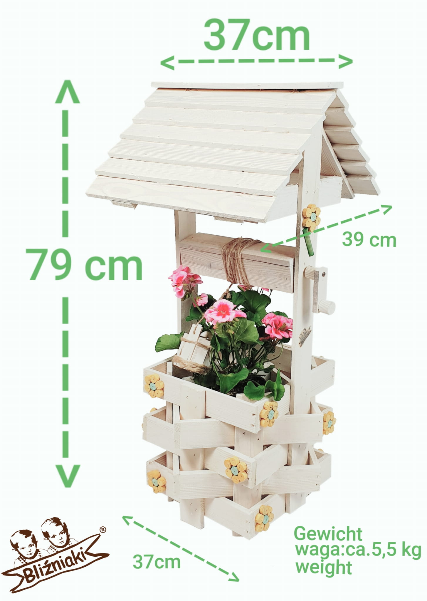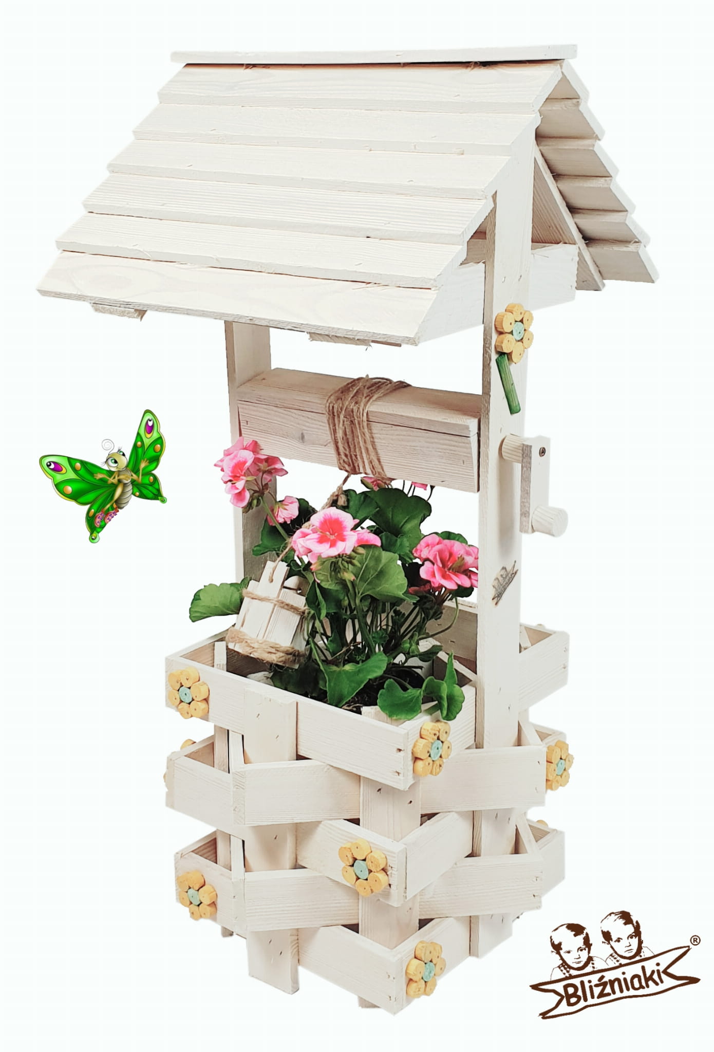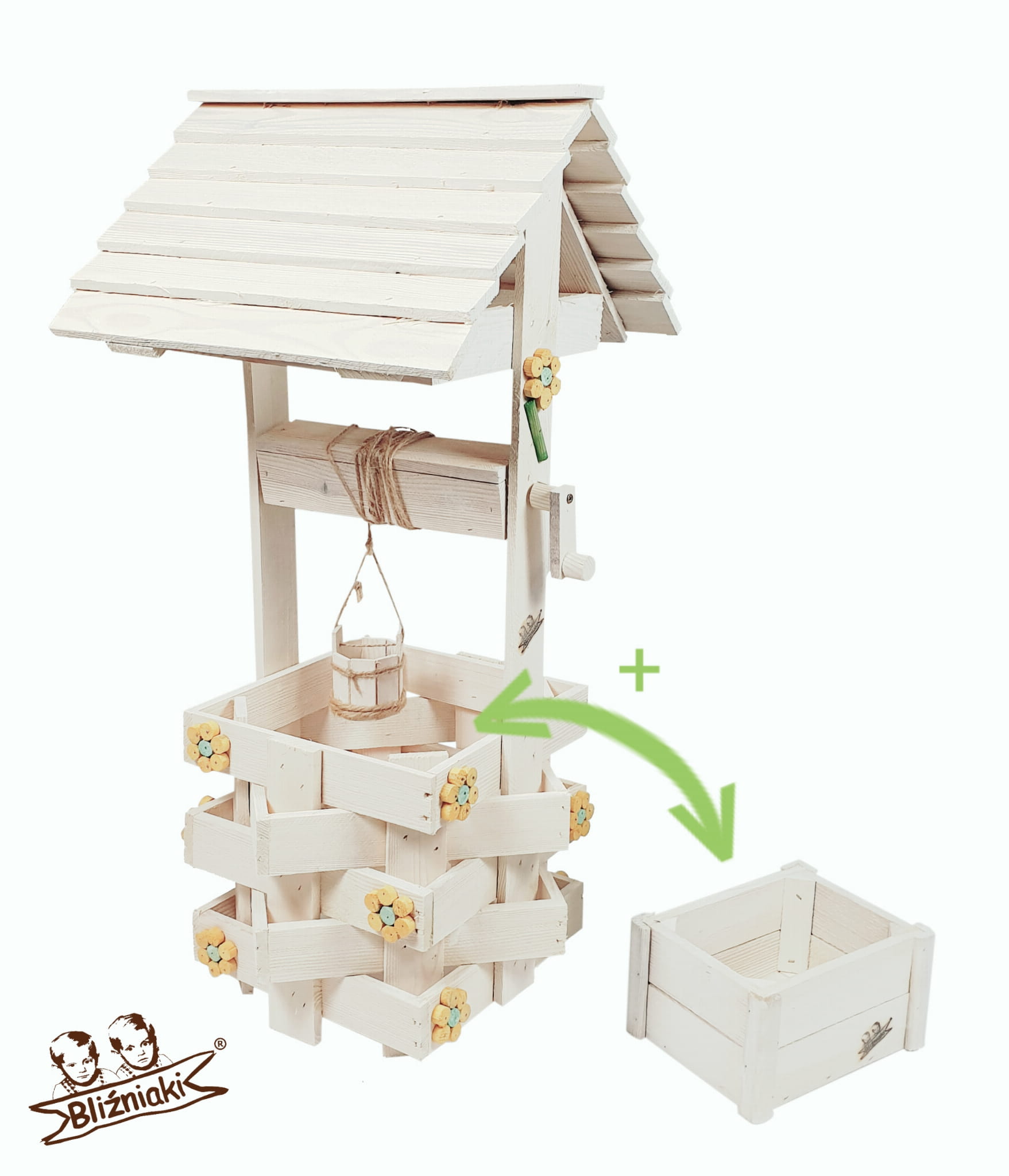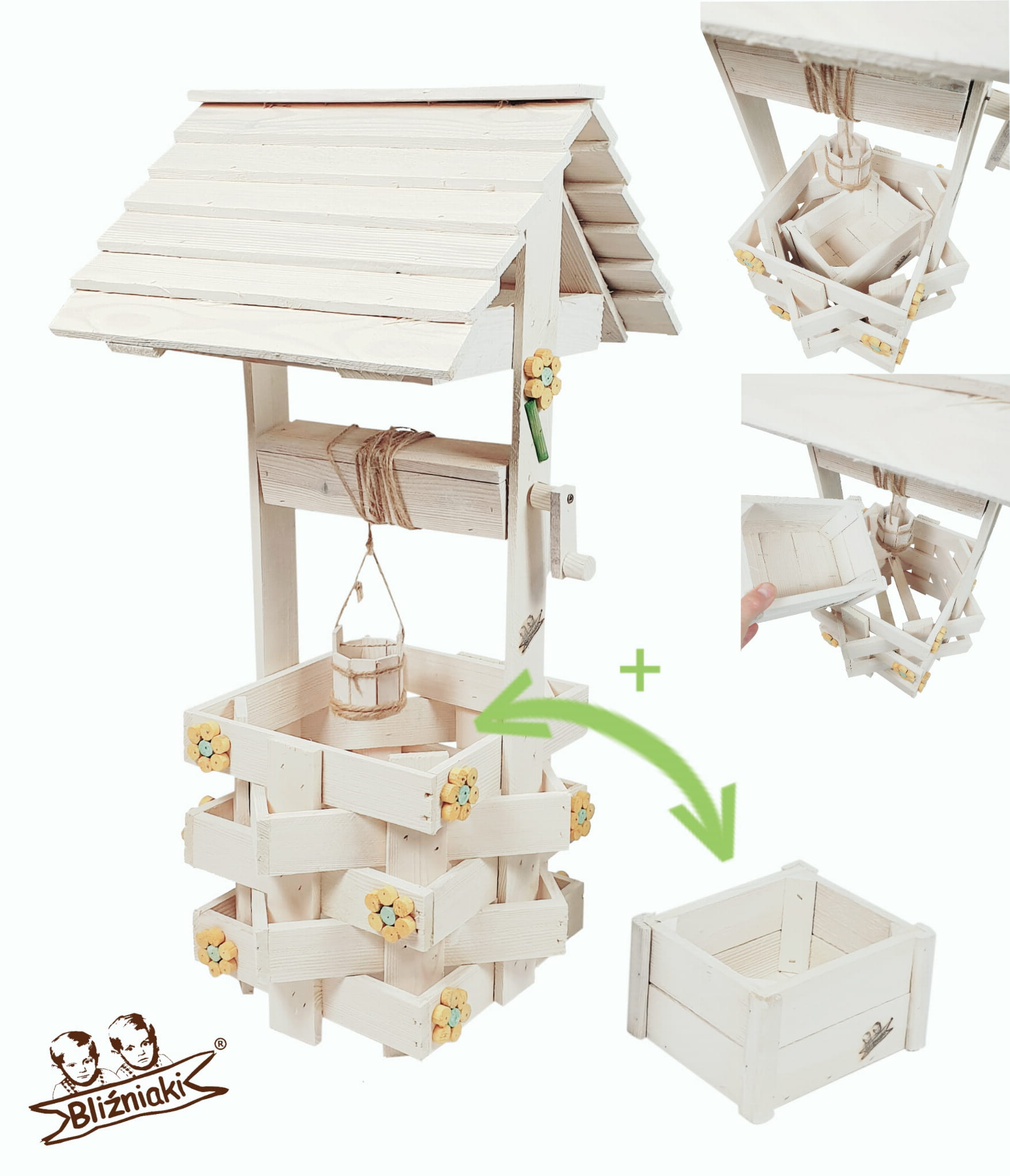 - W zestawie znajduje się dodatkowo ozdobne wiaderko z kołowrotkiem