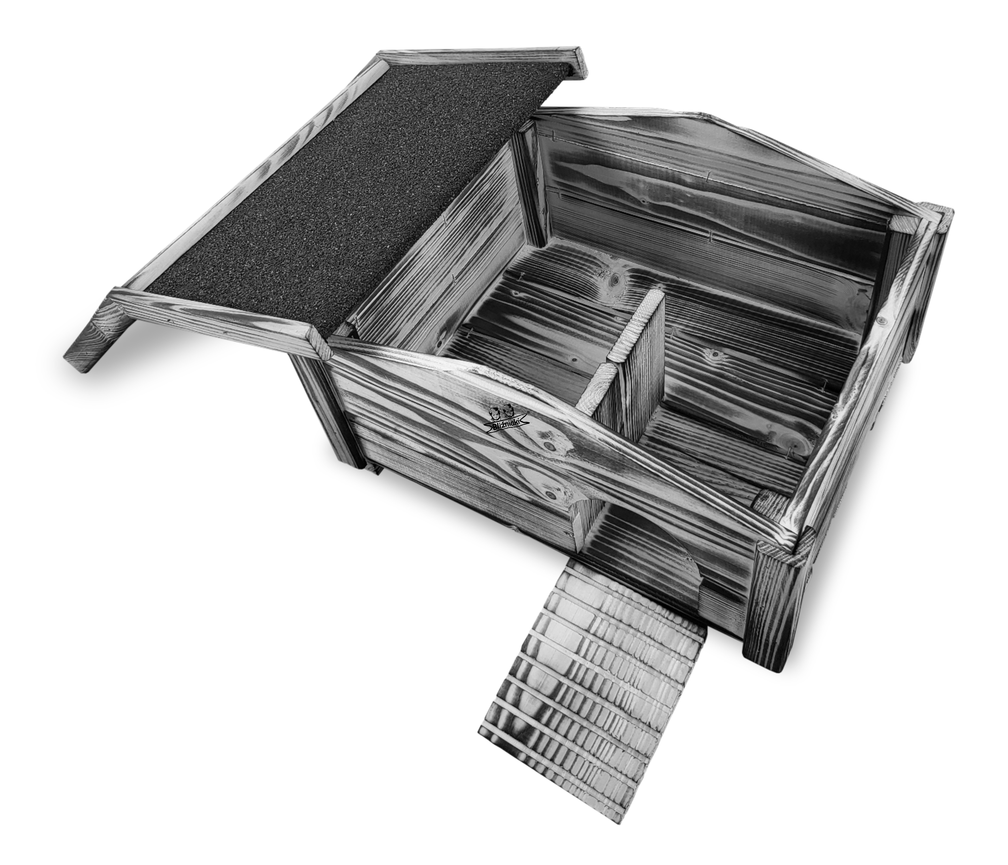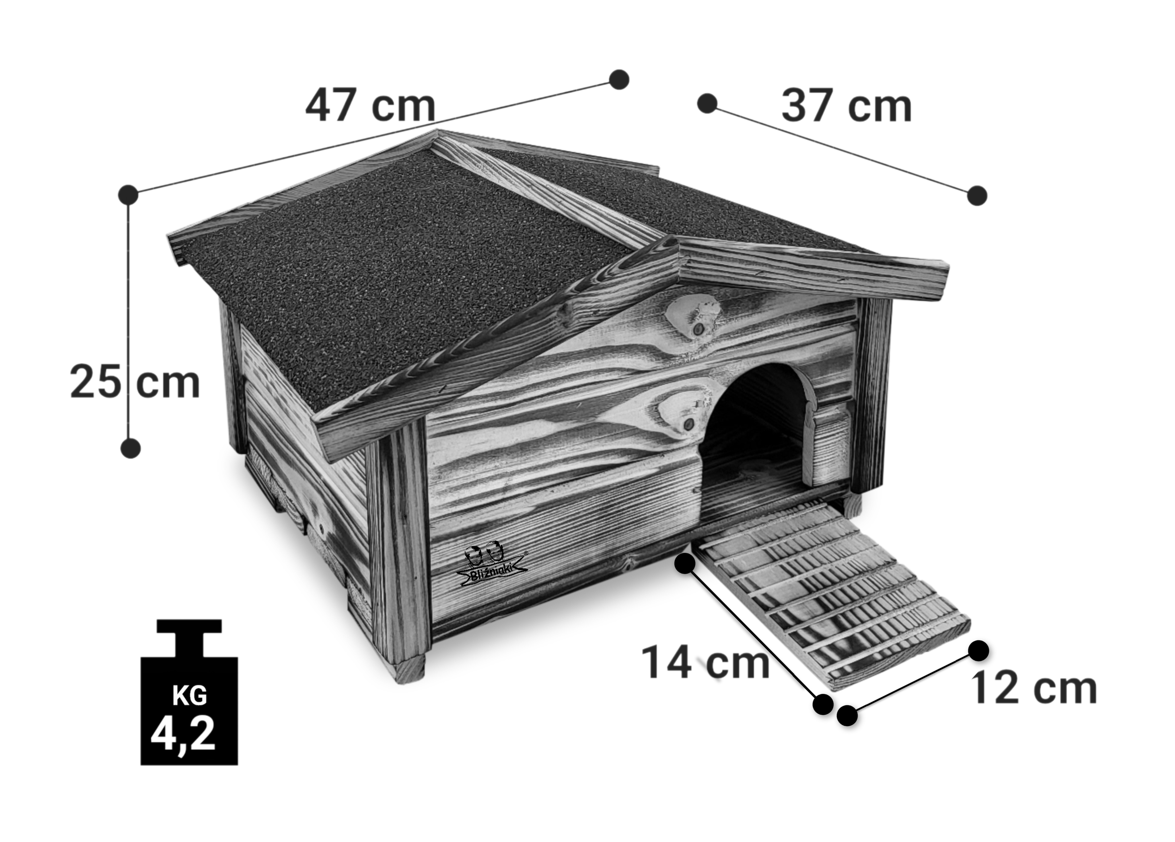 Konstrukcja domku jest stabilna, zdejmowany dwuspadowy dach ułatwi czyszczenie wnętrza budki a do środka prowadzi podest ryflowane schodki, ponadto kryta podłoga odizolowuje jeże od mokrego i zimnego podłoża co czyni ten domek komfortowym siedziskiem do lęgu małych jeżyków.