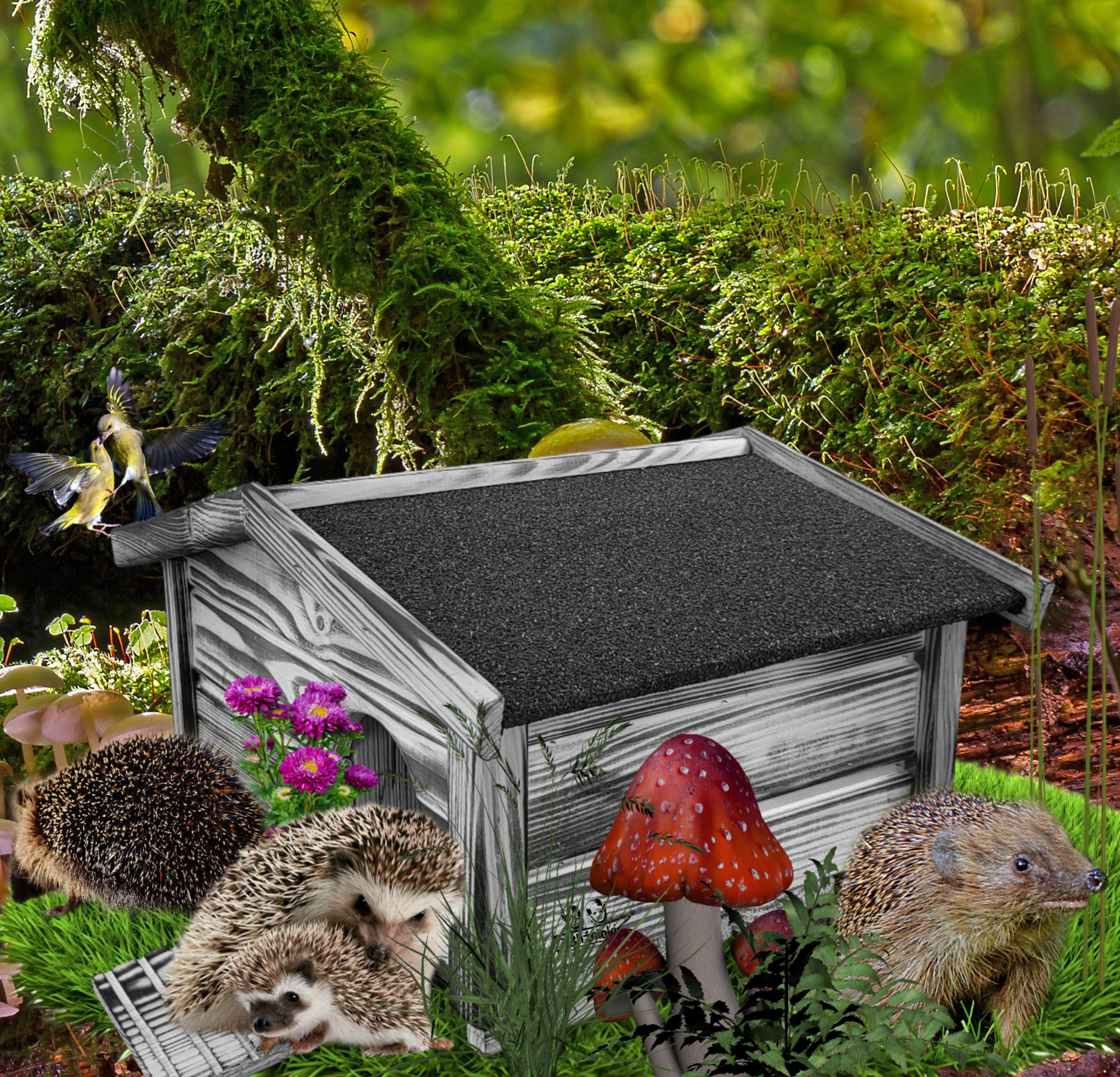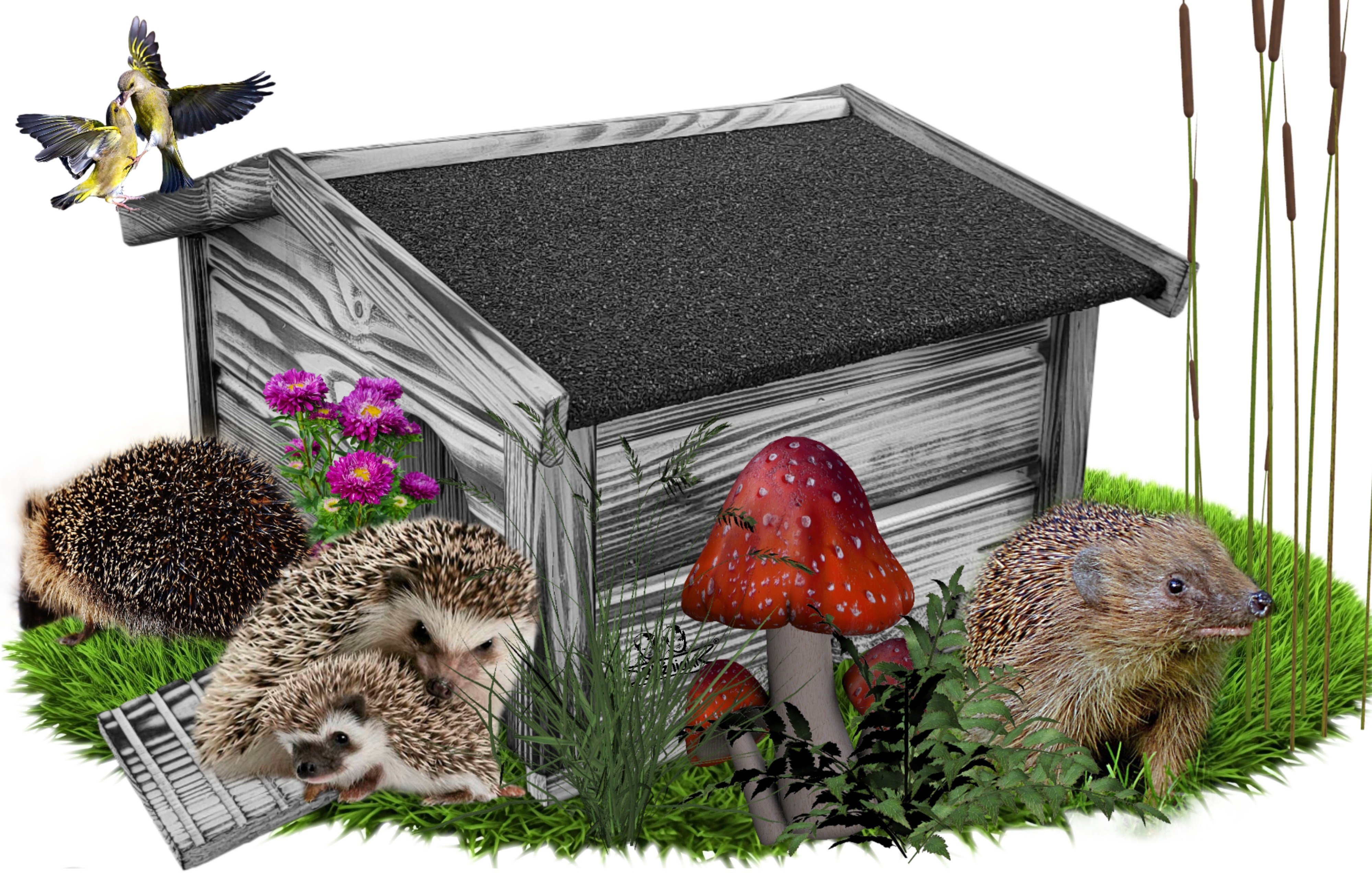 Domek zapewni bezpieczeństwo dorosłym oraz małym jeżom przed drapieżnikami oraz ochroni budowane gniazdo przed wyniesieniem siana.