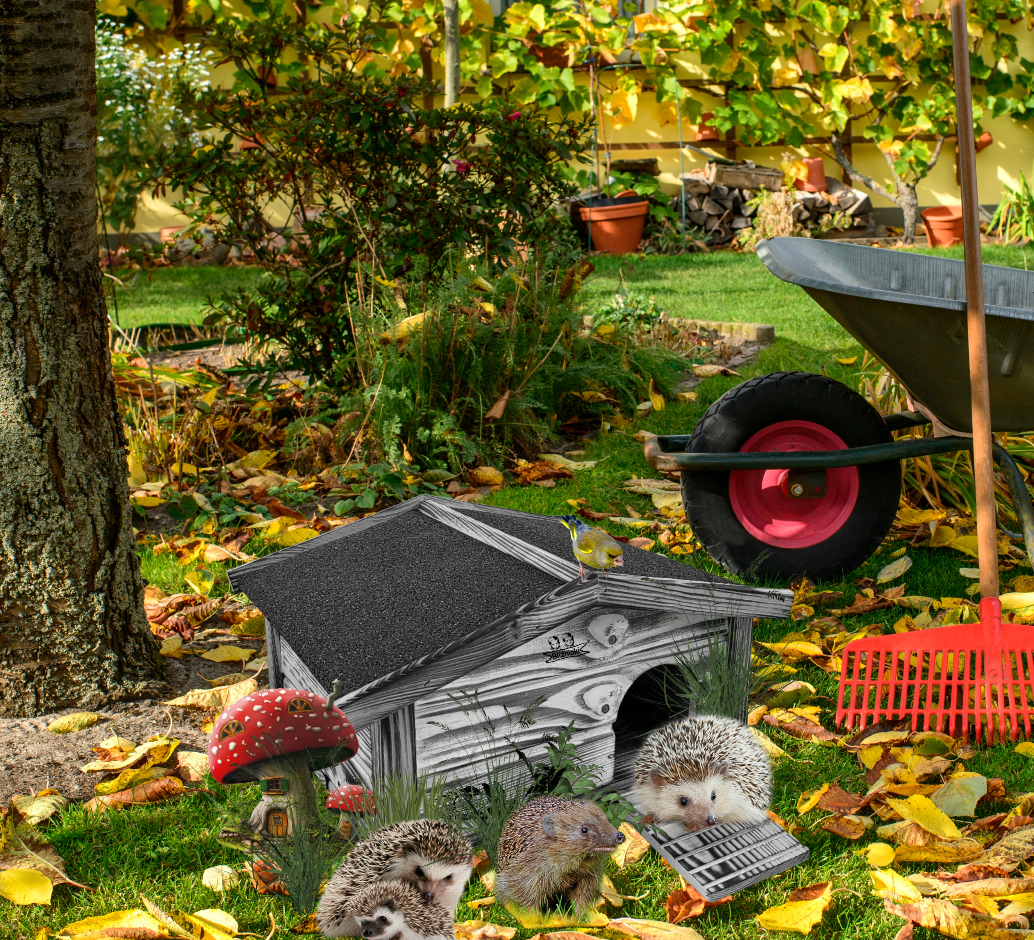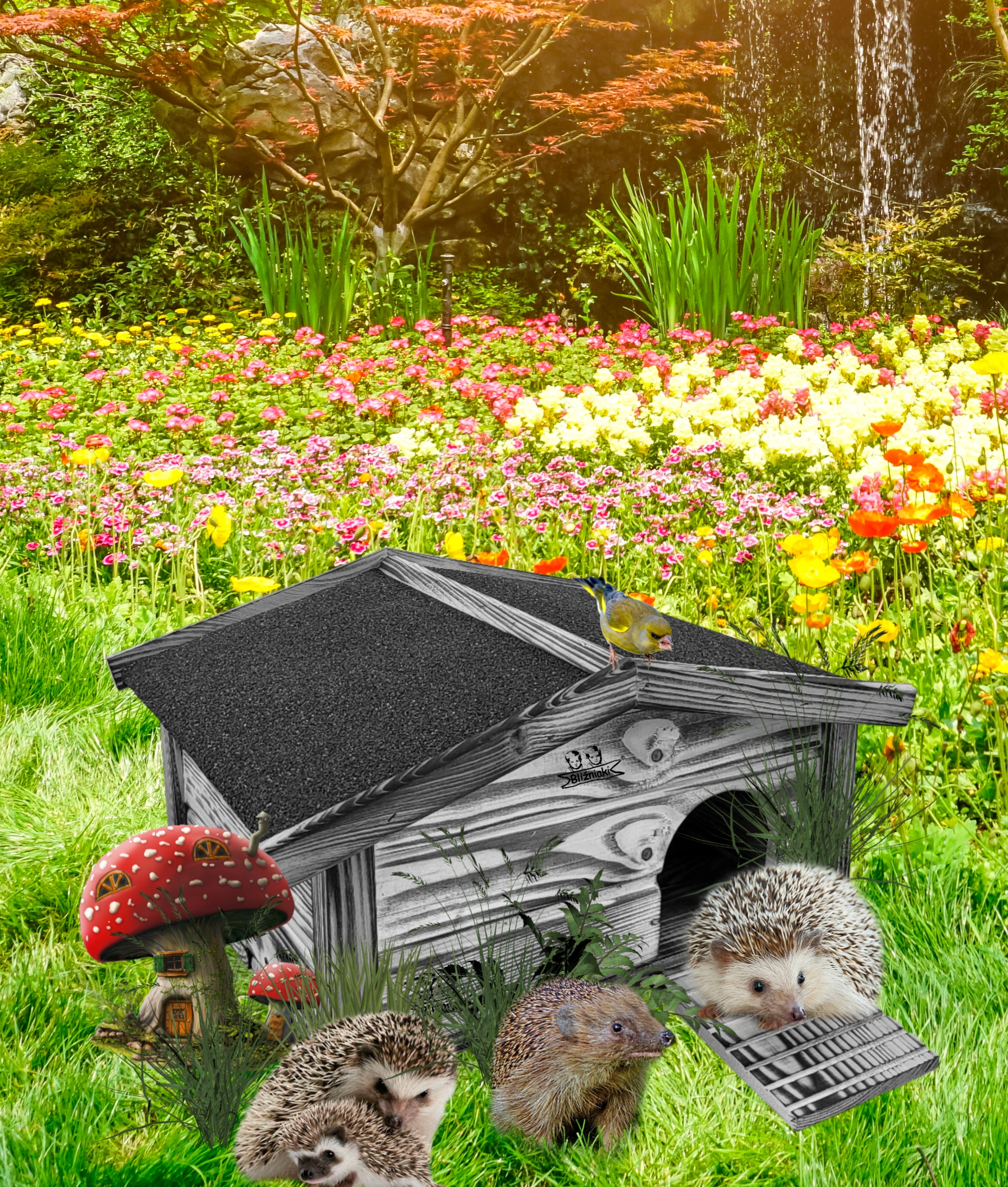 - domek dla jeża stanowi również dekoracyjny element malej architektury ogrodowej