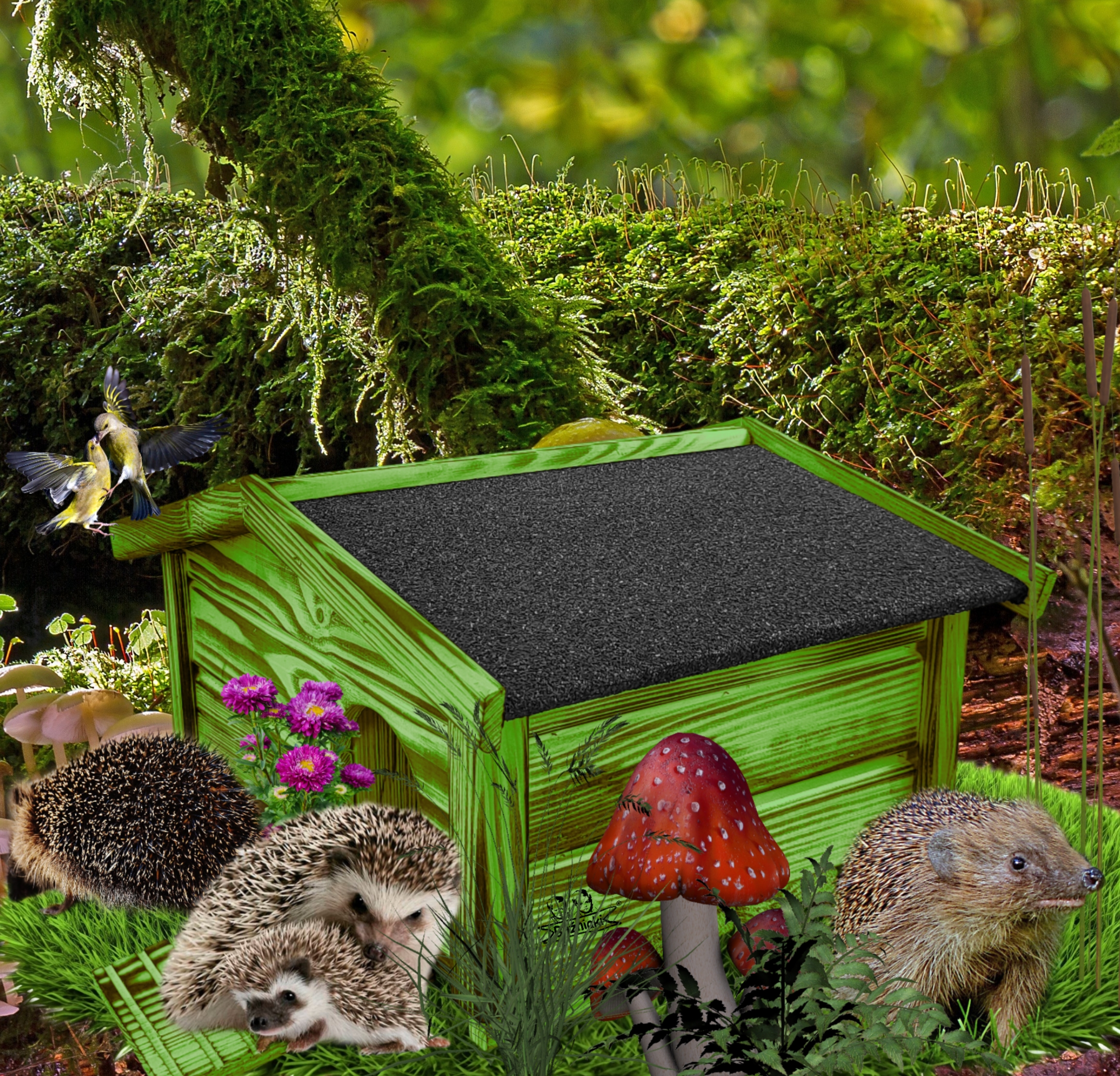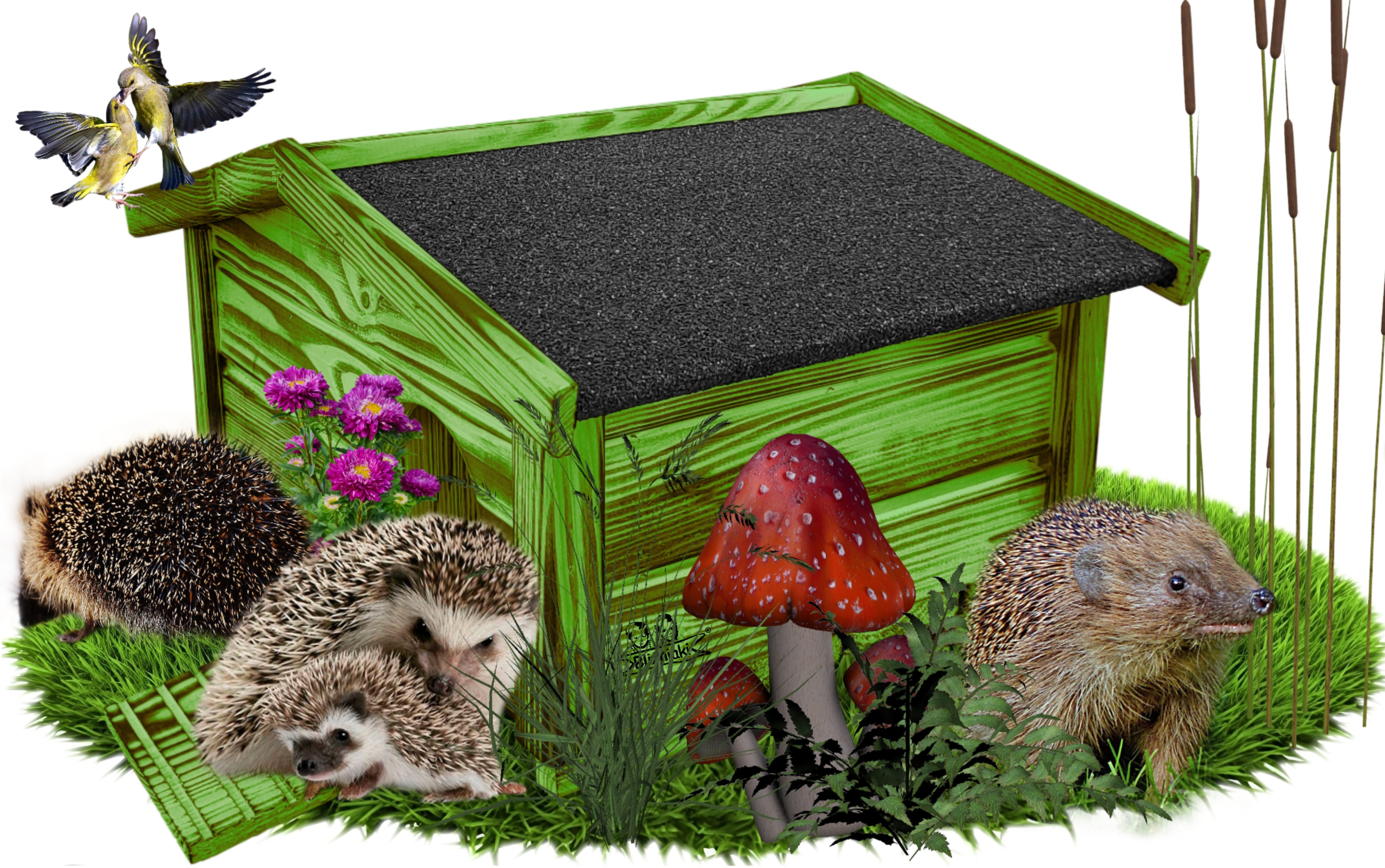 Domek zapewni bezpieczeństwo dorosłym oraz małym jeżom przed drapieżnikami oraz ochroni budowane gniazdo przed wyniesieniem siana.