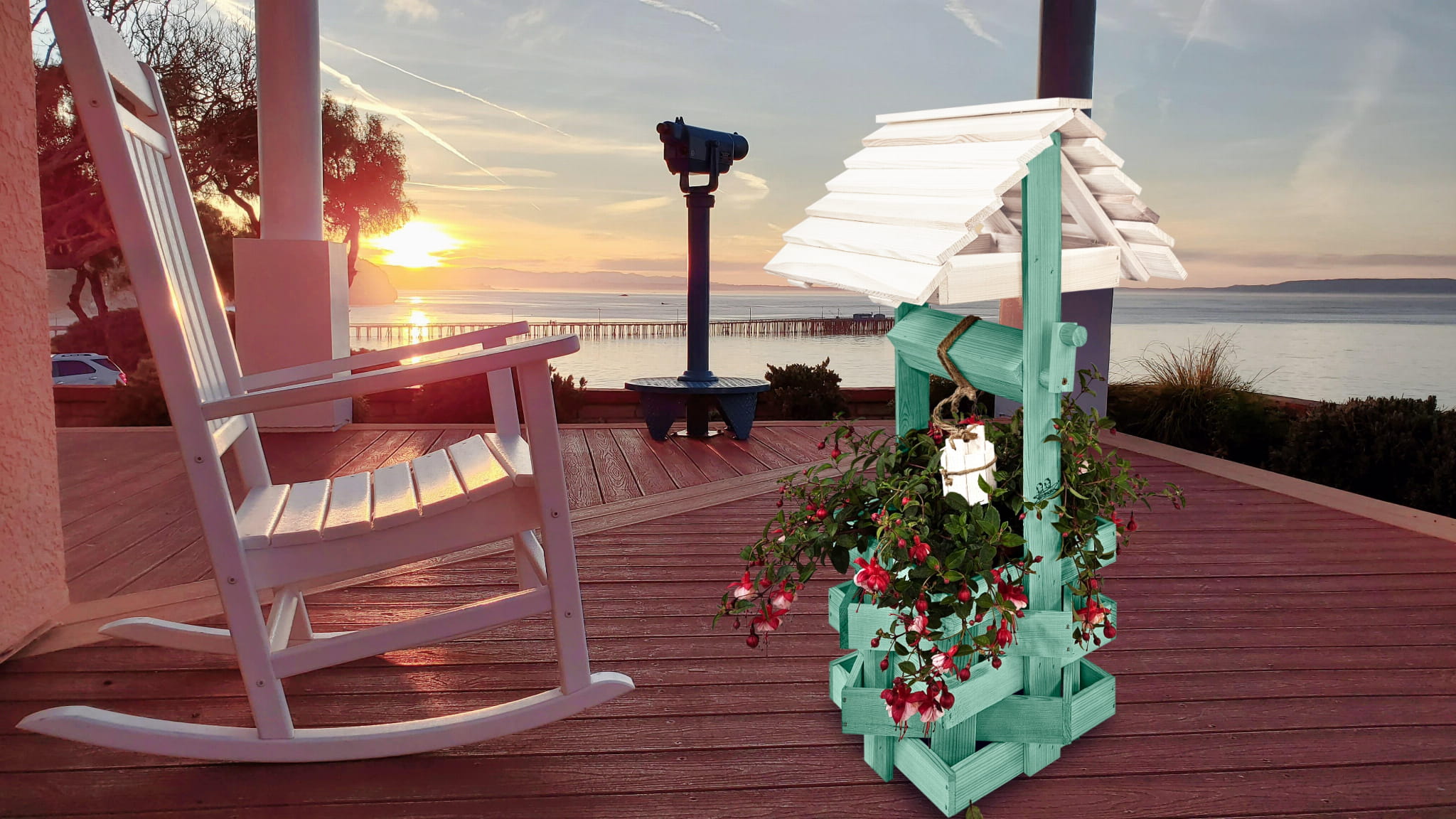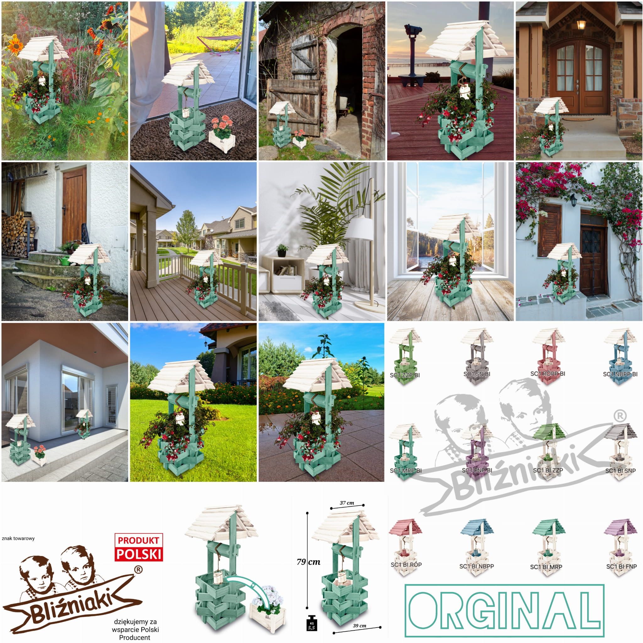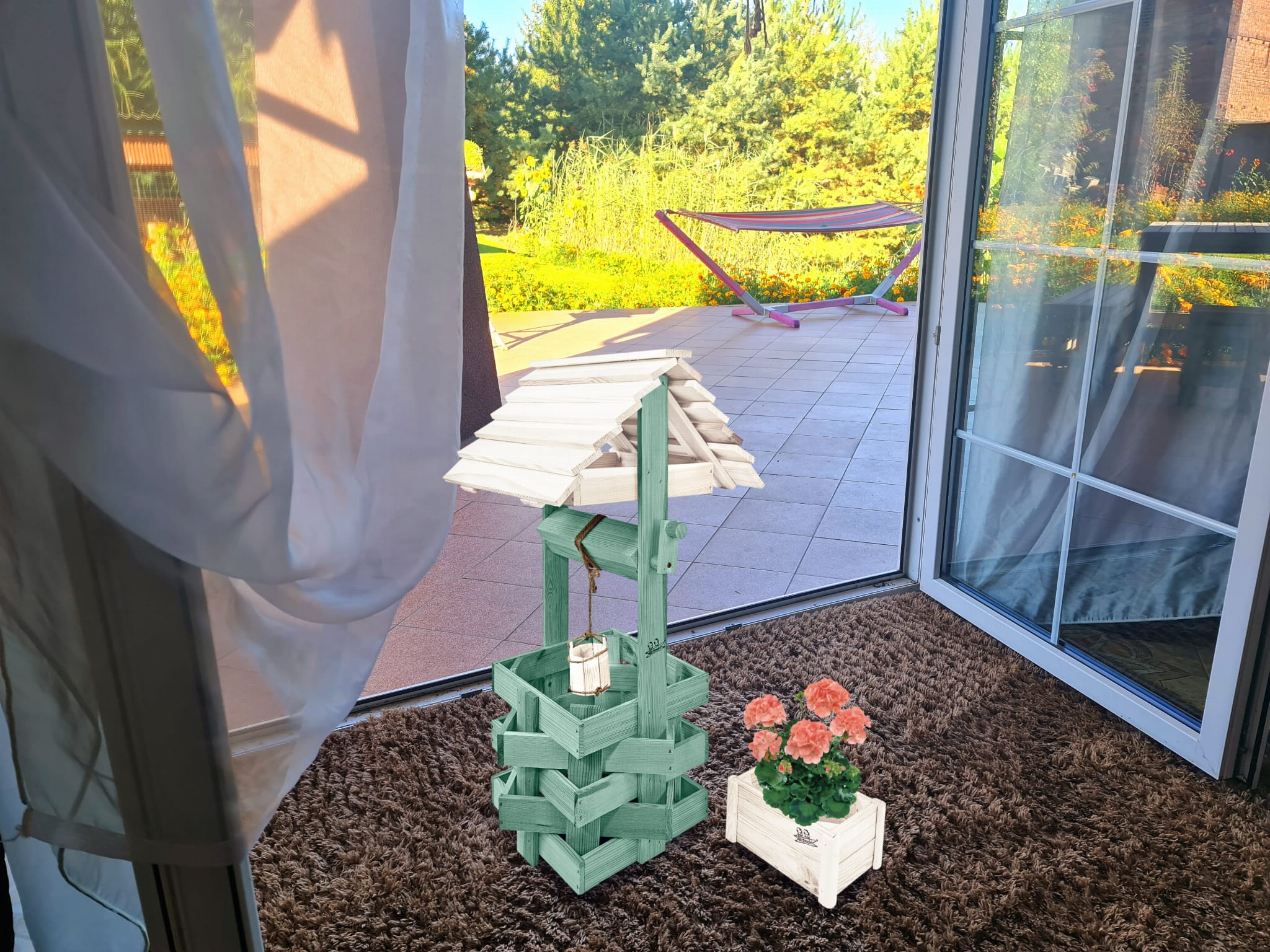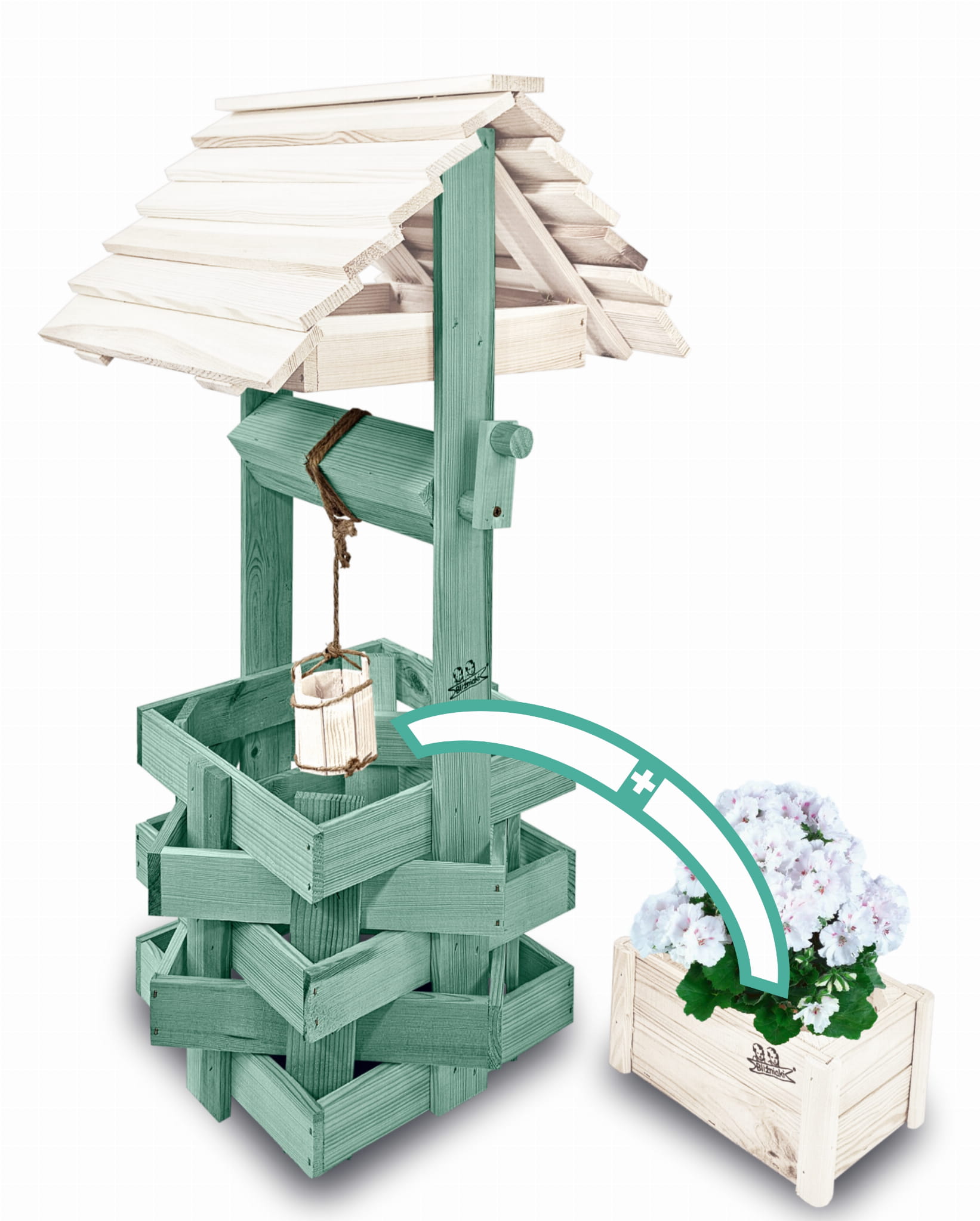 Do studni dołączona jest drewniana doniczka na kwiaty, utrzymana w tej samej estetyce, tworząc spójną i harmonijną całość.
