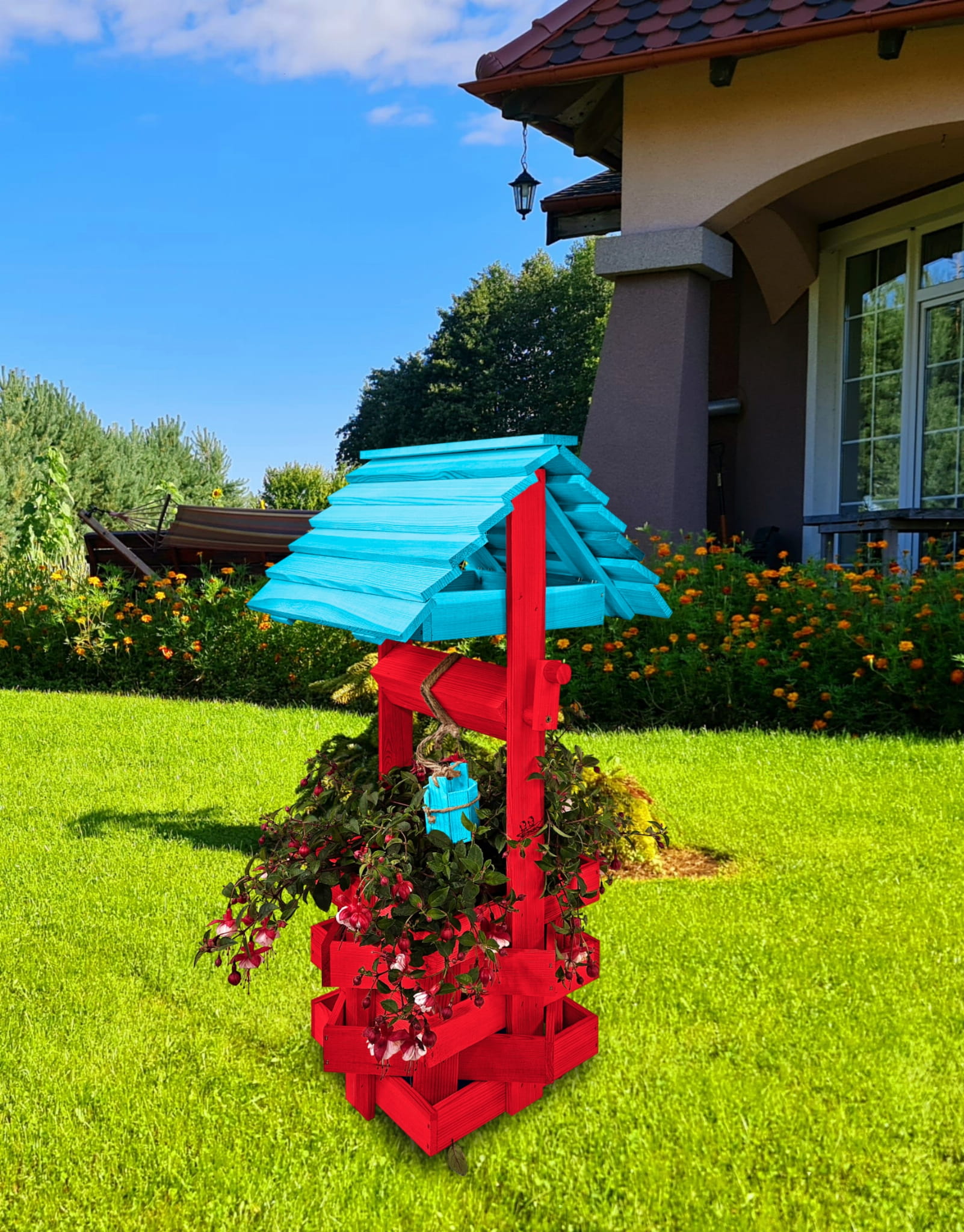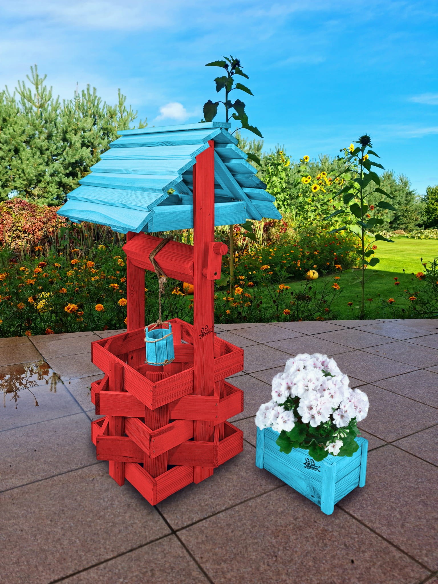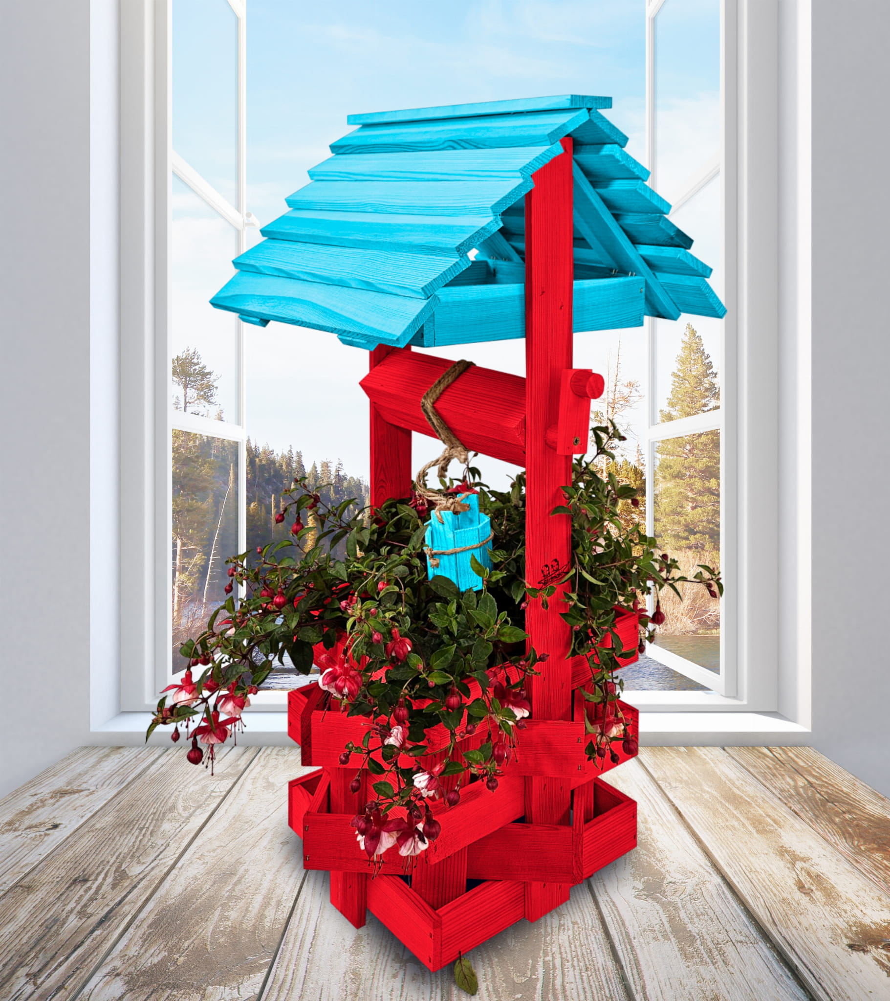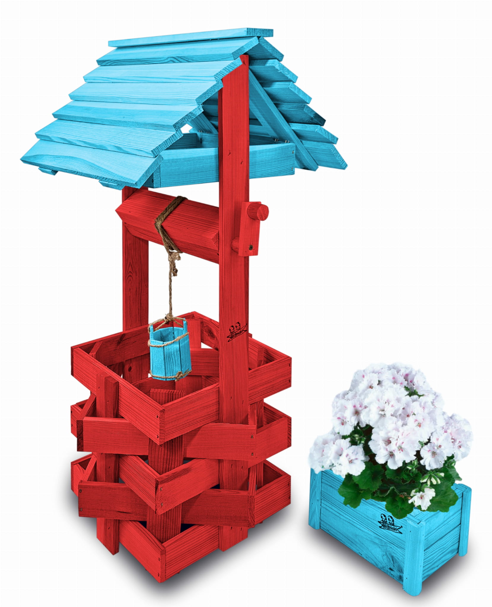 Donica na kwiaty do Domu i Ogrodu Studnie Balkonowe Tarasowe Studzienka na peralgonie Studnia Drewniana Ozdobna ogrodowa Kolor CZERWONY NIEBIESKI OZDOBA WNĘTRZ I OGRODU RęKODZIEŁO Figura Ogrodowa Studzienki ozdobne Kwietnik doniczki Prezent SC1 CB NBP