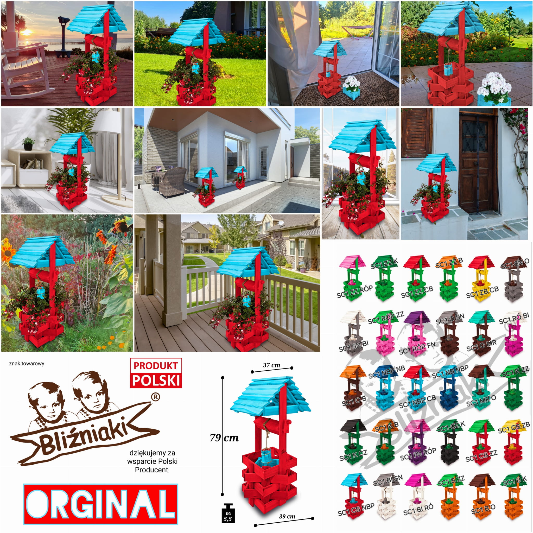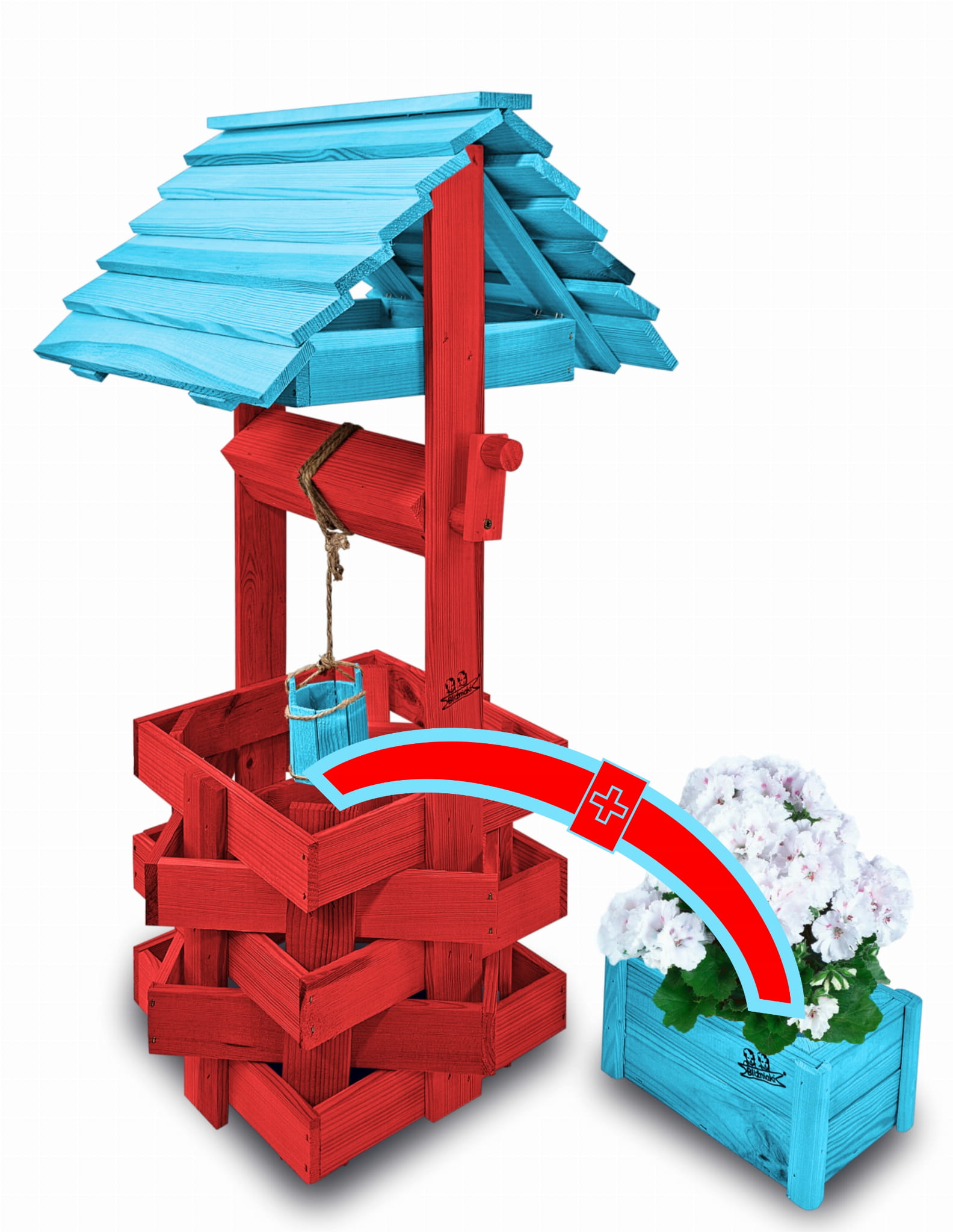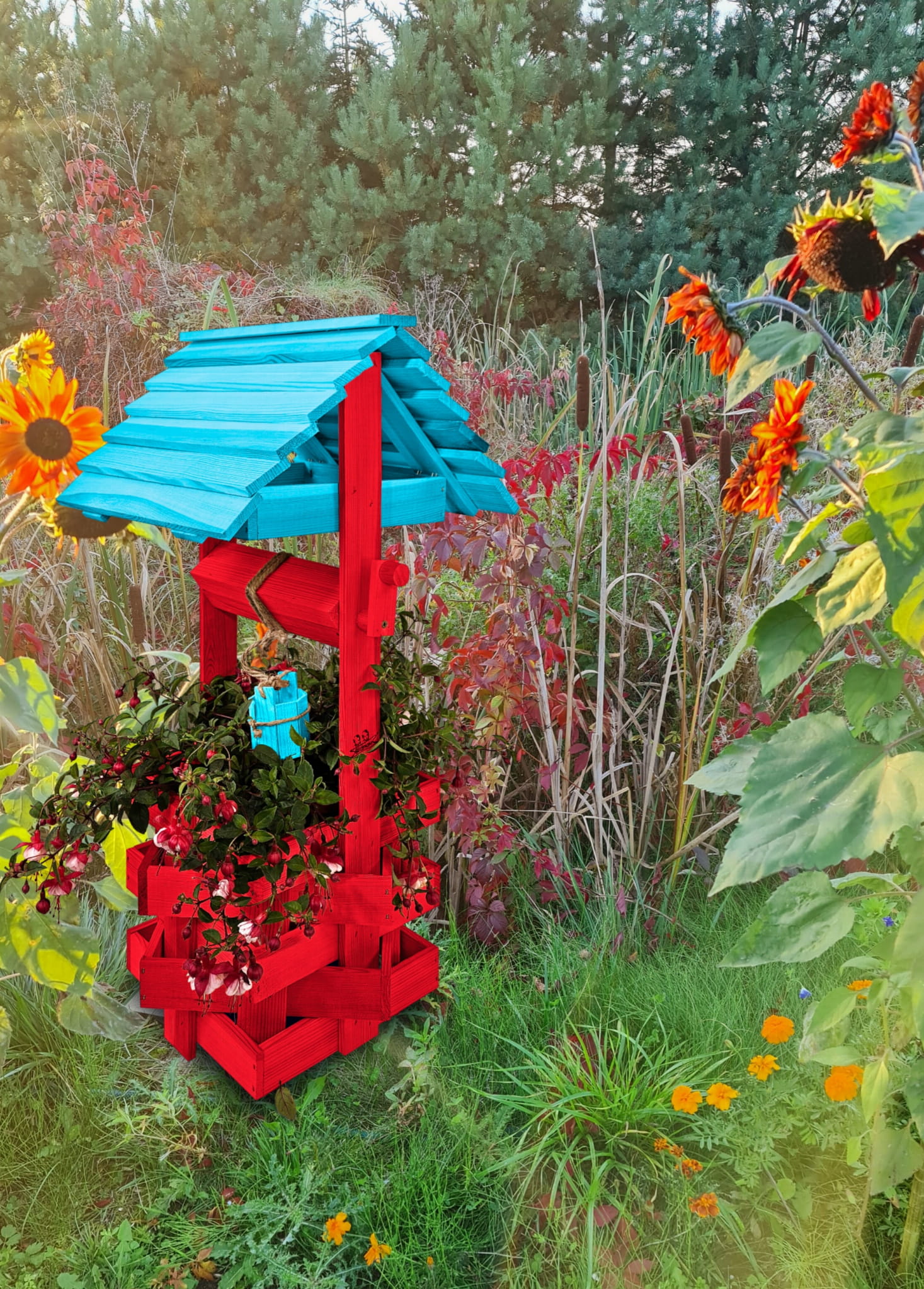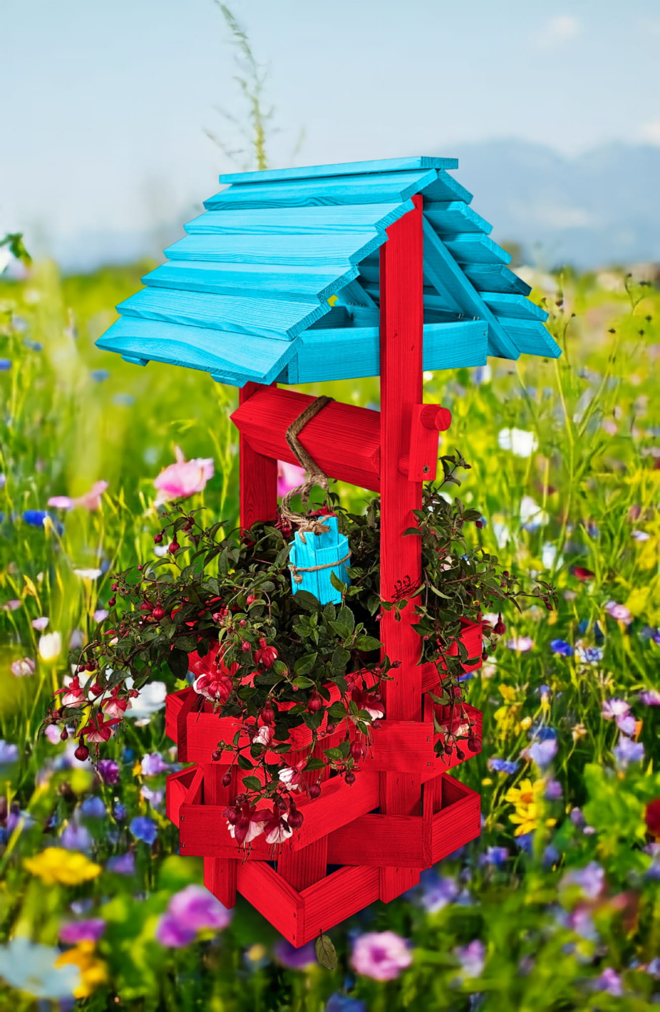 Donica na kwiaty do Domu i Ogrodu Studnie Balkonowe Tarasowe Studzienka na peralgonie Studnia Drewniana Ozdobna ogrodowa Kolor CZERWONY NIEBIESKI OZDOBA WNĘTRZ I OGRODU RęKODZIEŁO Figura Ogrodowa Studzienki ozdobne Kwietnik doniczki Prezent SC1 CB NBP