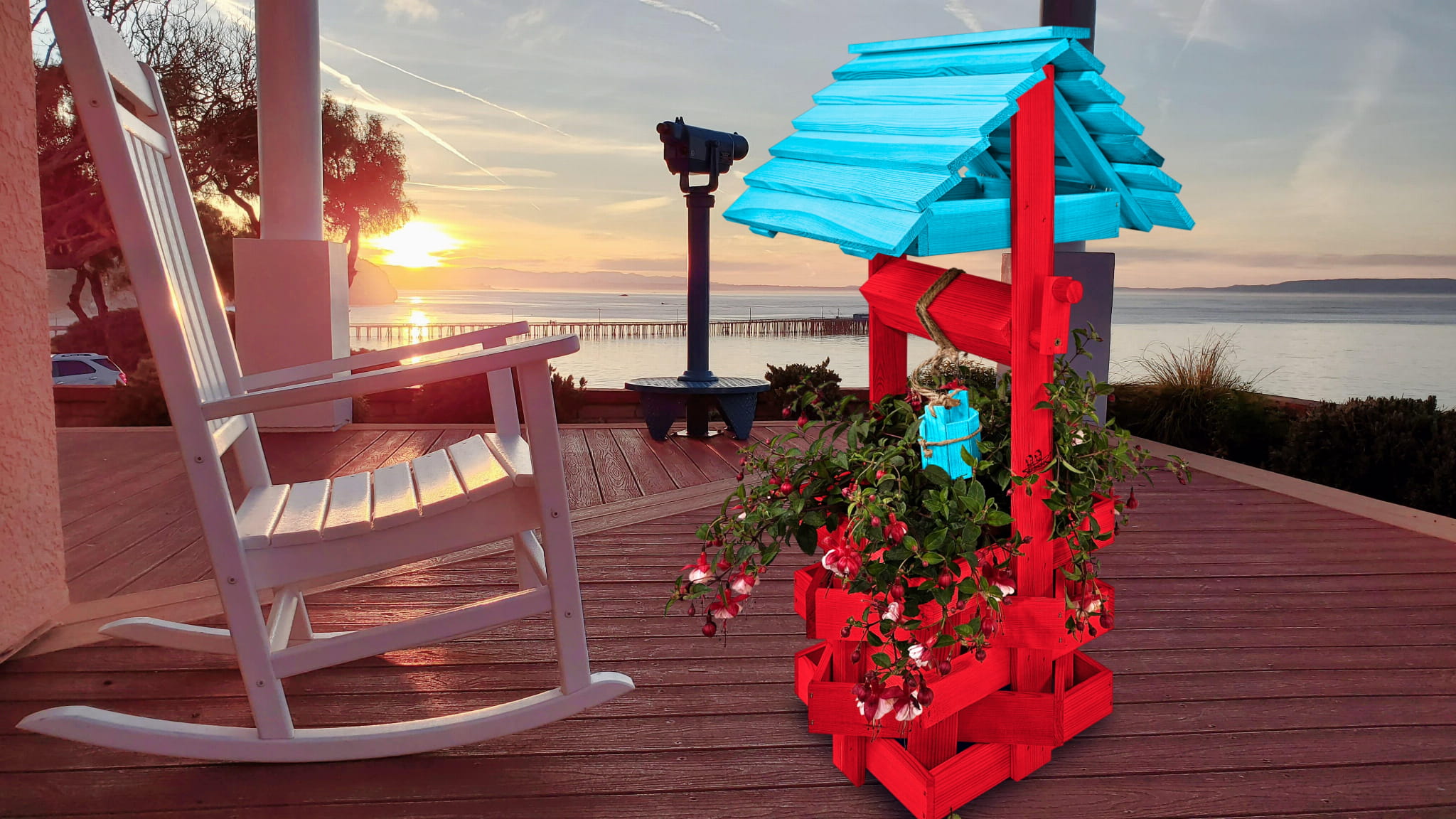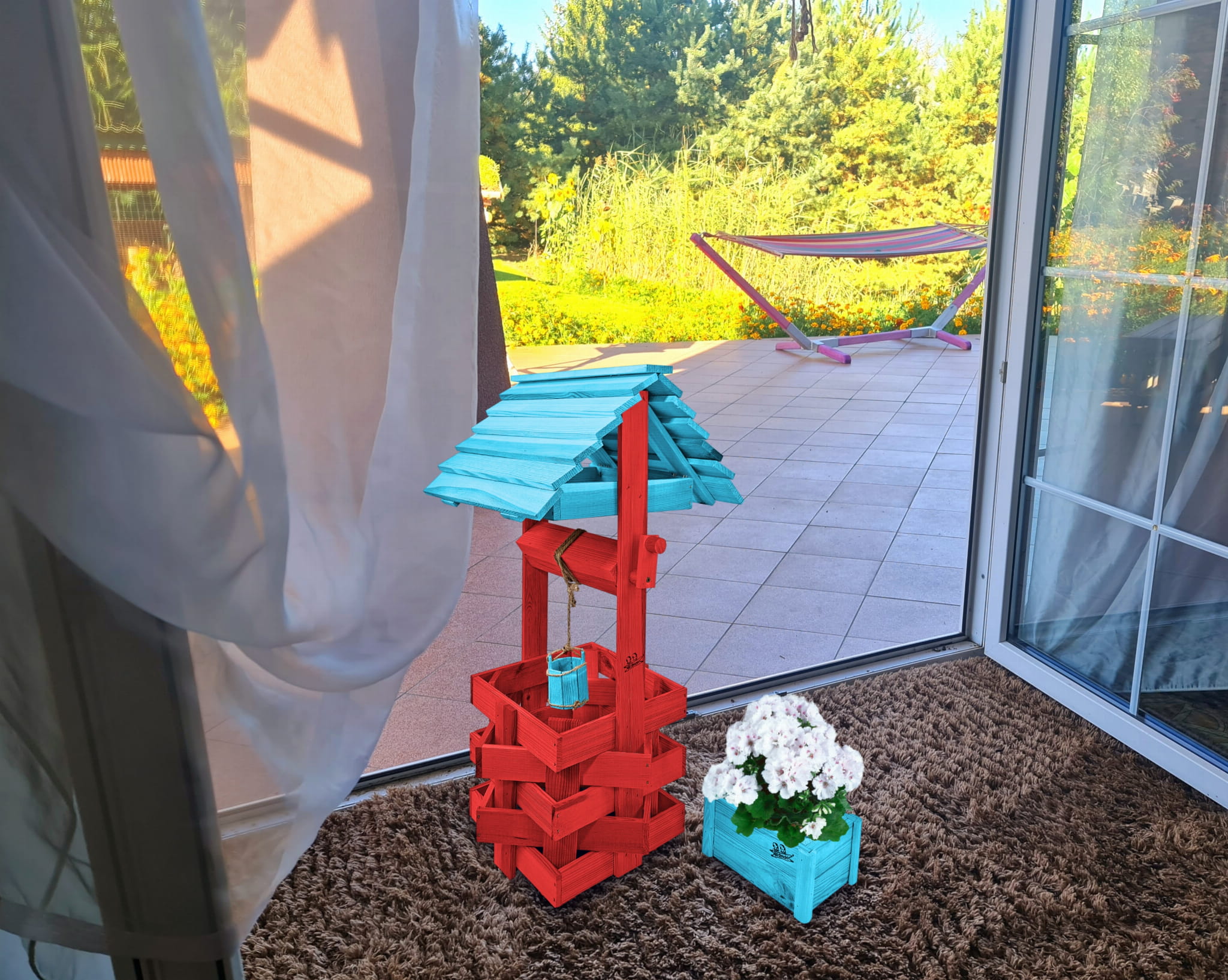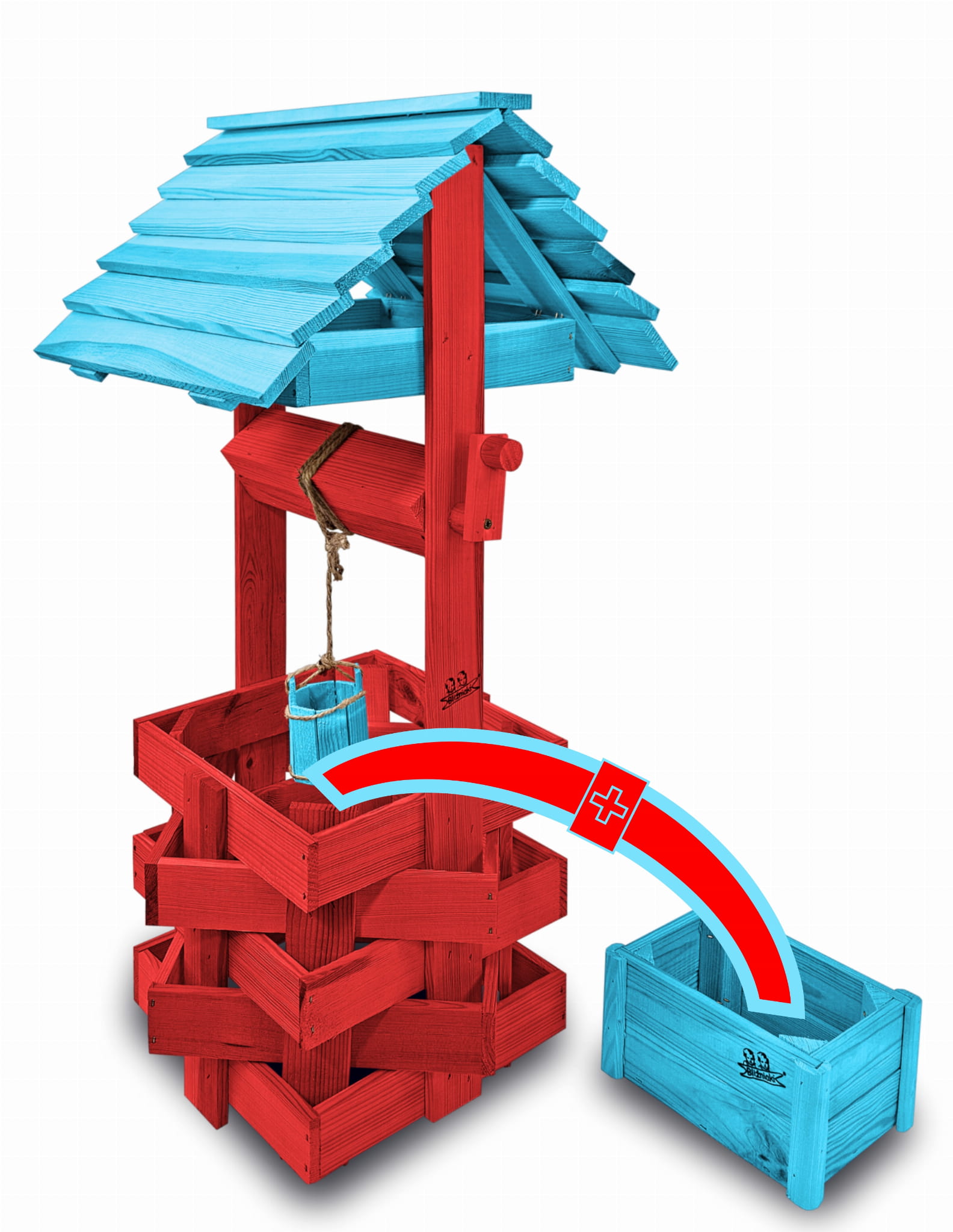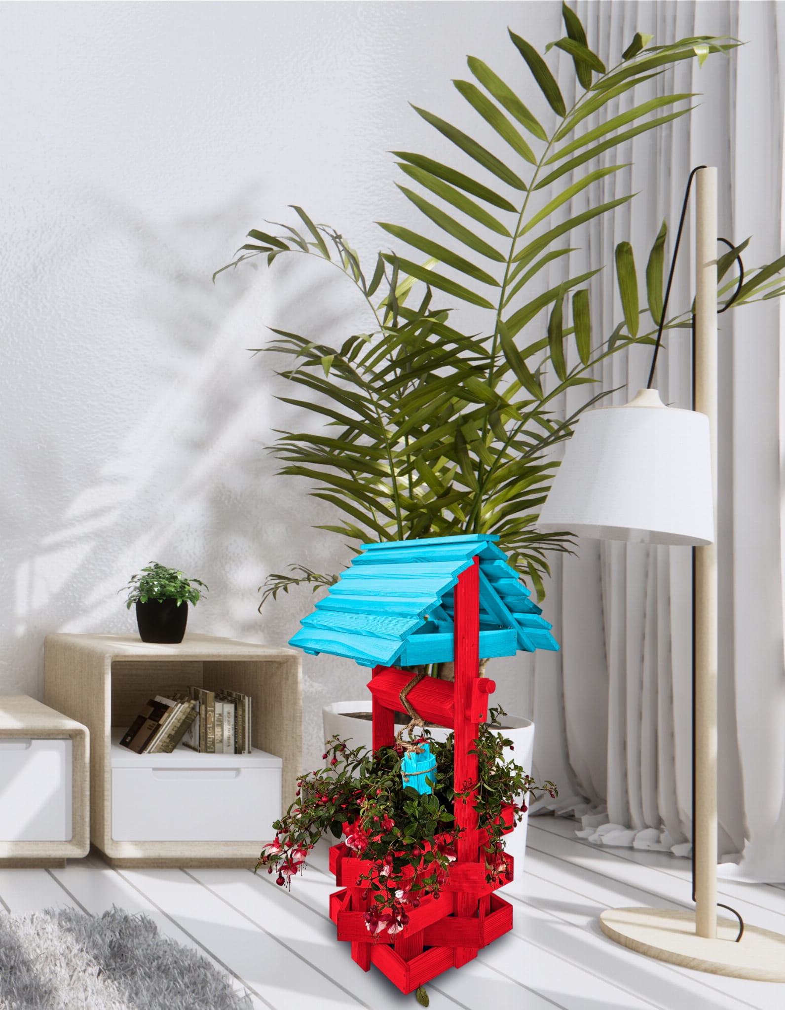 Donica na kwiaty do Domu i Ogrodu Studnie Balkonowe Tarasowe Studzienka na peralgonie Studnia Drewniana Ozdobna ogrodowa Kolor CZERWONY NIEBIESKI OZDOBA WNĘTRZ I OGRODU RęKODZIEŁO Figura Ogrodowa Studzienki ozdobne Kwietnik doniczki Prezent SC1 CB NBP