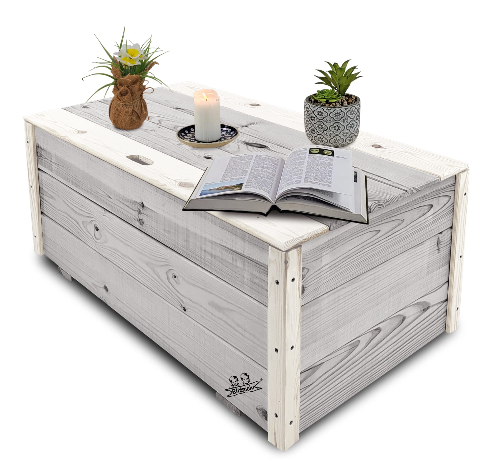 Wykonany z drewna litego, dzięki temu będzie odporny na warunki atmosferyczne i zachowuje estetyczny wygląd na dłużej. Produkt solidnie skonstruowany i wytrzymały na obciążenia, dwukolorowy, w podstawowej przeważającej części produkt jest koloru PASTELOWEGO SZAREGO, został wykończony w kątownikach i listwach kolorem BIAŁYM. Dzięki temu zabiegowi produktowi został nadany styl i elegancki design.