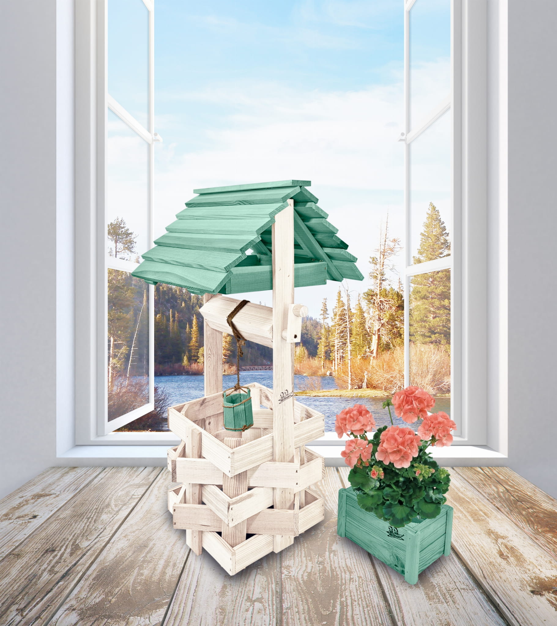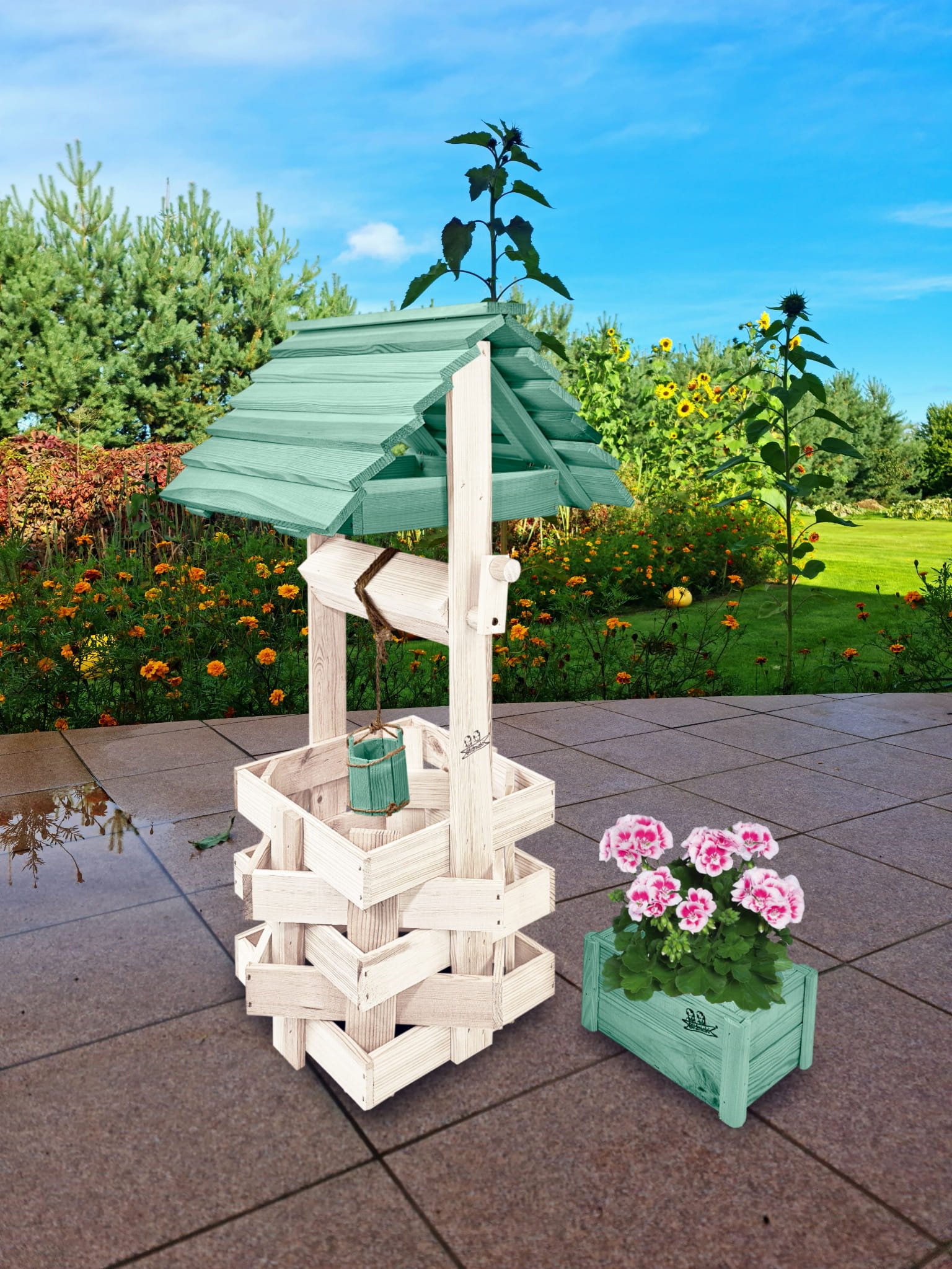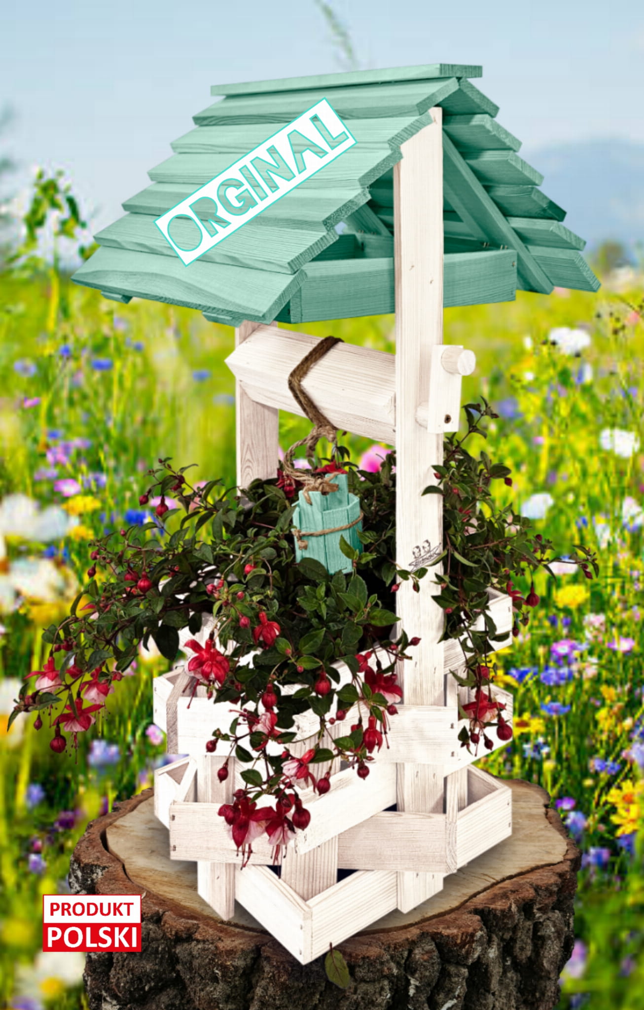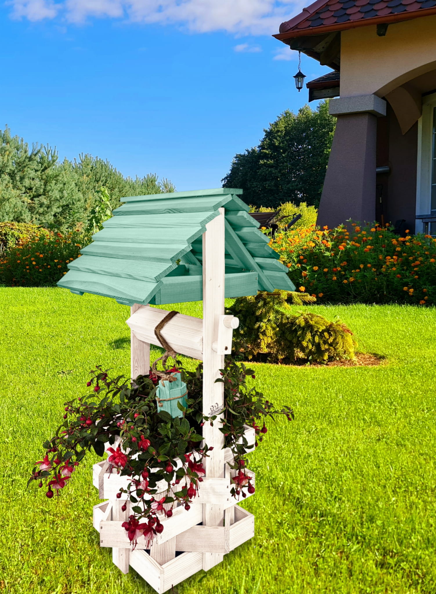 Drewniana studnia Kwietnik Kolor PASTELOWY MORSKA ZIELEŃ Donica na kwiaty do domu i ogrodu Ozdobne studzienki Prezent Studnia ogrodowa ozdobna Doniczki na rośliny Studnie balkonowe tarasowe Studzienka na pelargonie Ozdoba wnętrz i ogrodu SC1 BI MRP