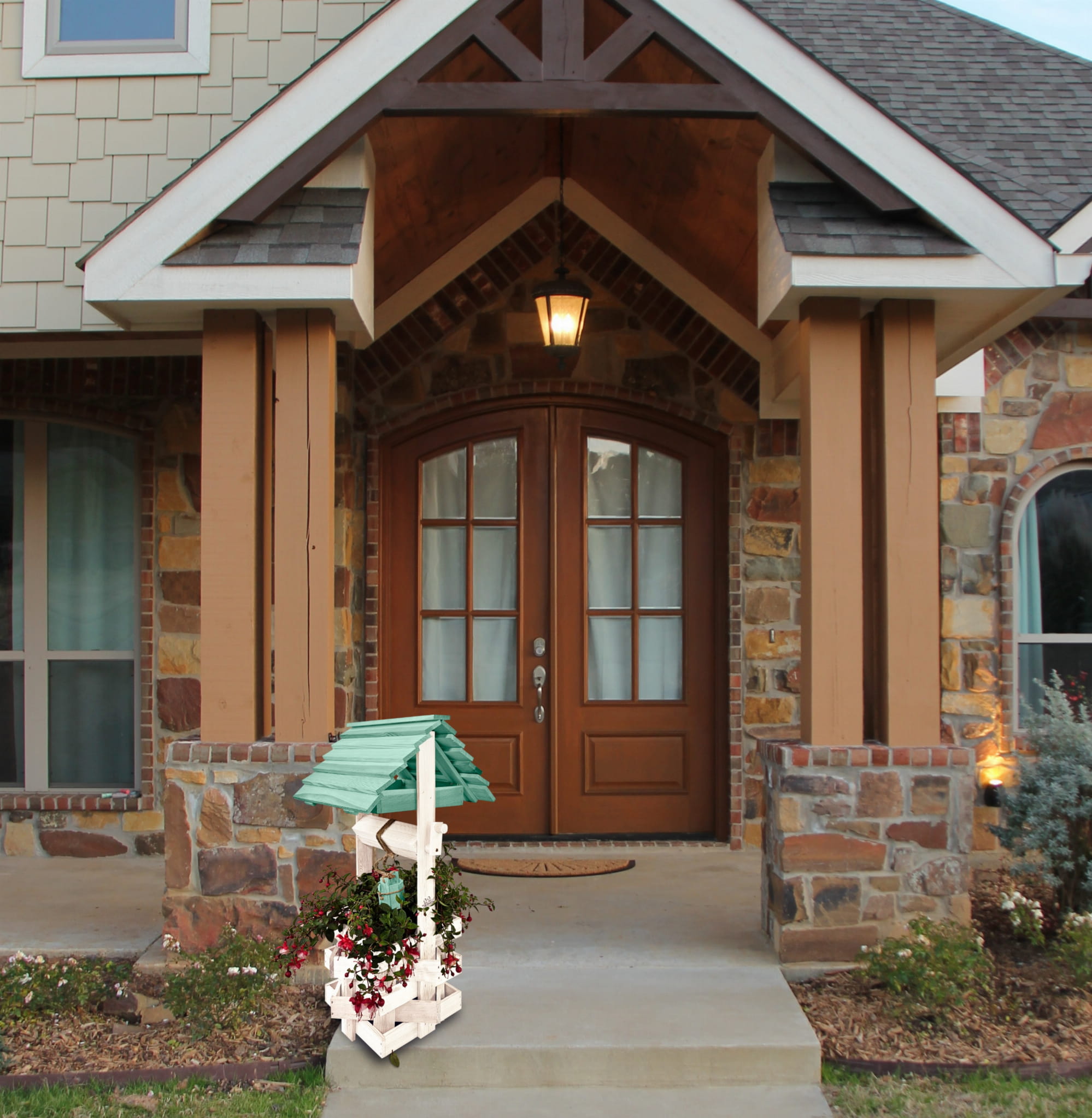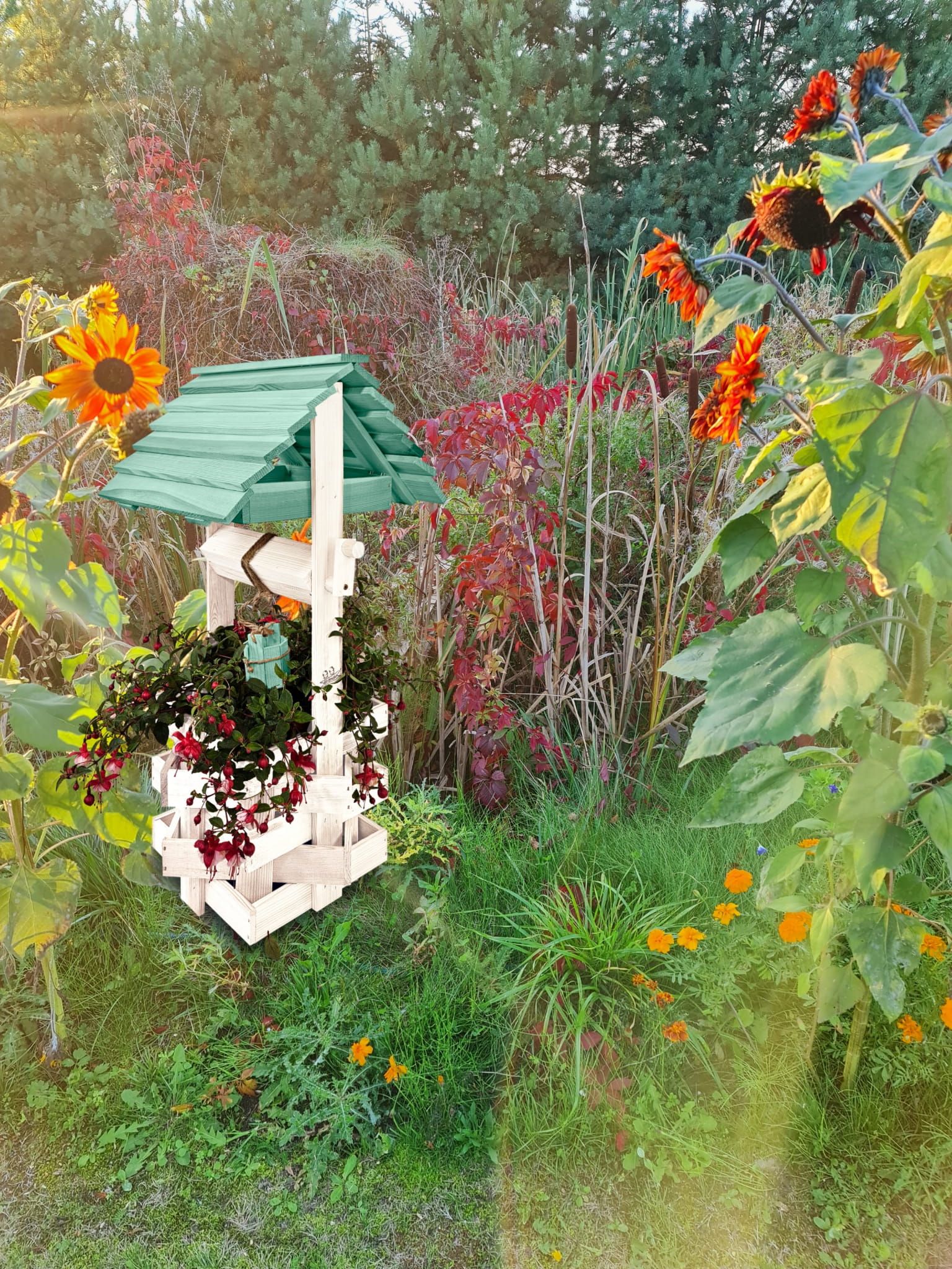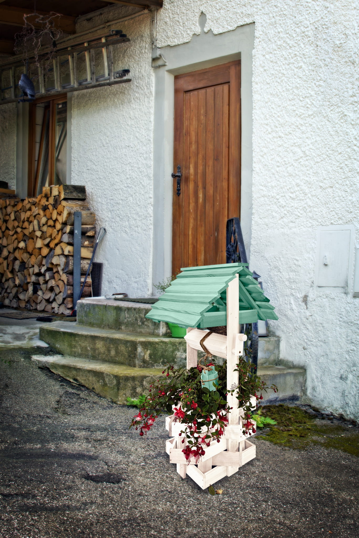 Do studni dołączona jest drewniana doniczka na kwiaty, utrzymana w tej samej estetyce, tworząc spójną i harmonijną całość.