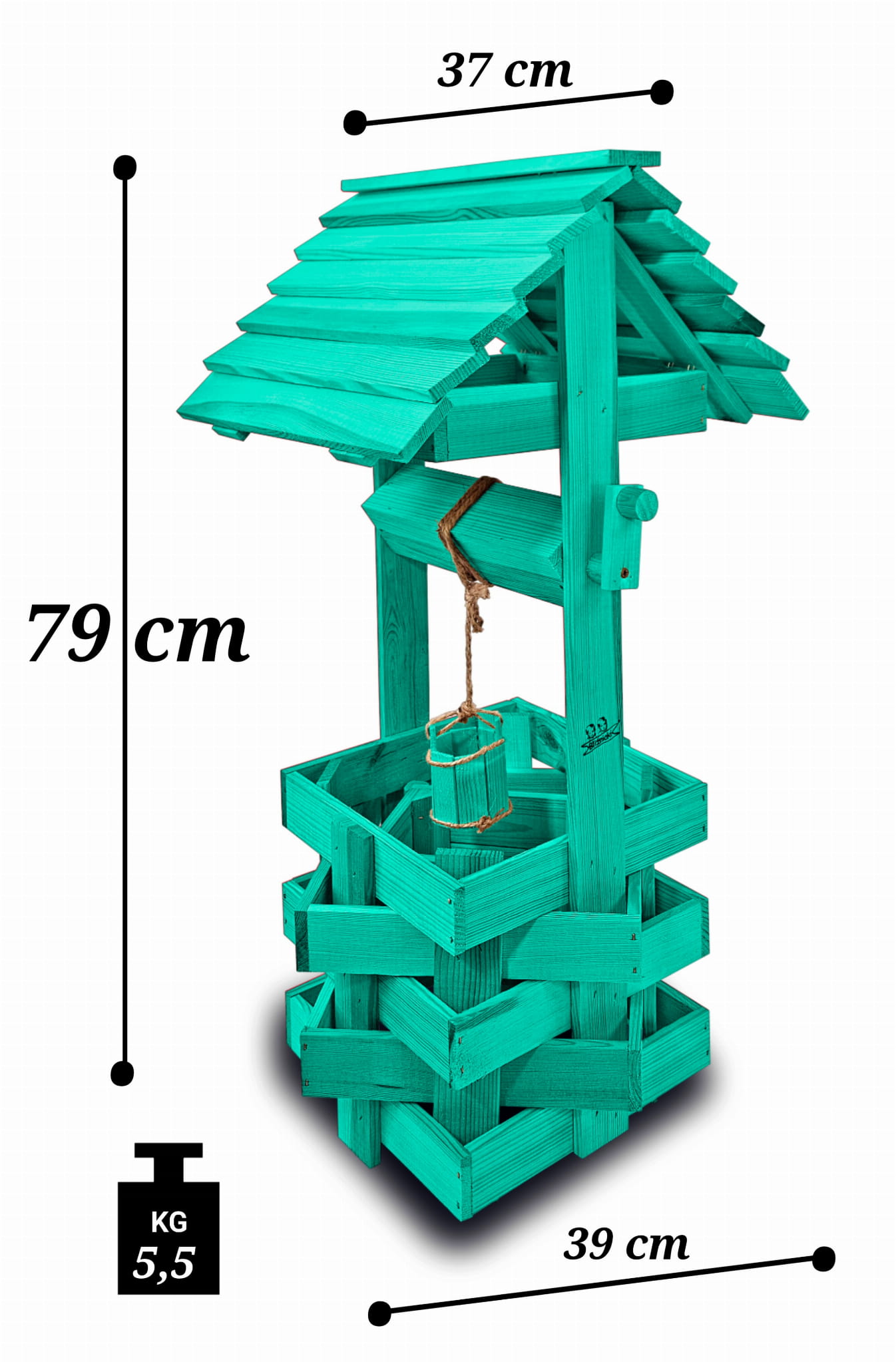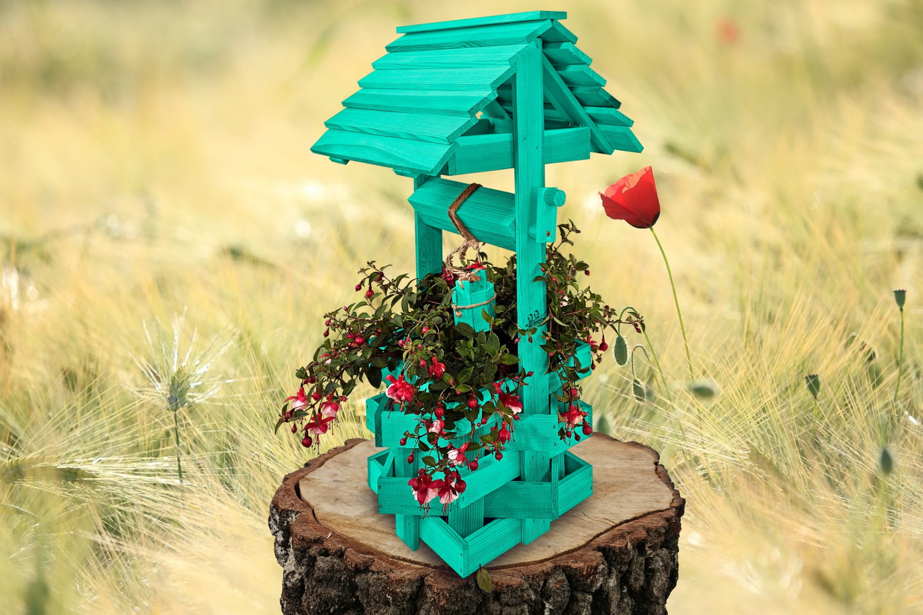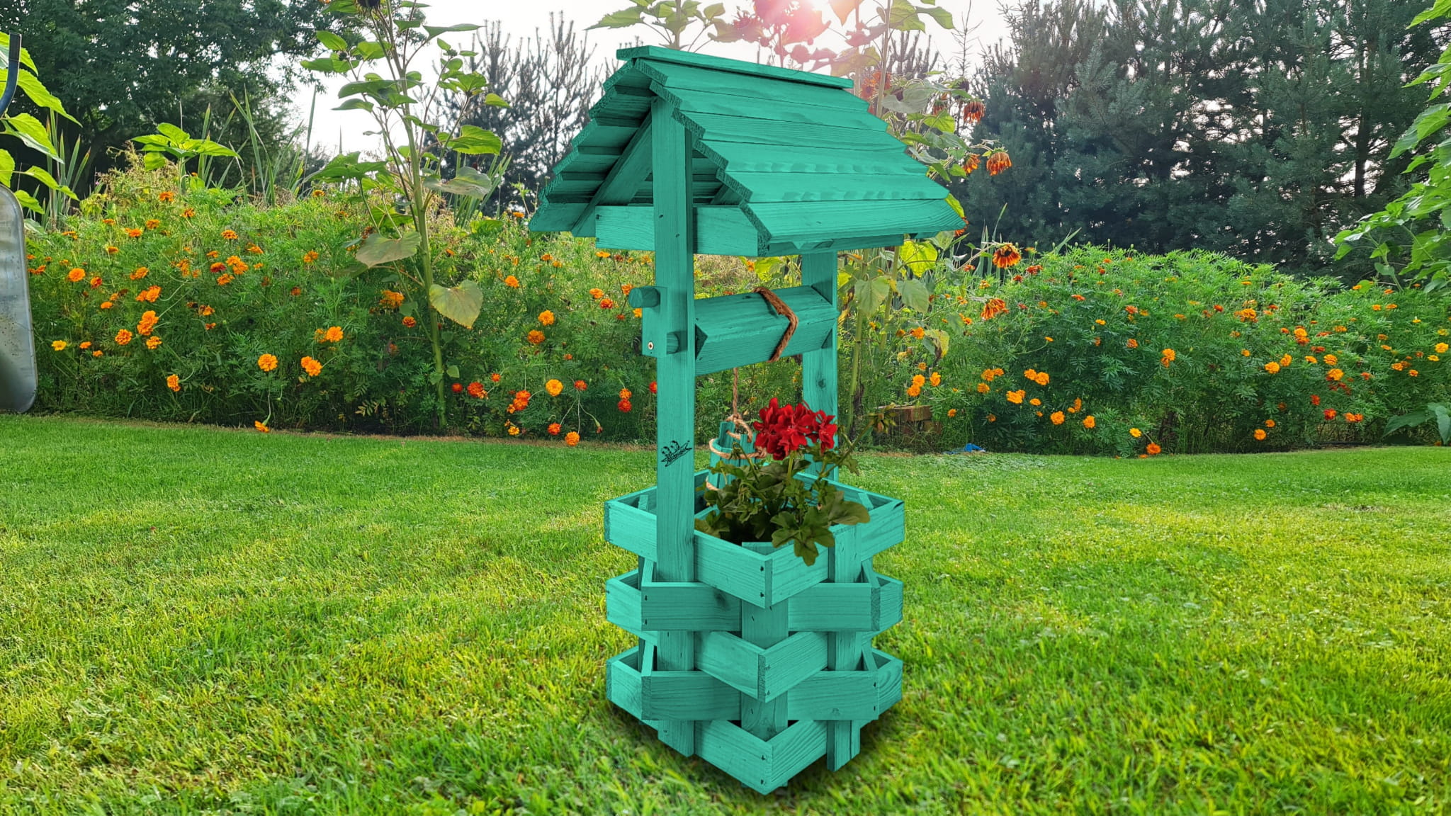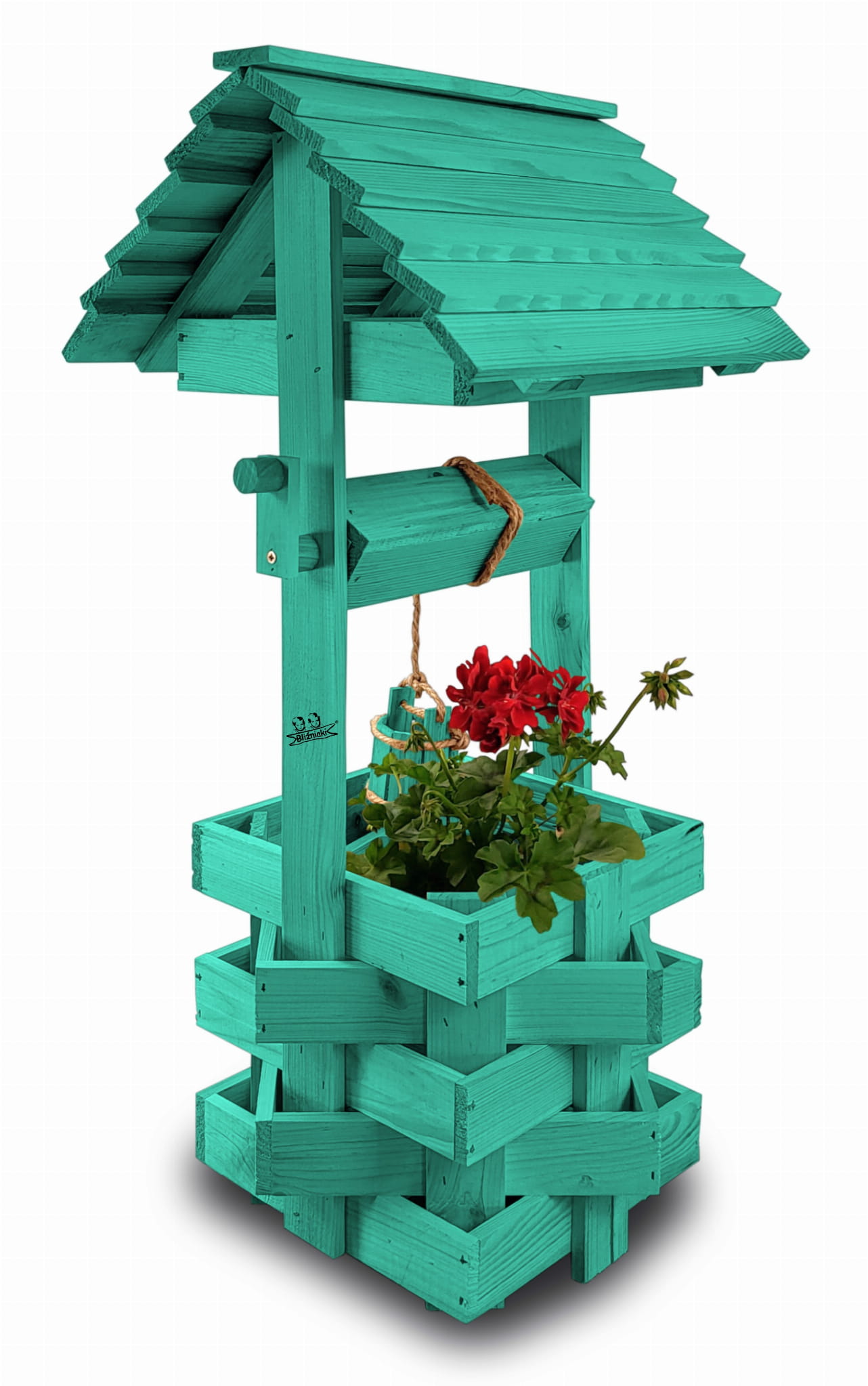 Drewniana studnia ogrodowa Dodatkowa skrzynka na kwiaty w zestawie Ozdobna donica na kwiaty Kolor morska zieleń Dekoracyjny kwietnik Drewniana studzienka do ogrodu Ozdobna donica do domu i ogrodu Drewniane studnie balkonowe tarasowe na pelargonie SC1 MR