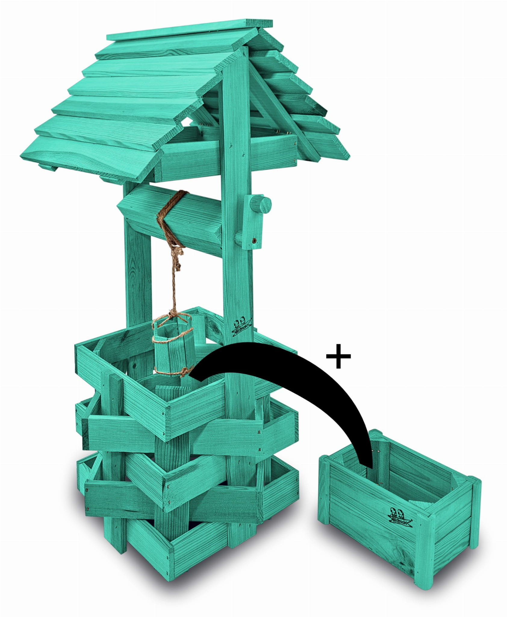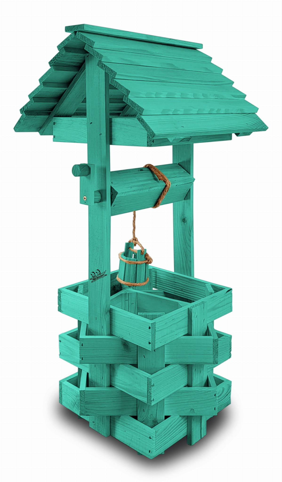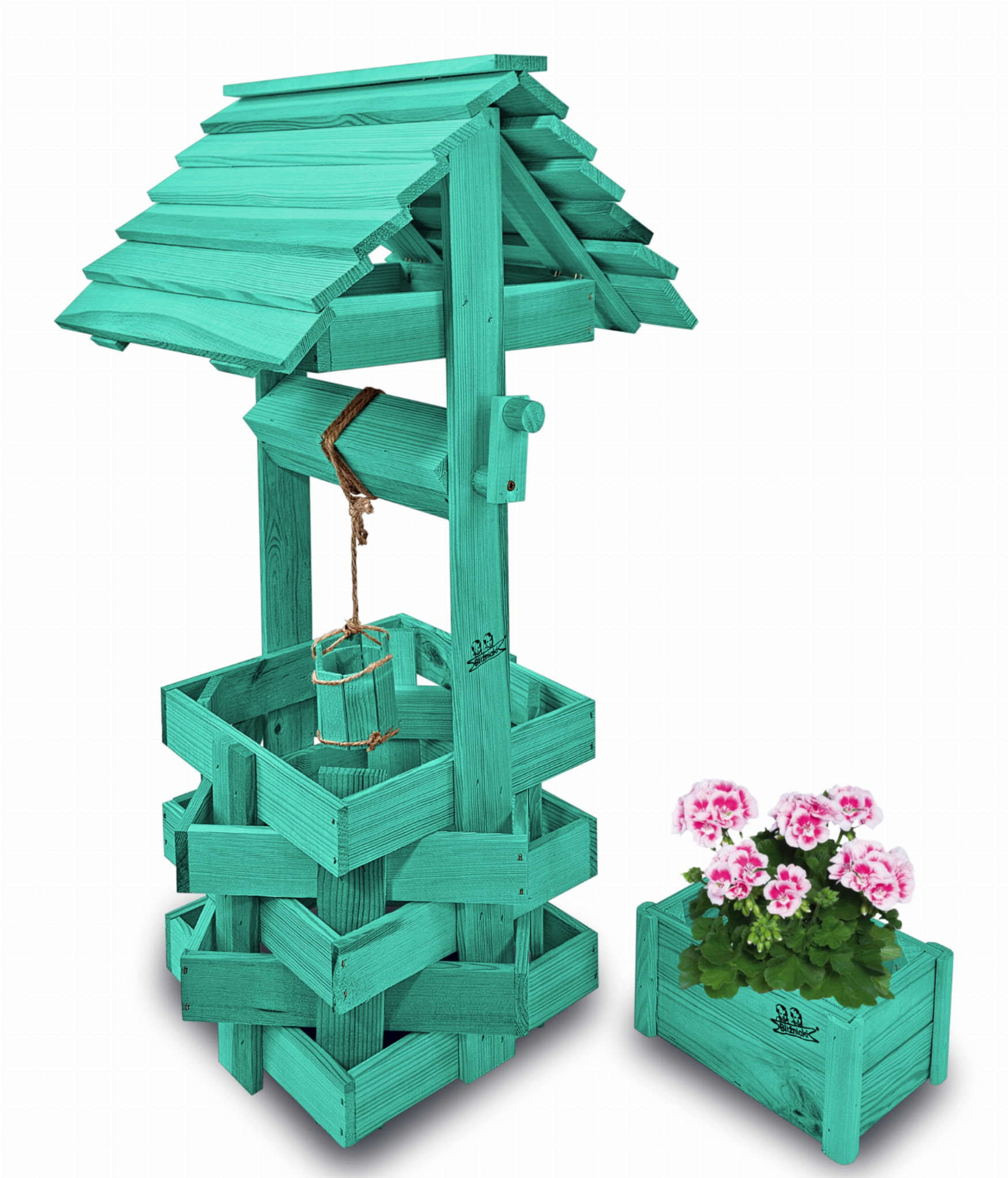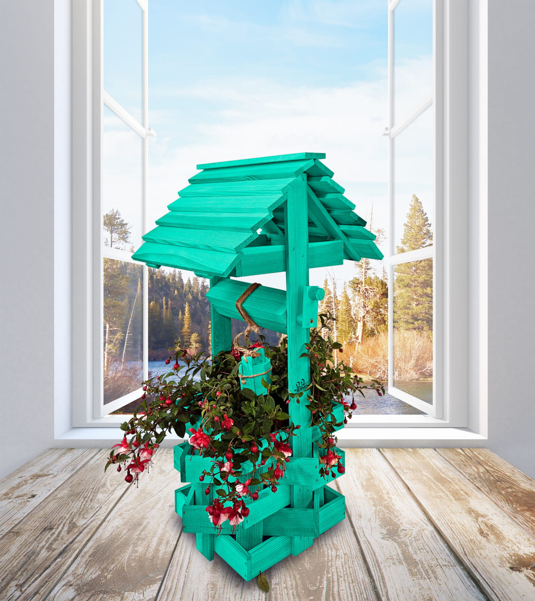 Drewniana studnia ogrodowa Dodatkowa skrzynka na kwiaty w zestawie Ozdobna donica na kwiaty Kolor morska zieleń Dekoracyjny kwietnik Drewniana studzienka do ogrodu Ozdobna donica do domu i ogrodu Drewniane studnie balkonowe tarasowe na pelargonie SC1 MR