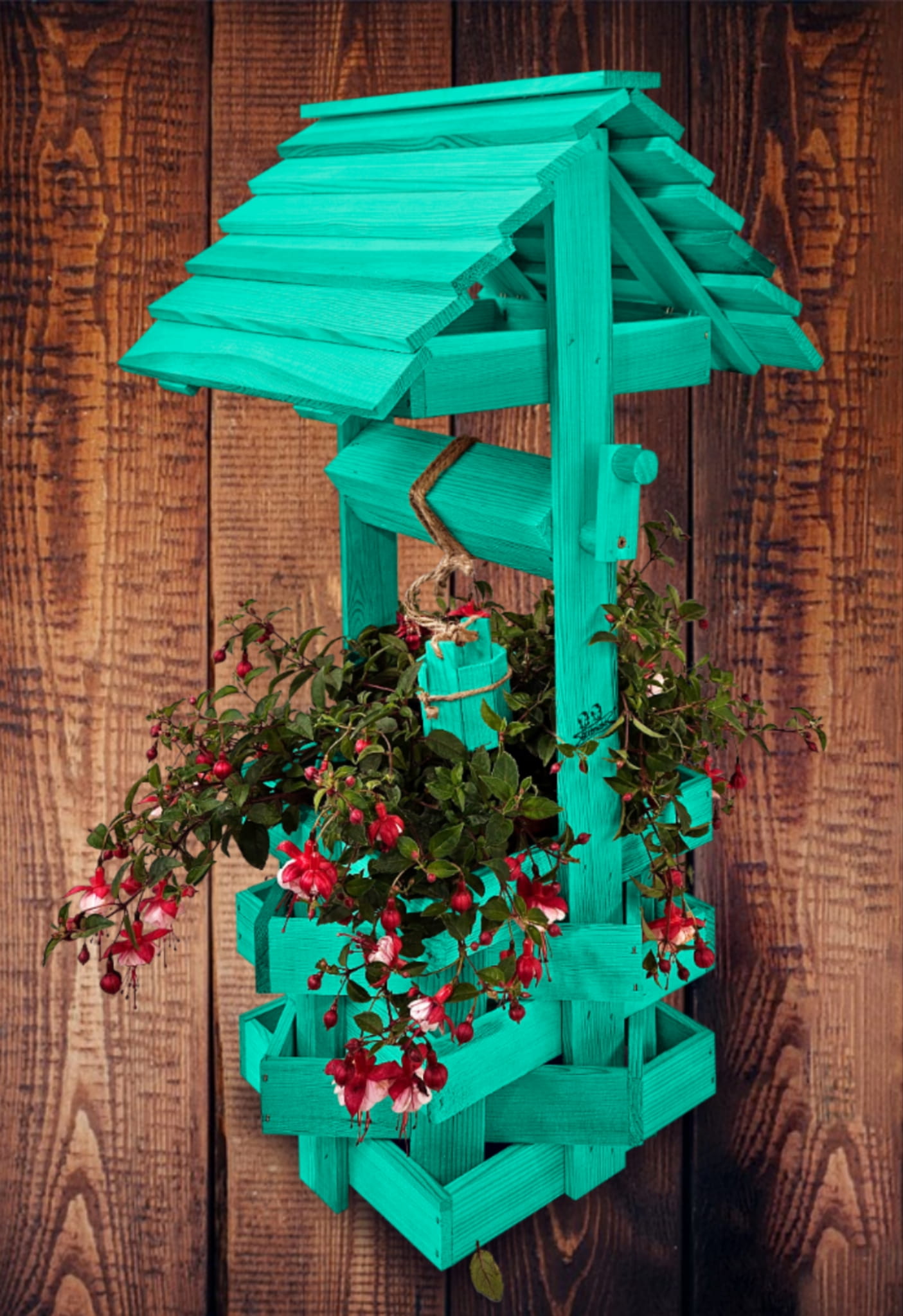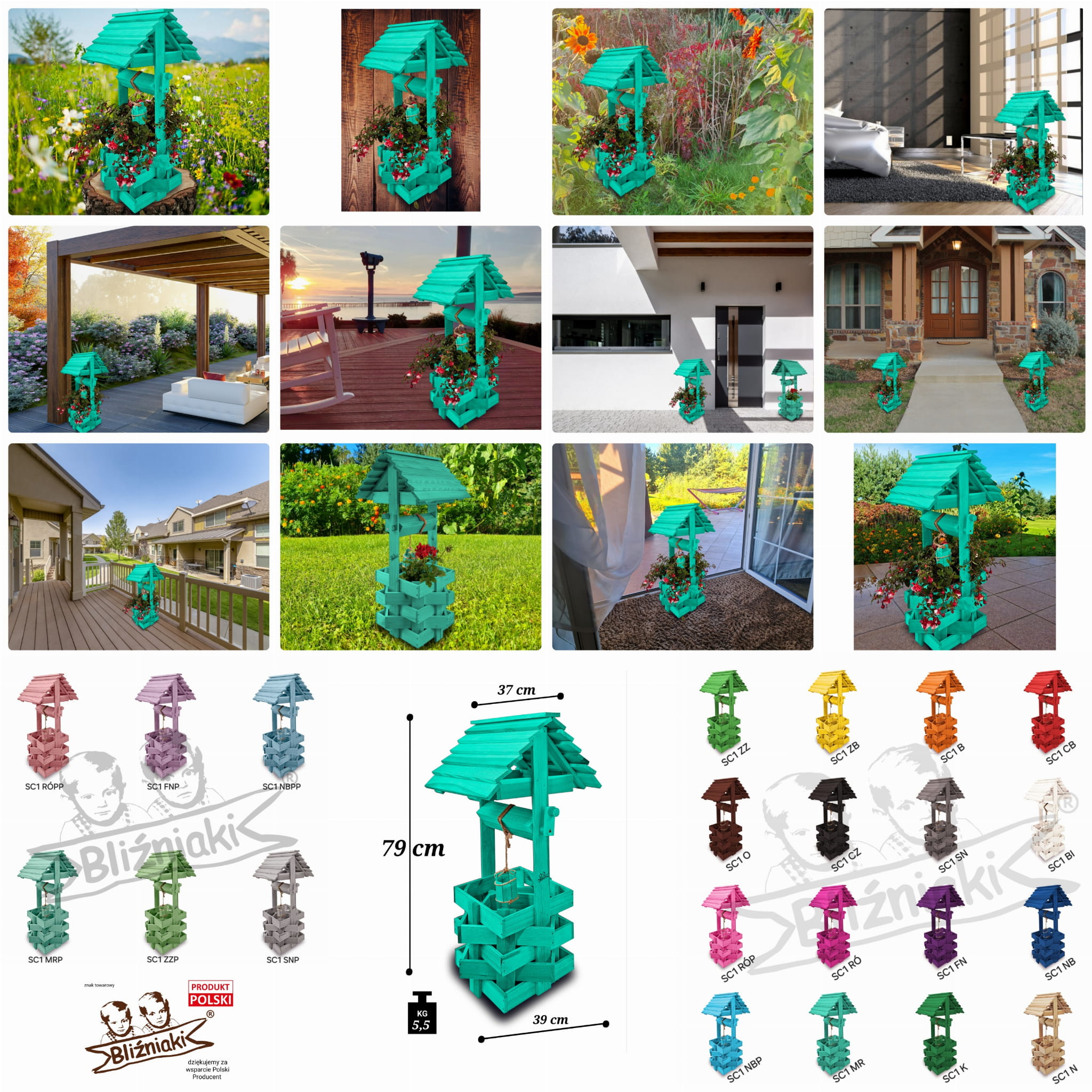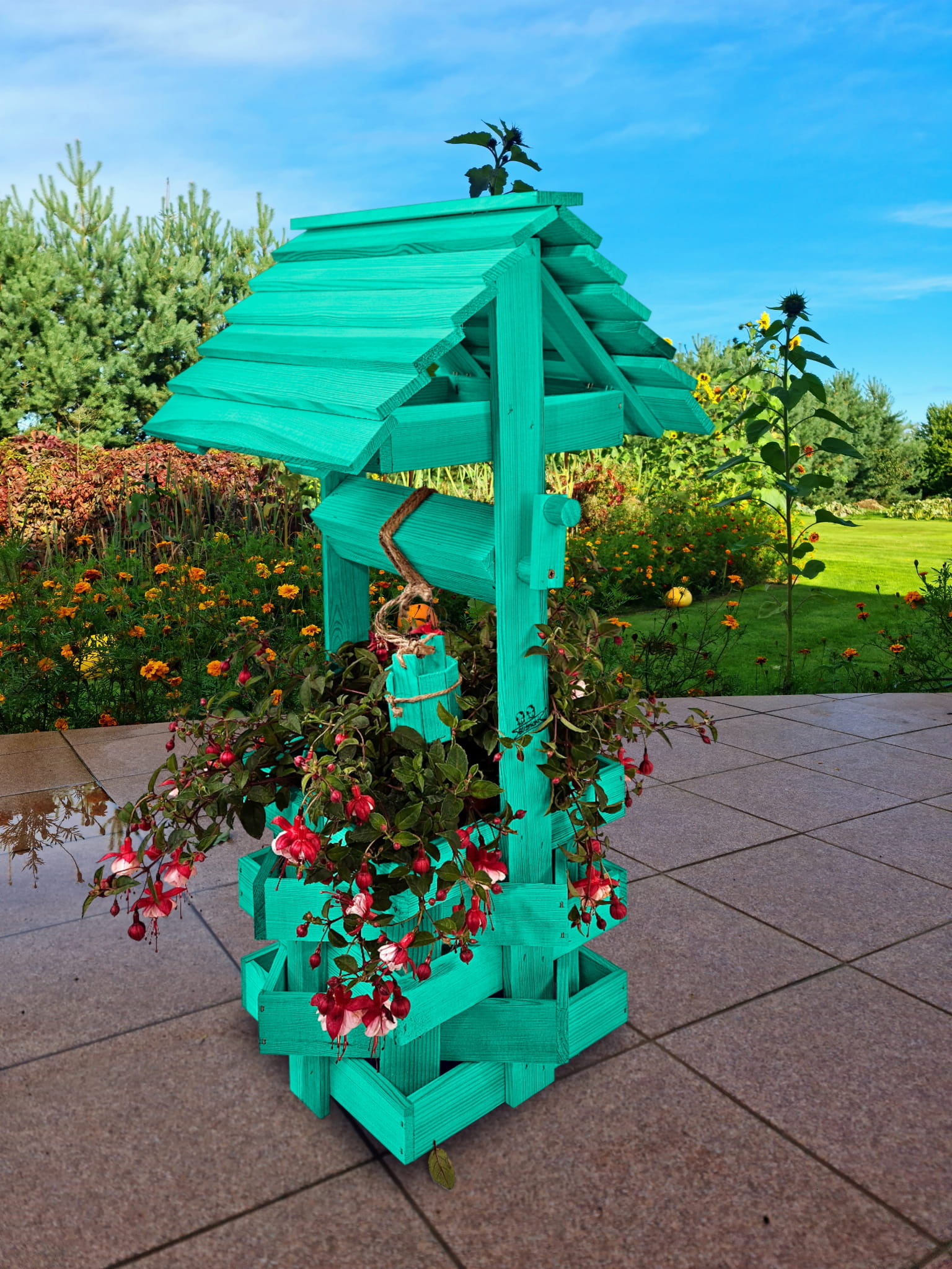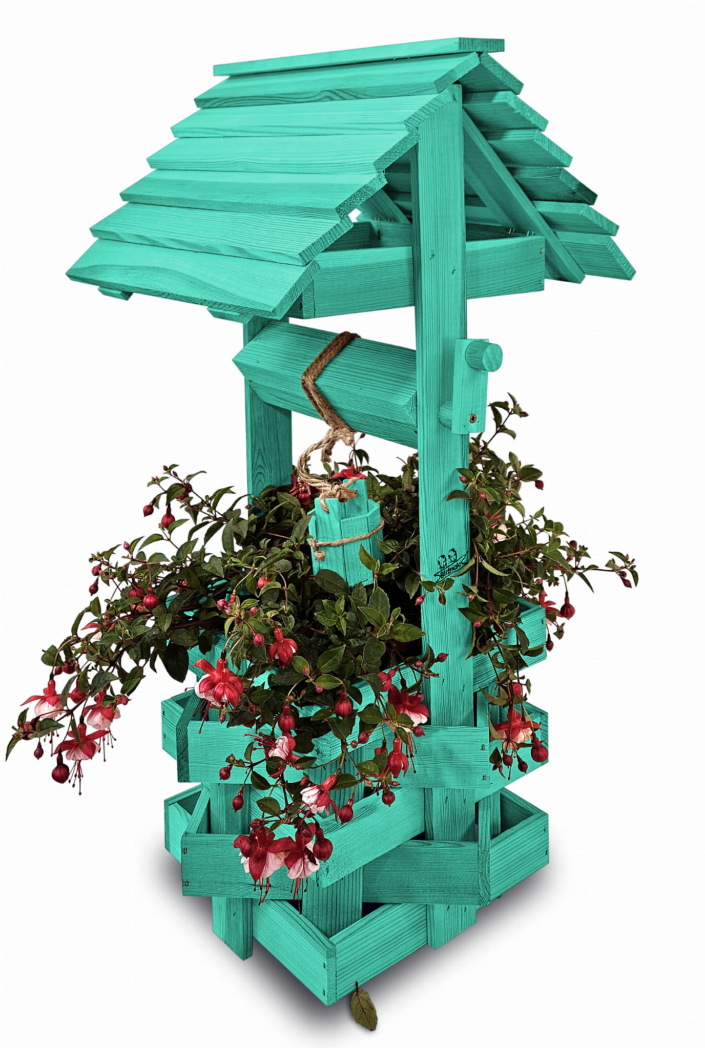 Drewniana studnia ogrodowa Dodatkowa skrzynka na kwiaty w zestawie Ozdobna donica na kwiaty Kolor morska zieleń Dekoracyjny kwietnik Drewniana studzienka do ogrodu Ozdobna donica do domu i ogrodu Drewniane studnie balkonowe tarasowe na pelargonie SC1 MR
