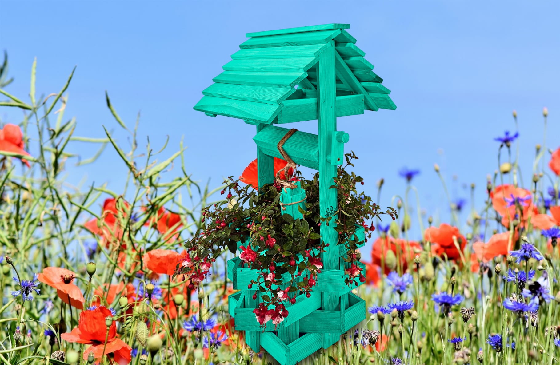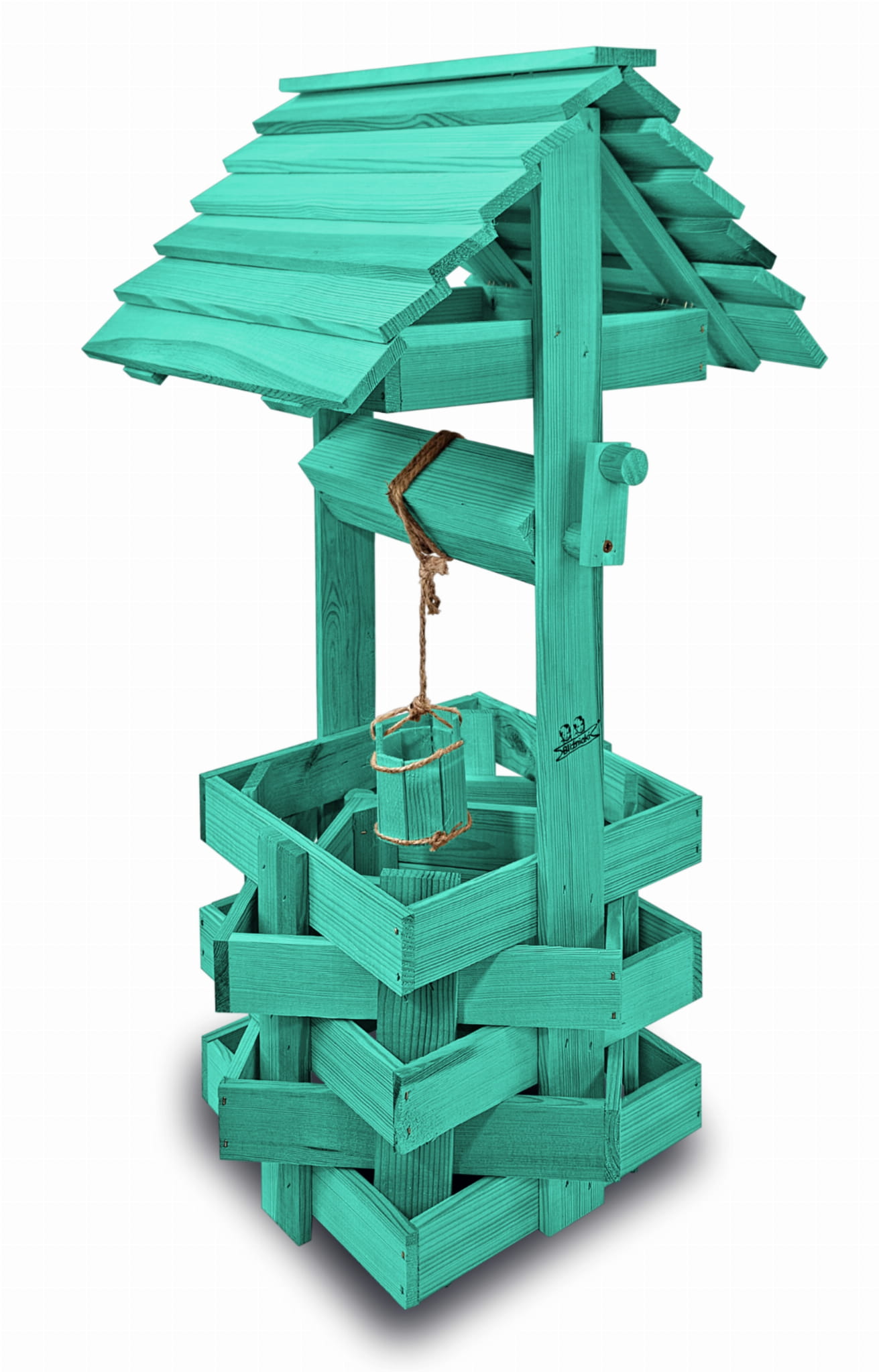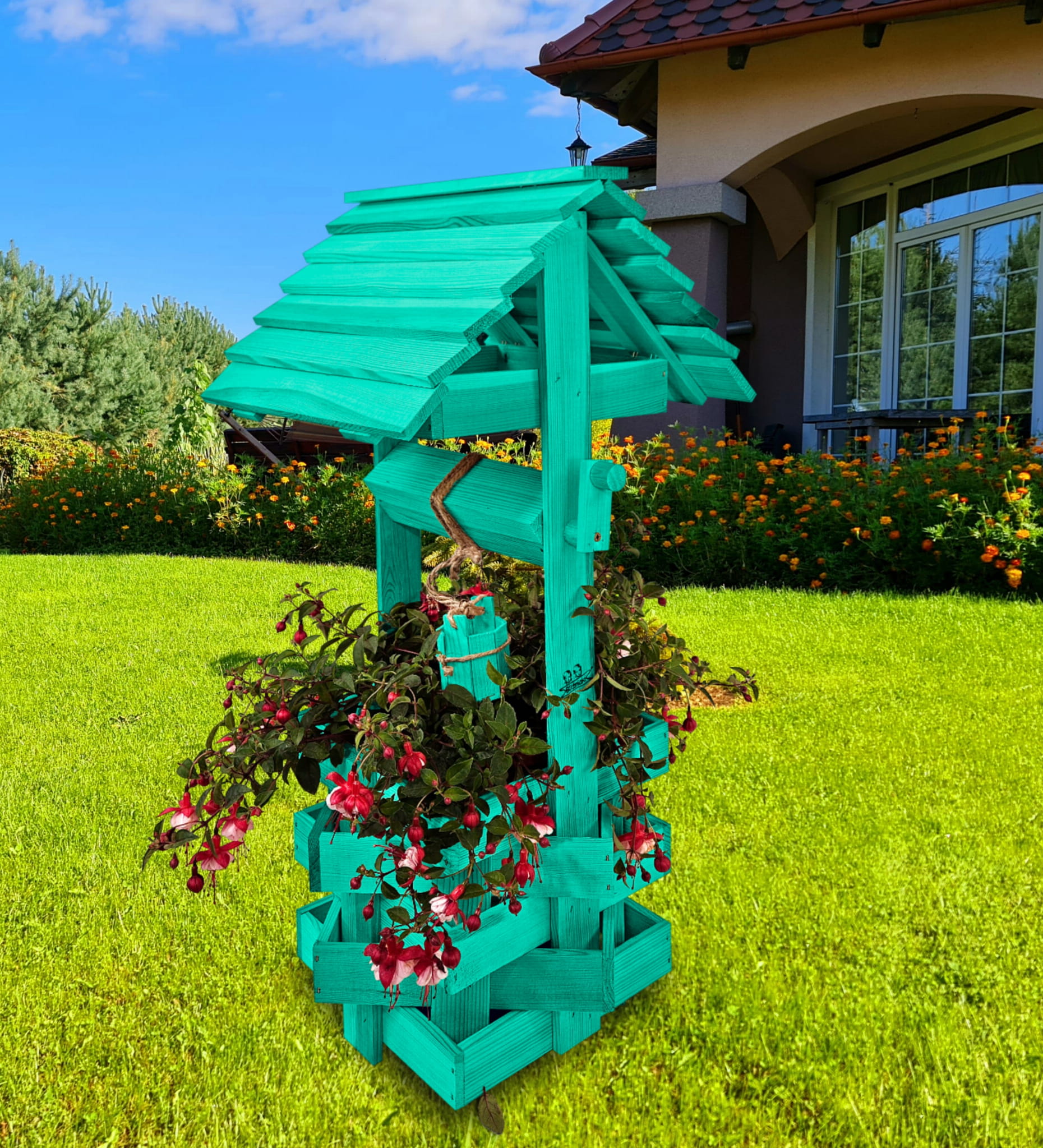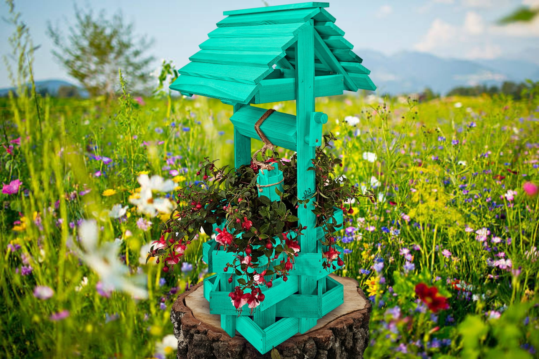 Drewniana studnia ogrodowa Dodatkowa skrzynka na kwiaty w zestawie Ozdobna donica na kwiaty Kolor morska zieleń Dekoracyjny kwietnik Drewniana studzienka do ogrodu Ozdobna donica do domu i ogrodu Drewniane studnie balkonowe tarasowe na pelargonie SC1 MR