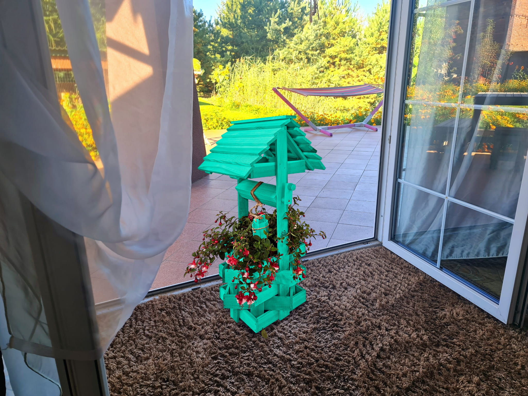 Do studni dołączona jest drewniana doniczka na kwiaty, utrzymana w tej samej estetyce, tworząc spójną i harmonijną całość.