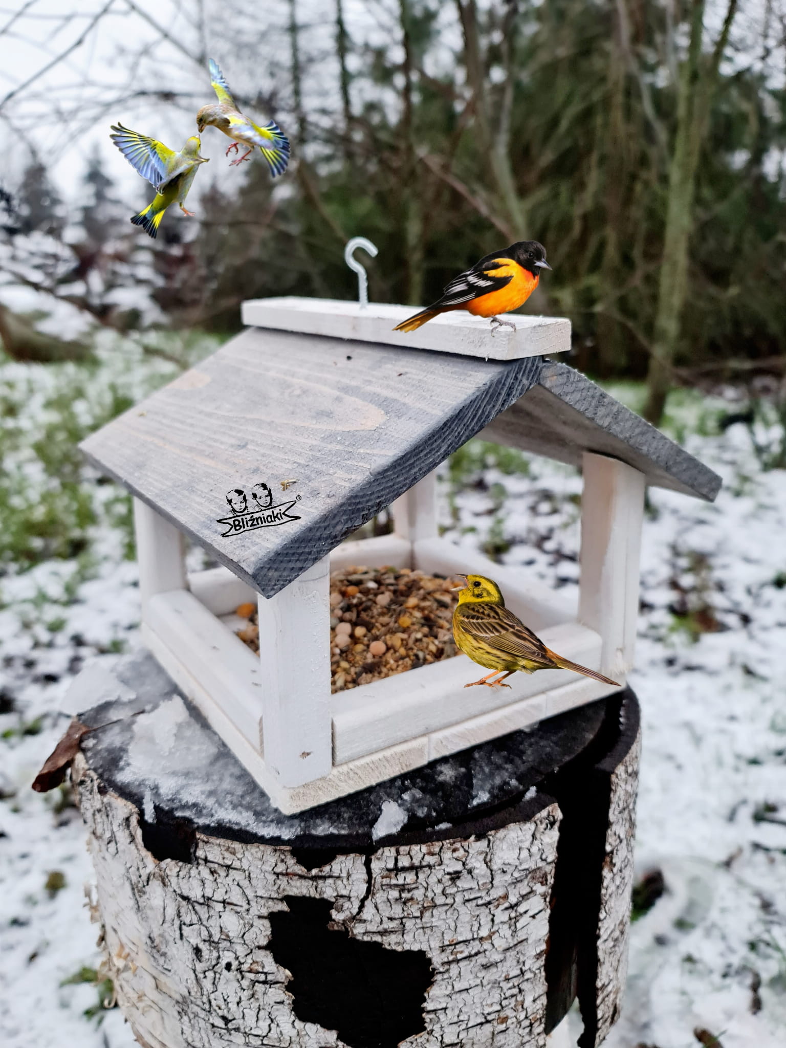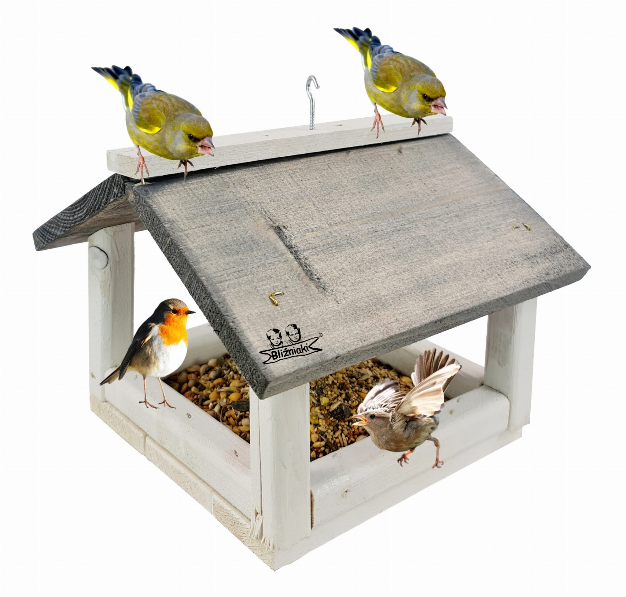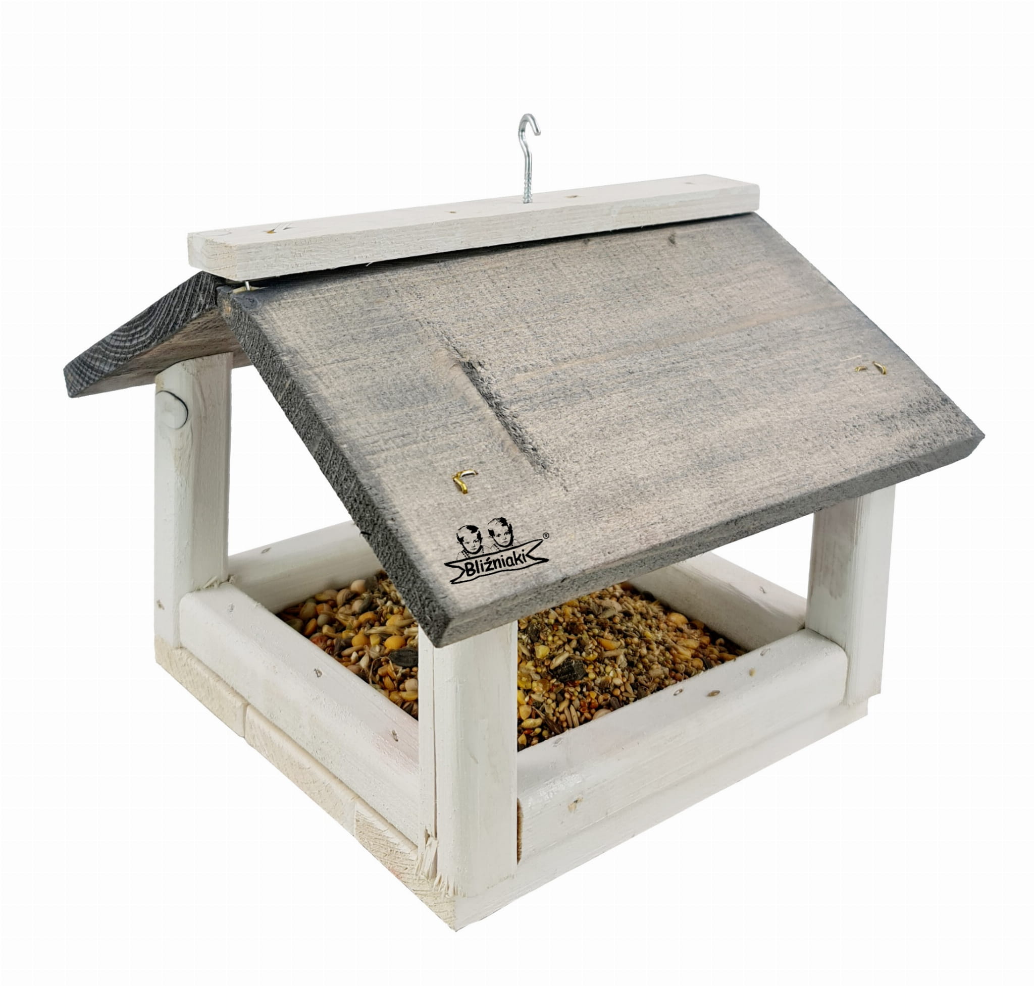 W przeważającej części karmnik jest w kolorze BIAŁYM, dach pokryty jest kolorem SZARYM.