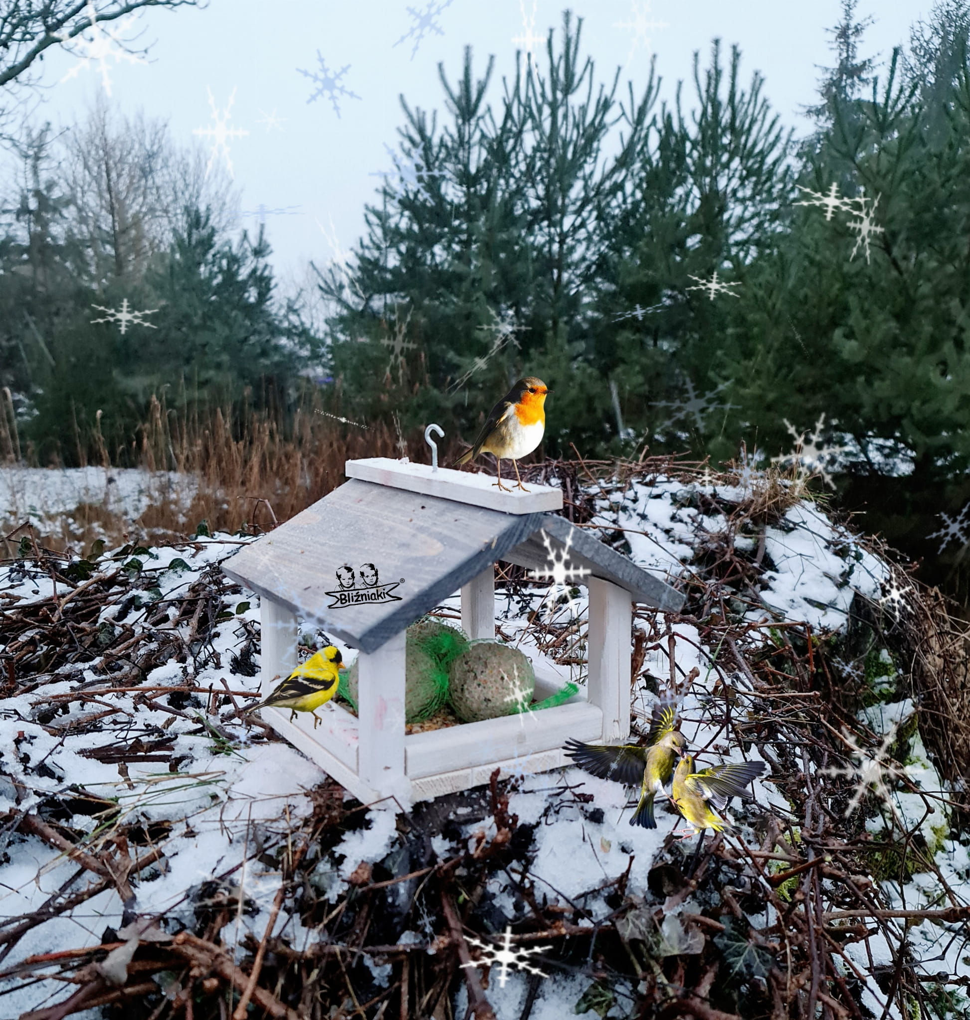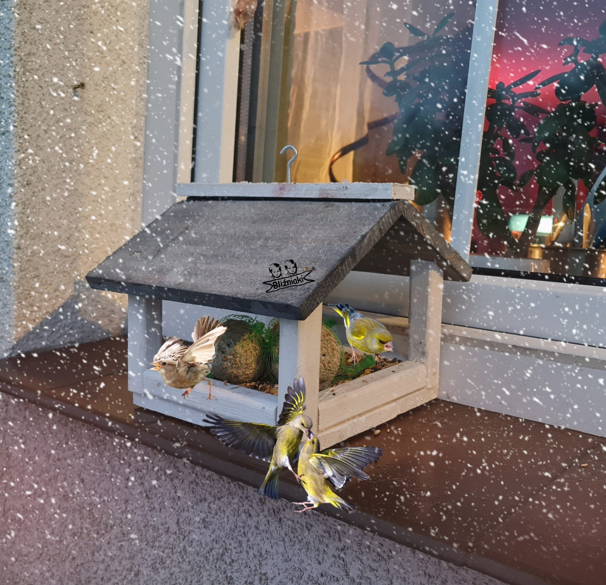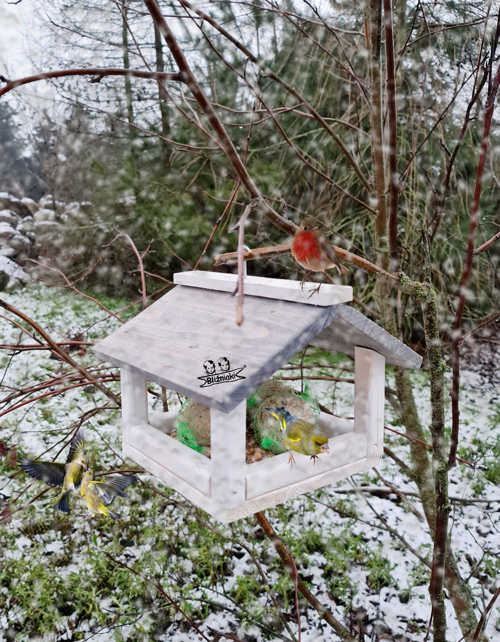 W przeważającej części karmnik jest w kolorze BIAŁYM, dach pokryty jest kolorem SZARYM.
