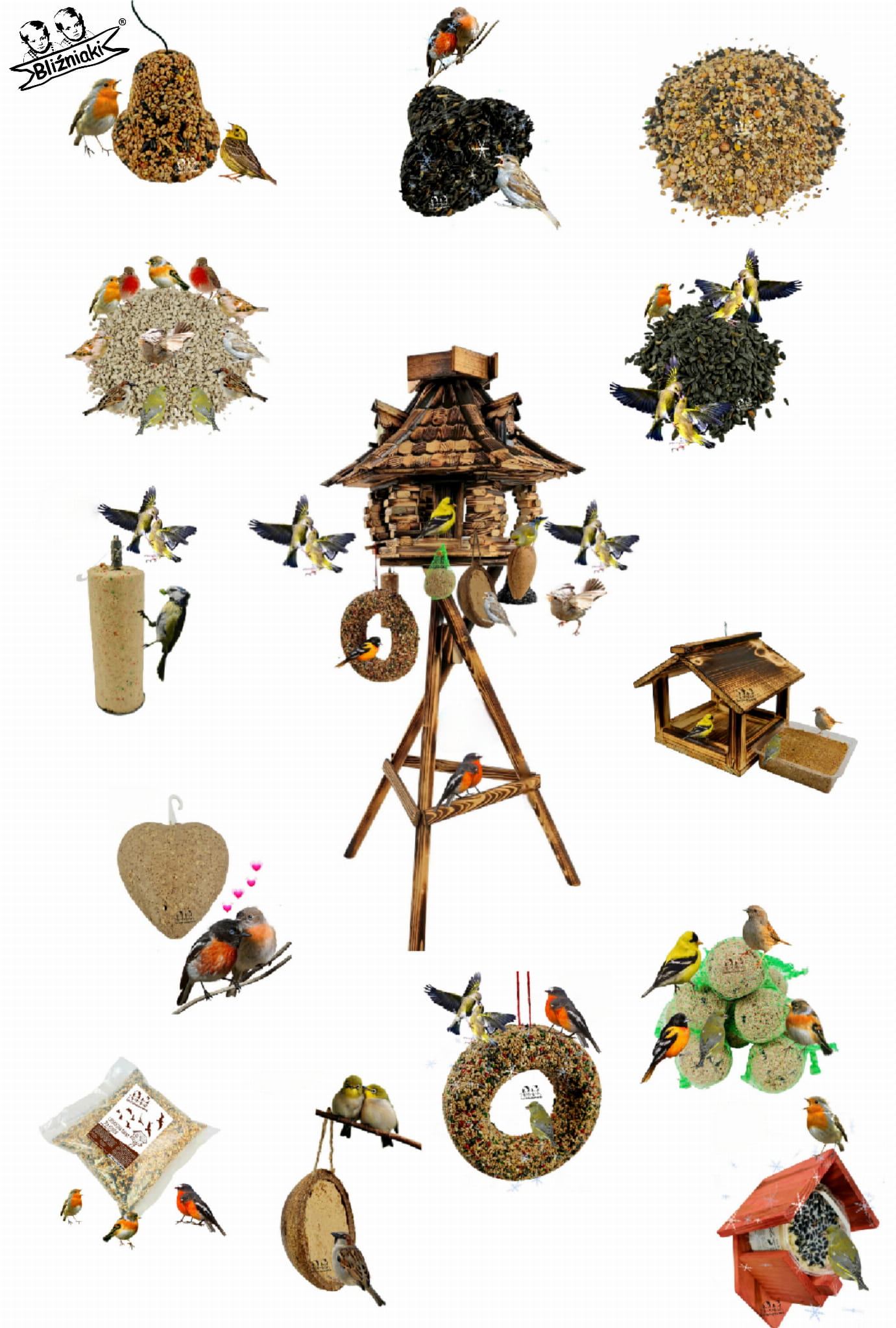 słonecznik ziarnisty łuszczony i niełuszczony, i wiele innych smakołyków w wygodnej formie pozwalającej powiesić produkt w dowolnym miejscu w ogrodzie, a także niezbędne do dokarmiania ptaków karmniki.