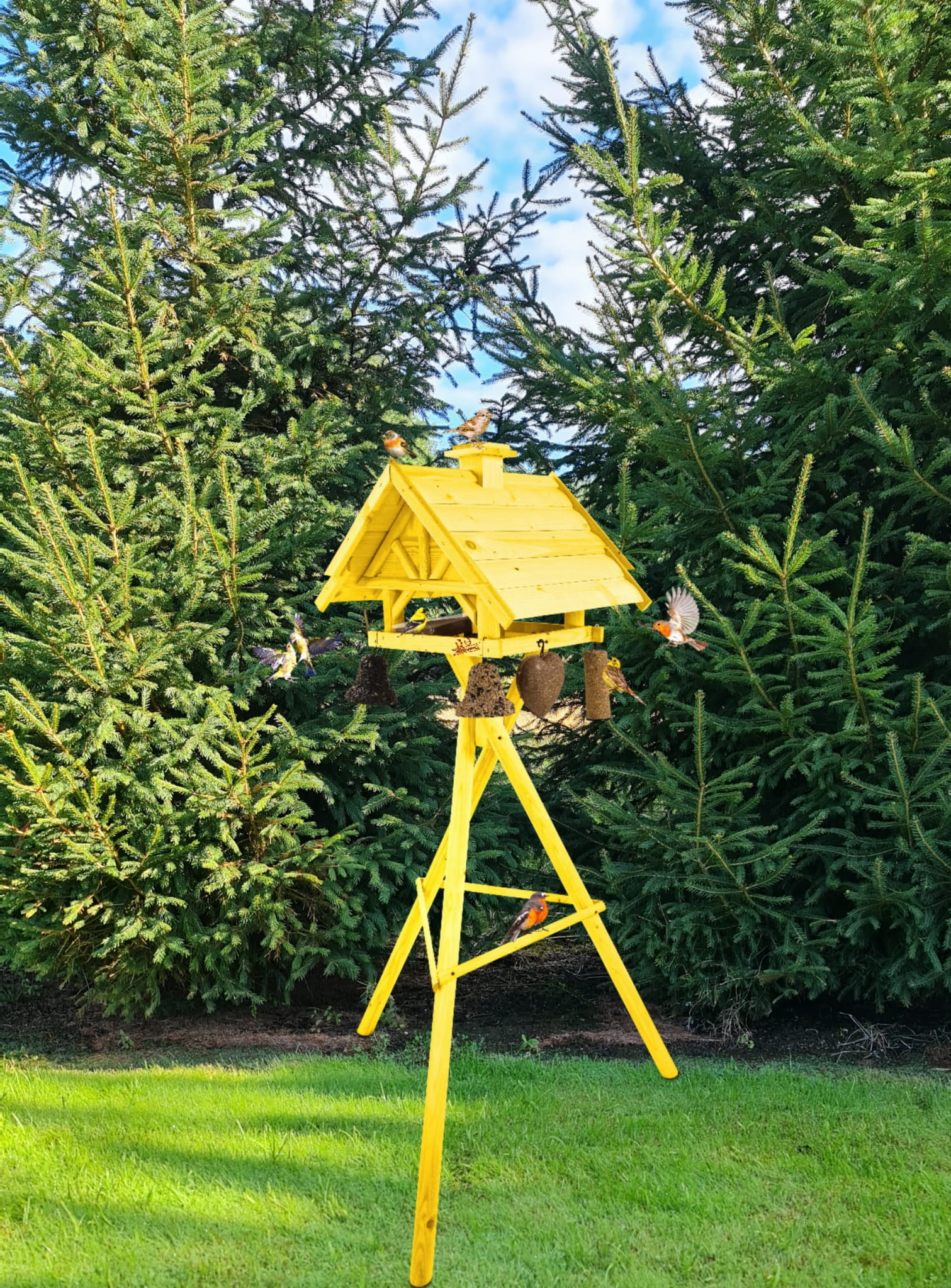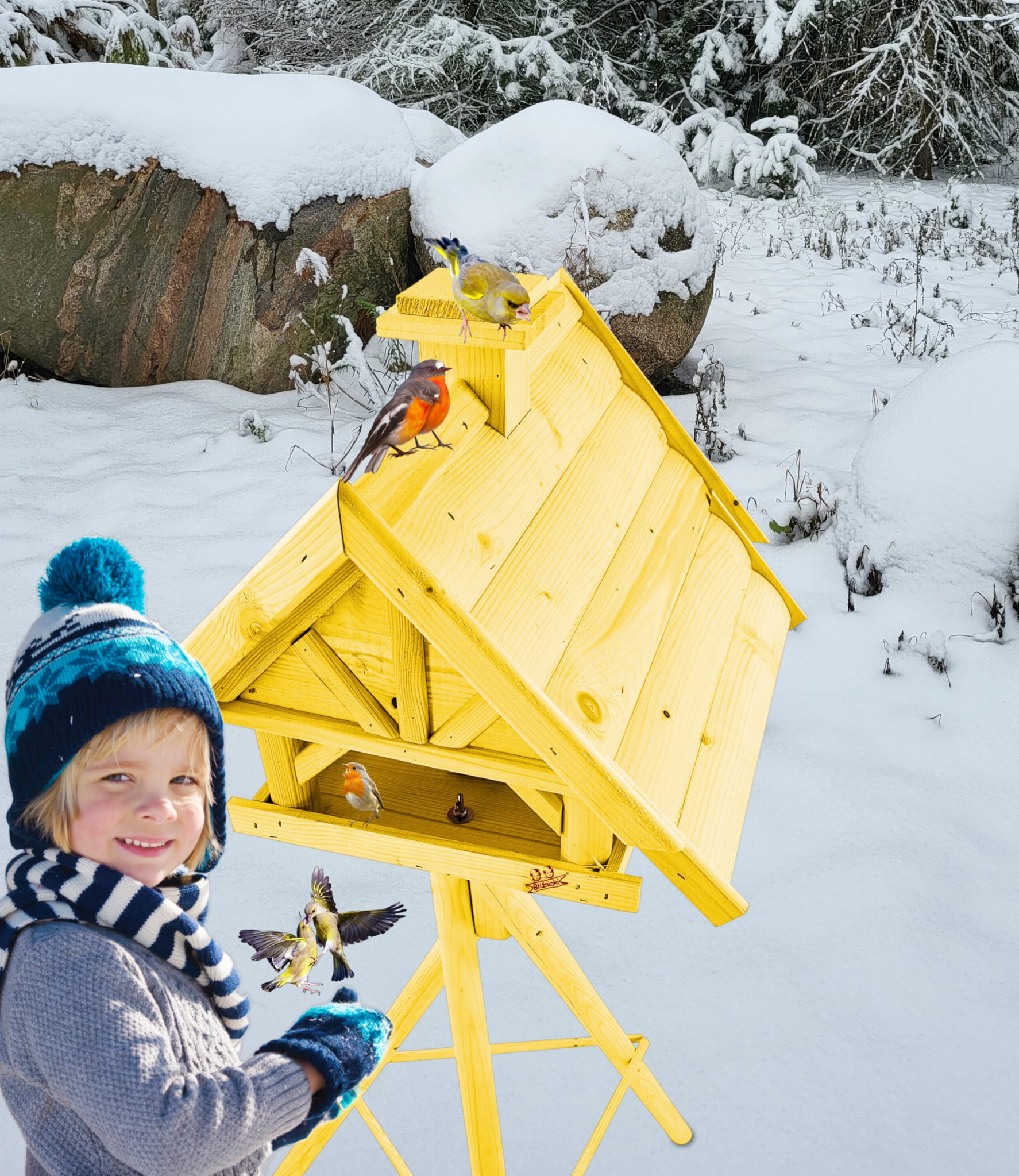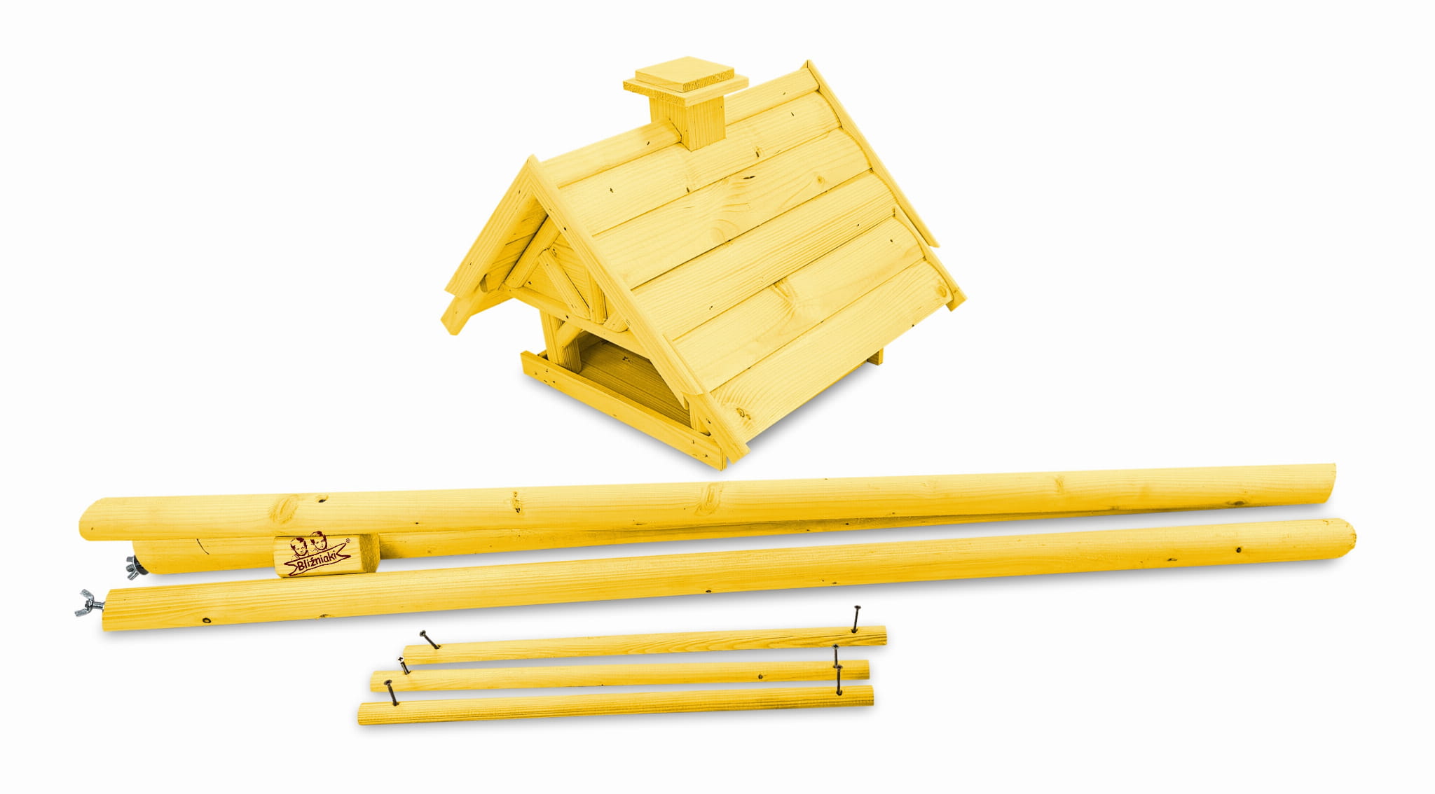 Produkt jest w całości wykonany z wytrzymałego, suszonego drewna sosnowego. Został pokryty impregnatem, który jest wykonany na bazie barwników roślinnych, co czyni go ekologicznym i przyjaznym dla ludzi i zwierząt. Karmnik wykończony jest kolorem ŻÓŁTYM.
