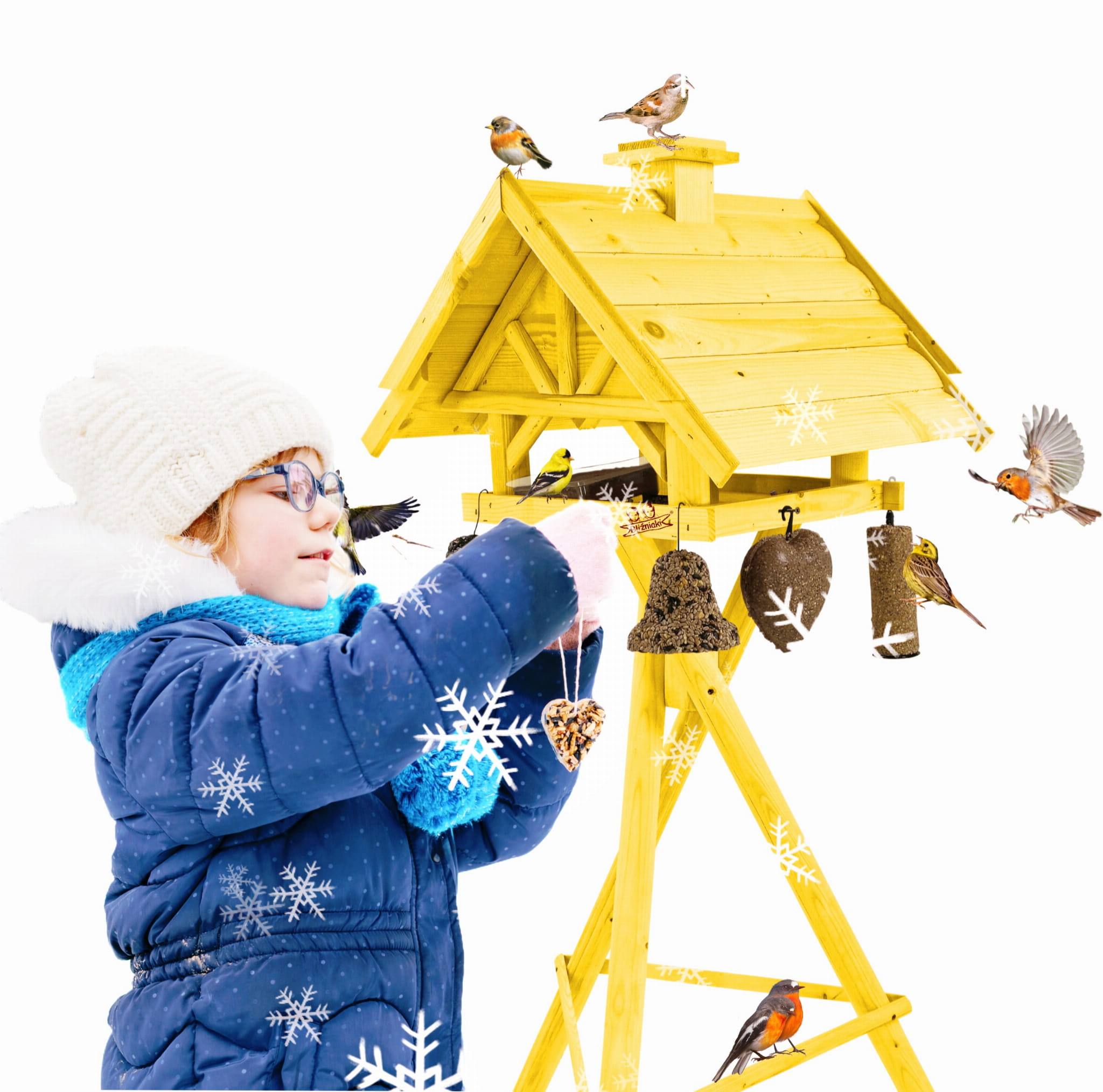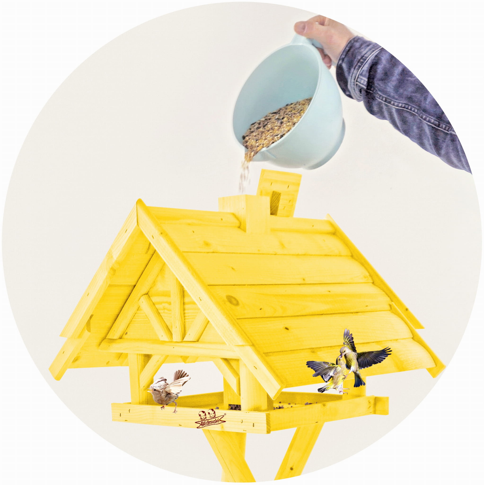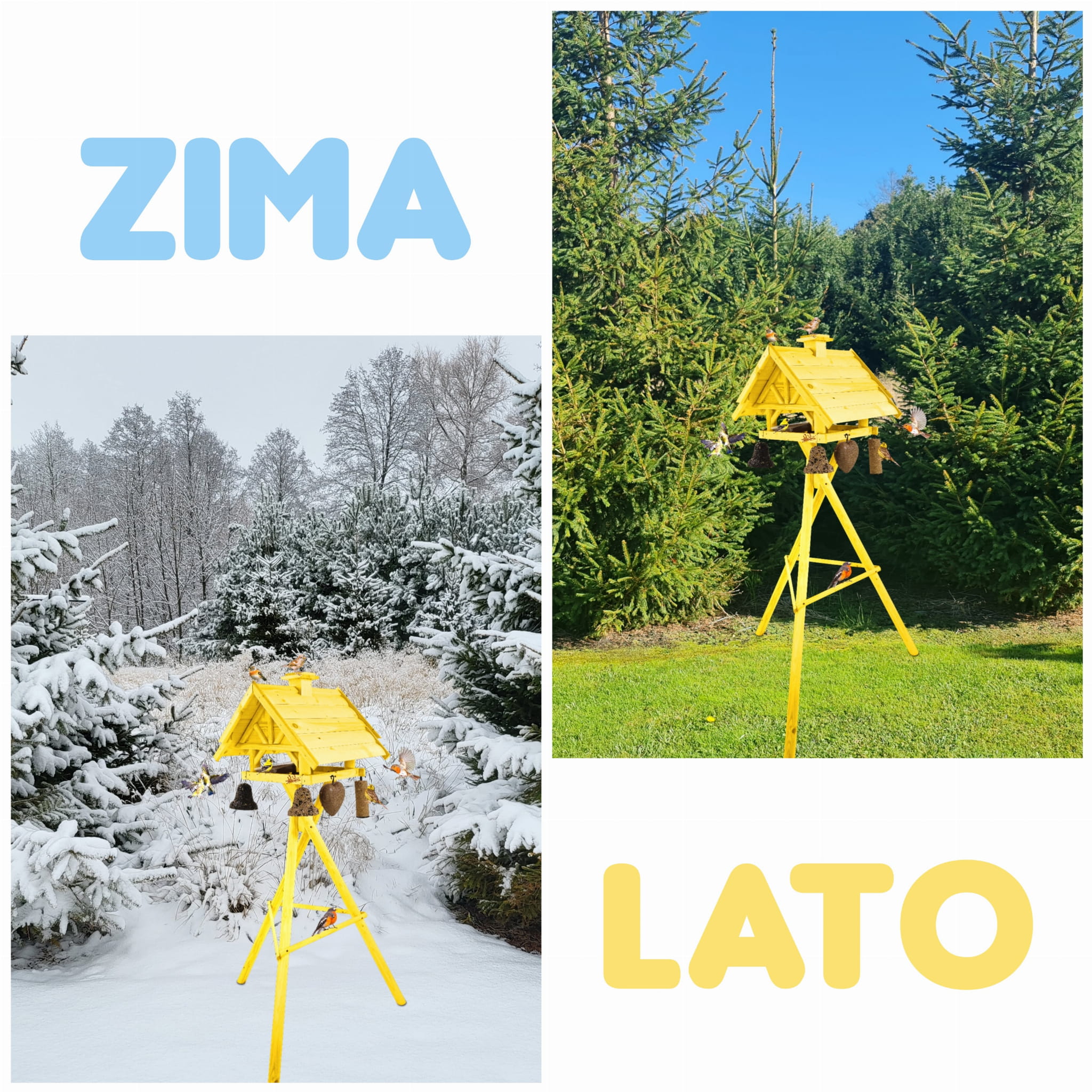 Produkt jest w całości wykonany z wytrzymałego, suszonego drewna sosnowego. Został pokryty impregnatem, który jest wykonany na bazie barwników roślinnych, co czyni go ekologicznym i przyjaznym dla ludzi i zwierząt. Karmnik wykończony jest kolorem ŻÓŁTYM.