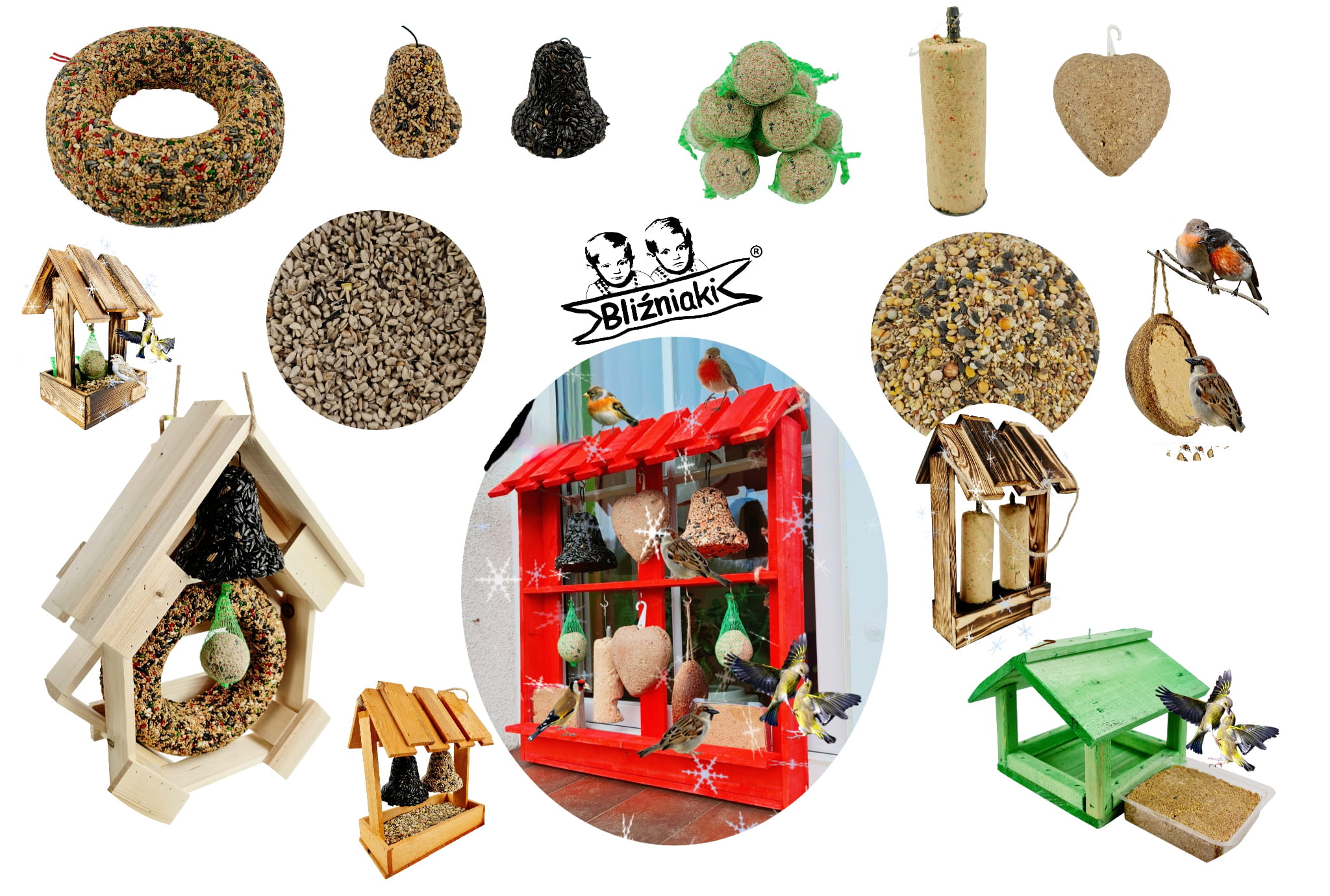 słonecznik ziarnisty łuszczony i niełuszczony, i wiele innych smakołyków w wygodnej formie pozwalającej powiesić produkt w dowolnym miejscu w ogrodzie, a także niezbędne do dokarmiania ptaków karmniki.