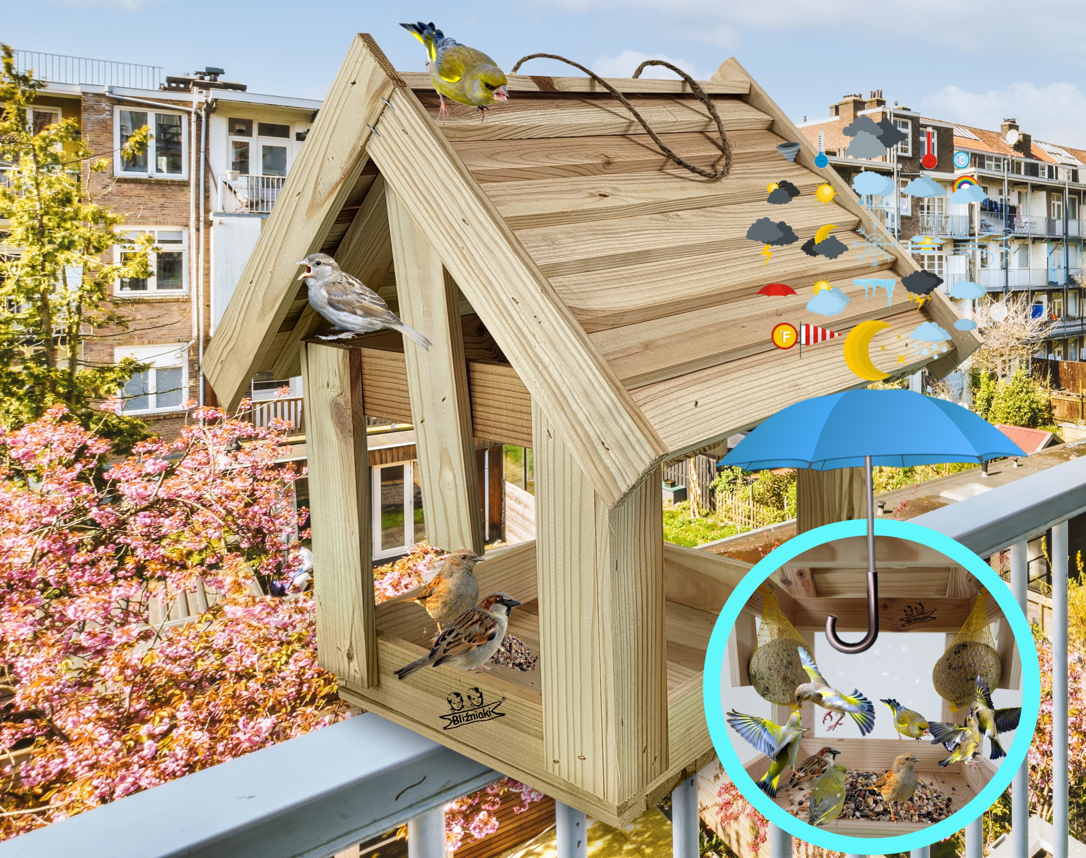 - Posiada szeroki dach chroniący karmę przed deszczem oraz innymi czynnikami atmosferycznymi