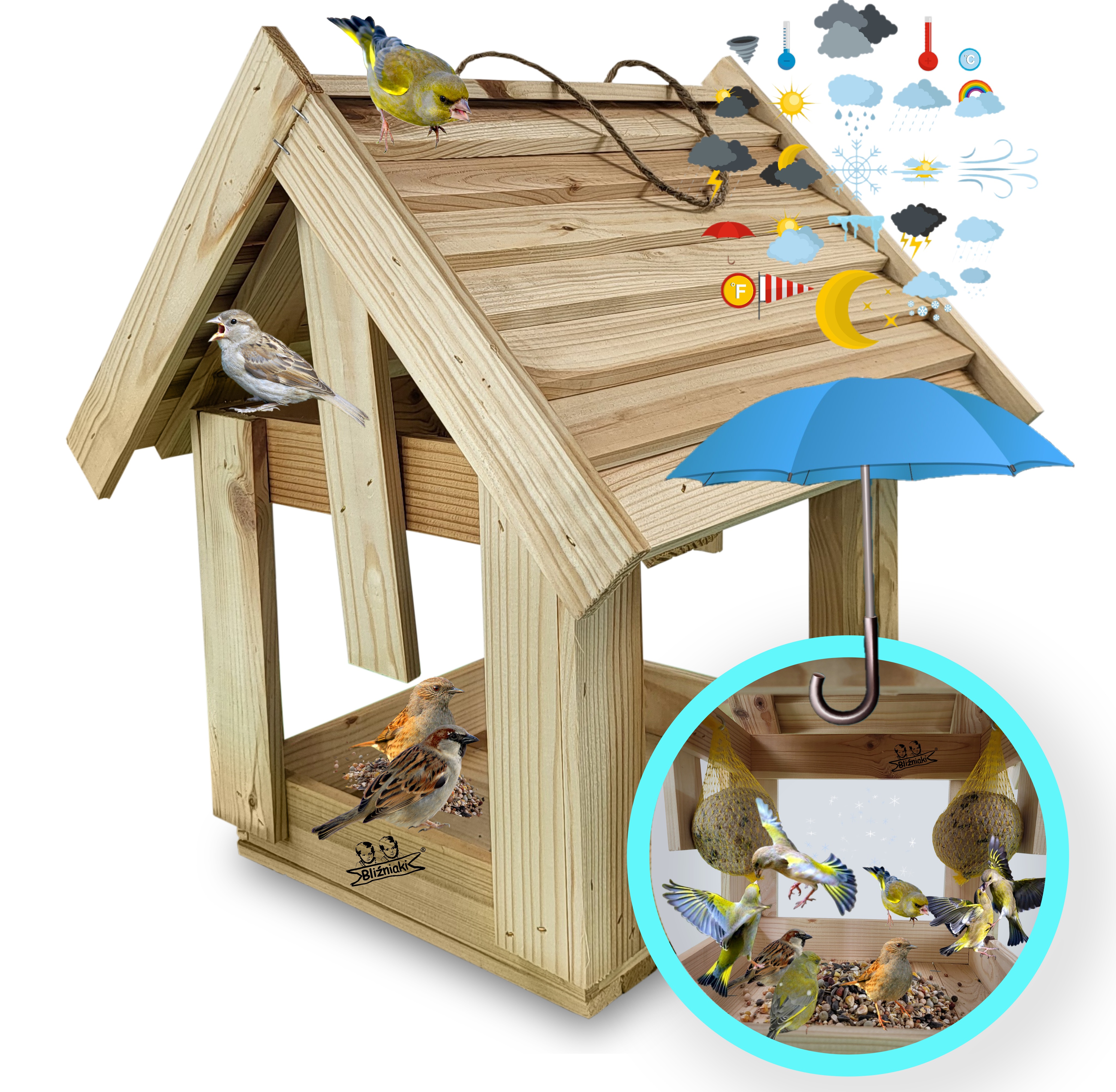 Karmnik w wersji NATURALNE DREWNO jest zabezpieczony metodą impregnowania. Środek na bazie wody użyty do impregnacji jest w pełni ekologiczny i bezpieczny dla ludzi i zwierząt. Zabezpieczone w taki sposób drewno sprawia, że karmnik jest odporny na szkodliwe działanie wody oraz wilgoci, promieni UV, a także grzybów i pleśni, może być więc przechowywany przez cały rok na zewnątrz.
