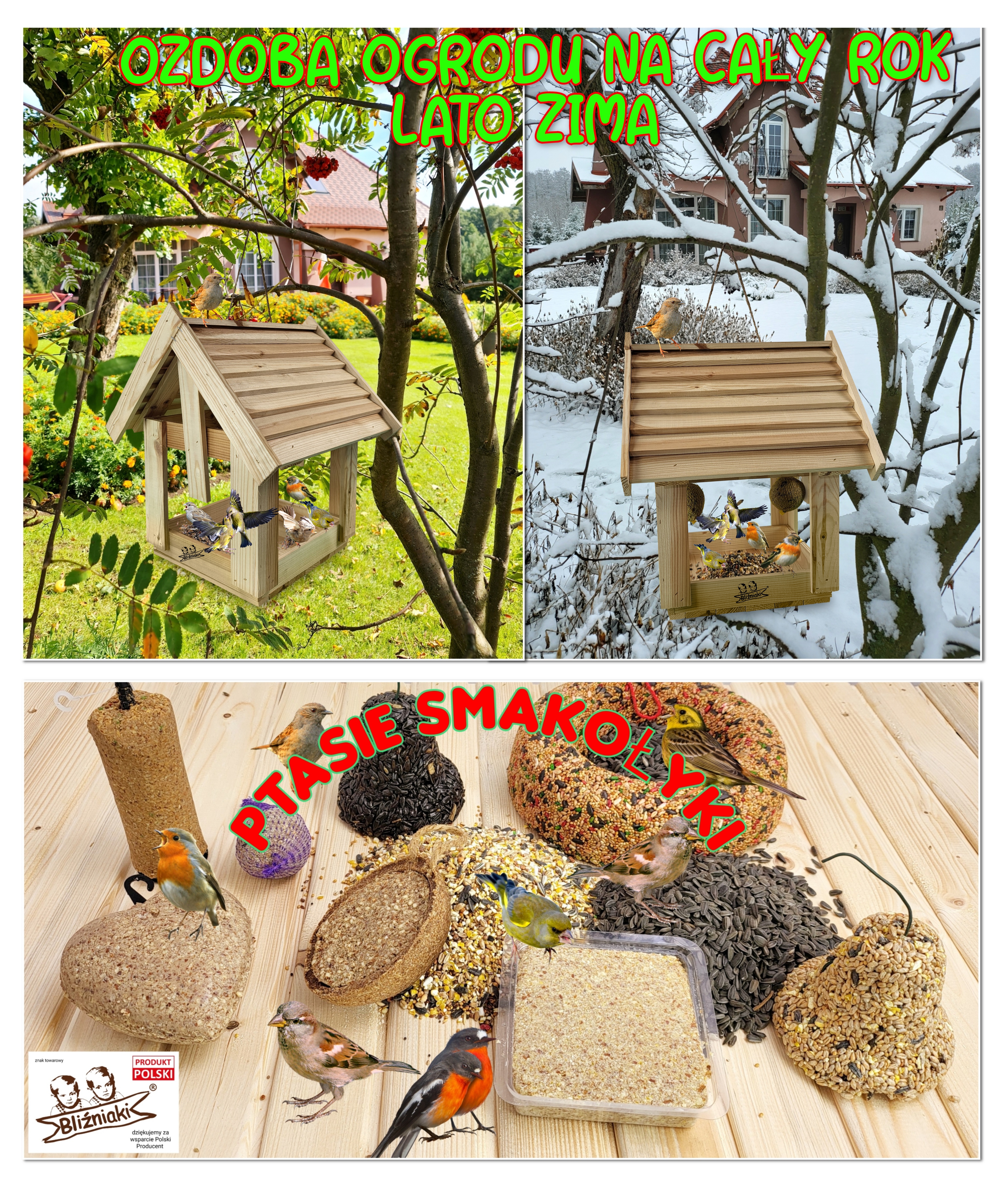 słonecznik ziarnisty łuszczony i niełuszczony, i wiele innych smakołyków w wygodnej formie pozwalającej powiesić produkt w dowolnym miejscu w ogrodzie, a także niezbędne do dokarmiania ptaków karmniki.