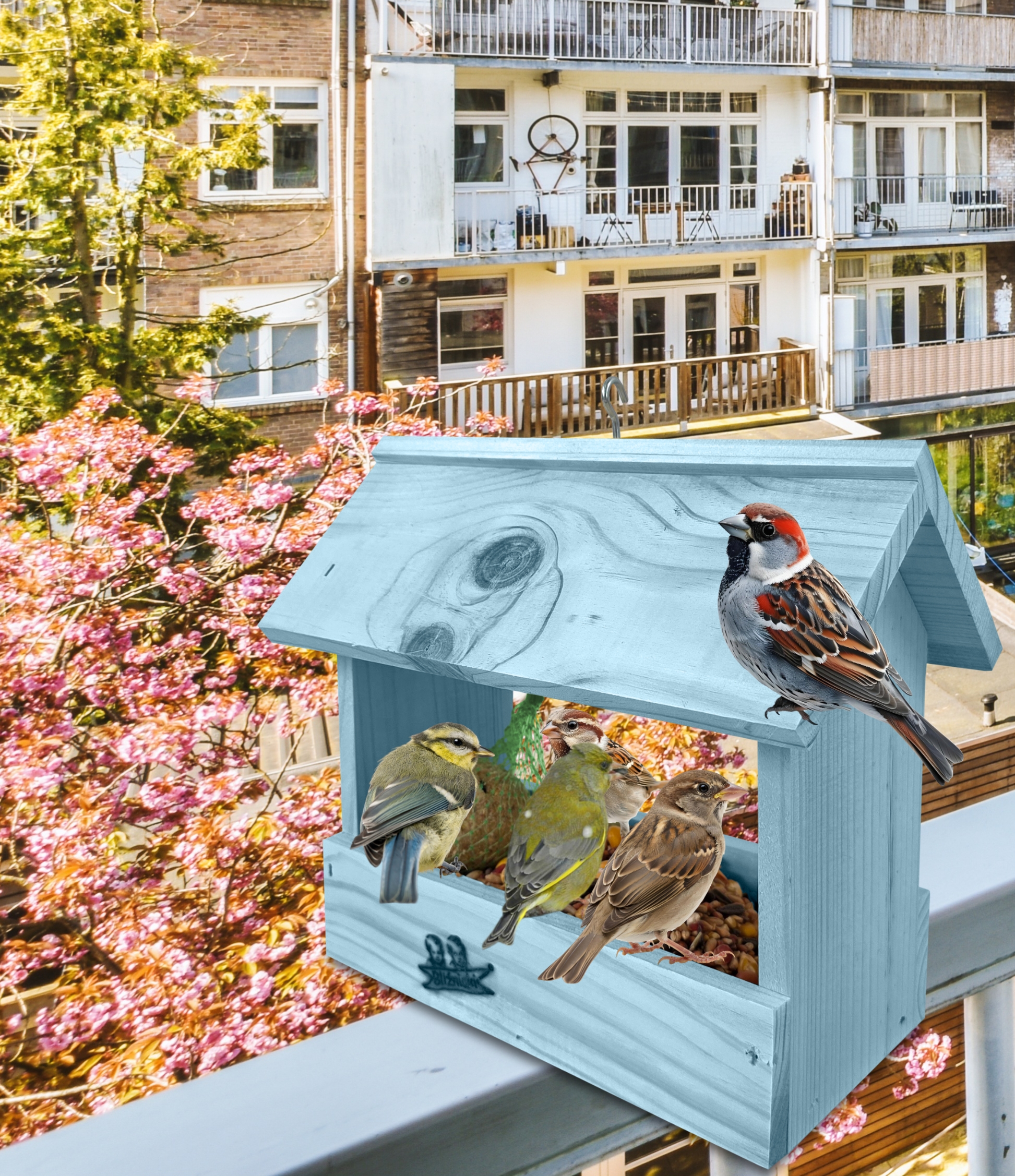 Przedmiotem sprzedaży jest ozdobny drewniany karmnik dla ptaków budka domek na balkon K204 NBPP kolor pastelowy niebieski