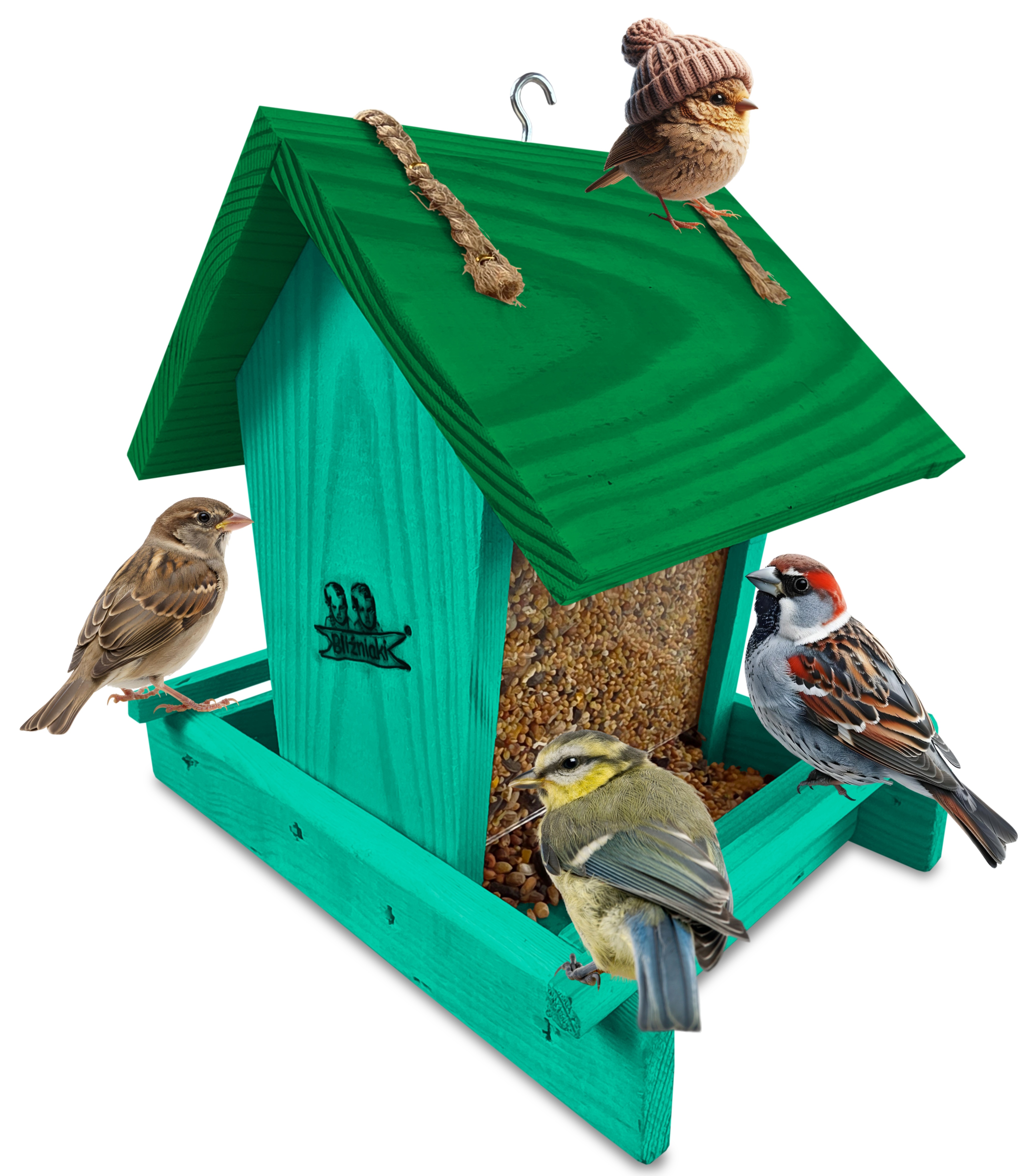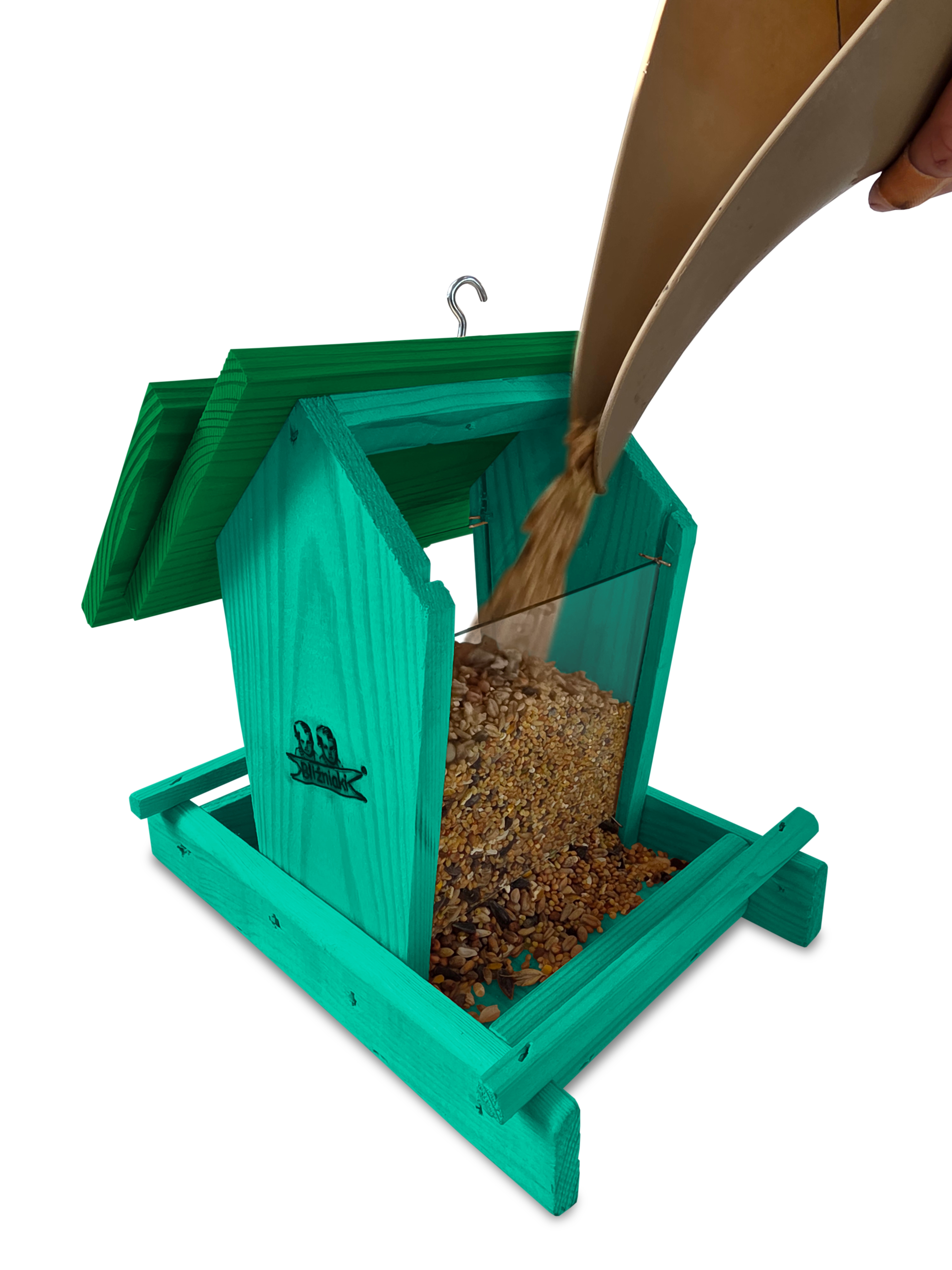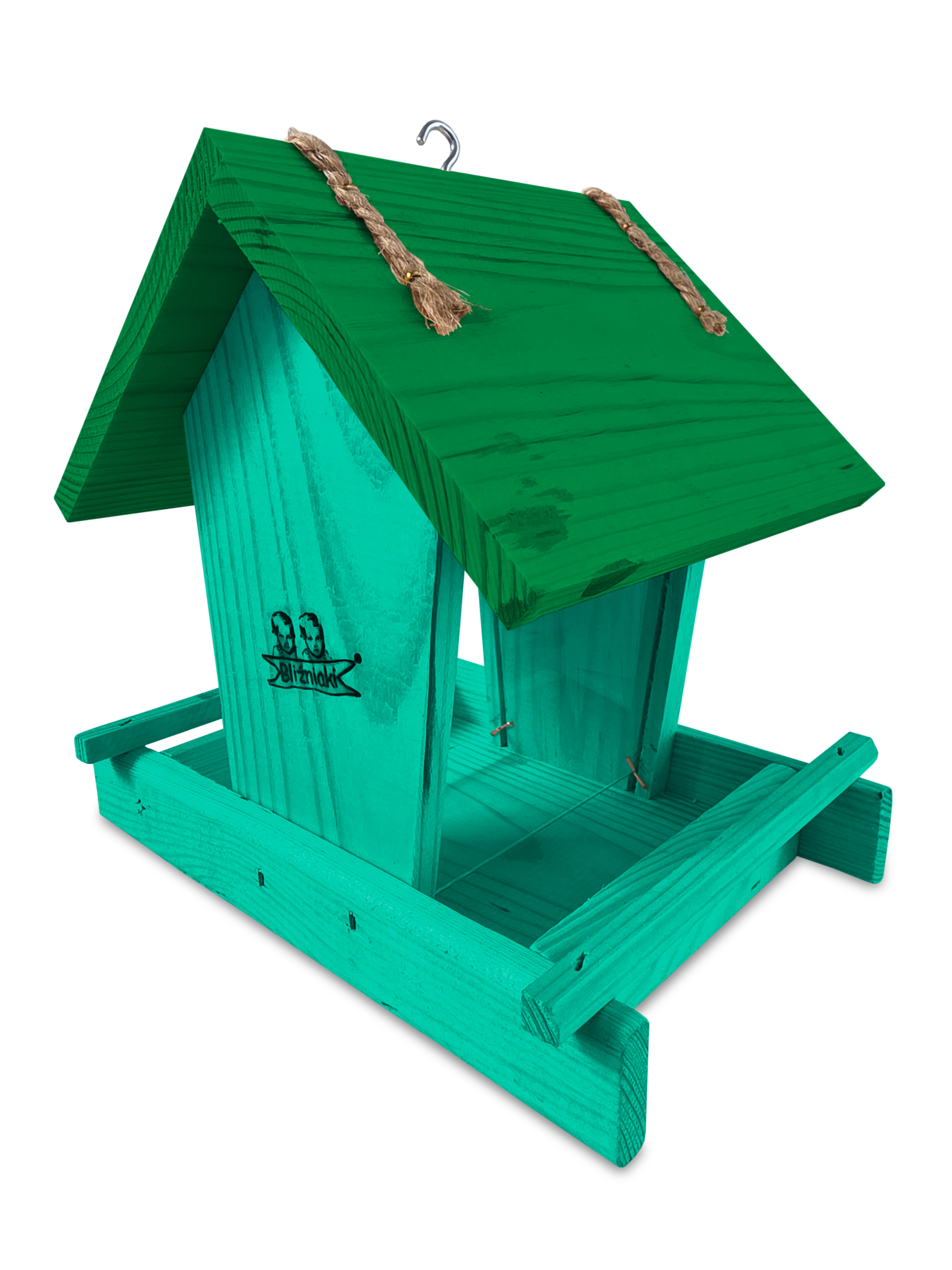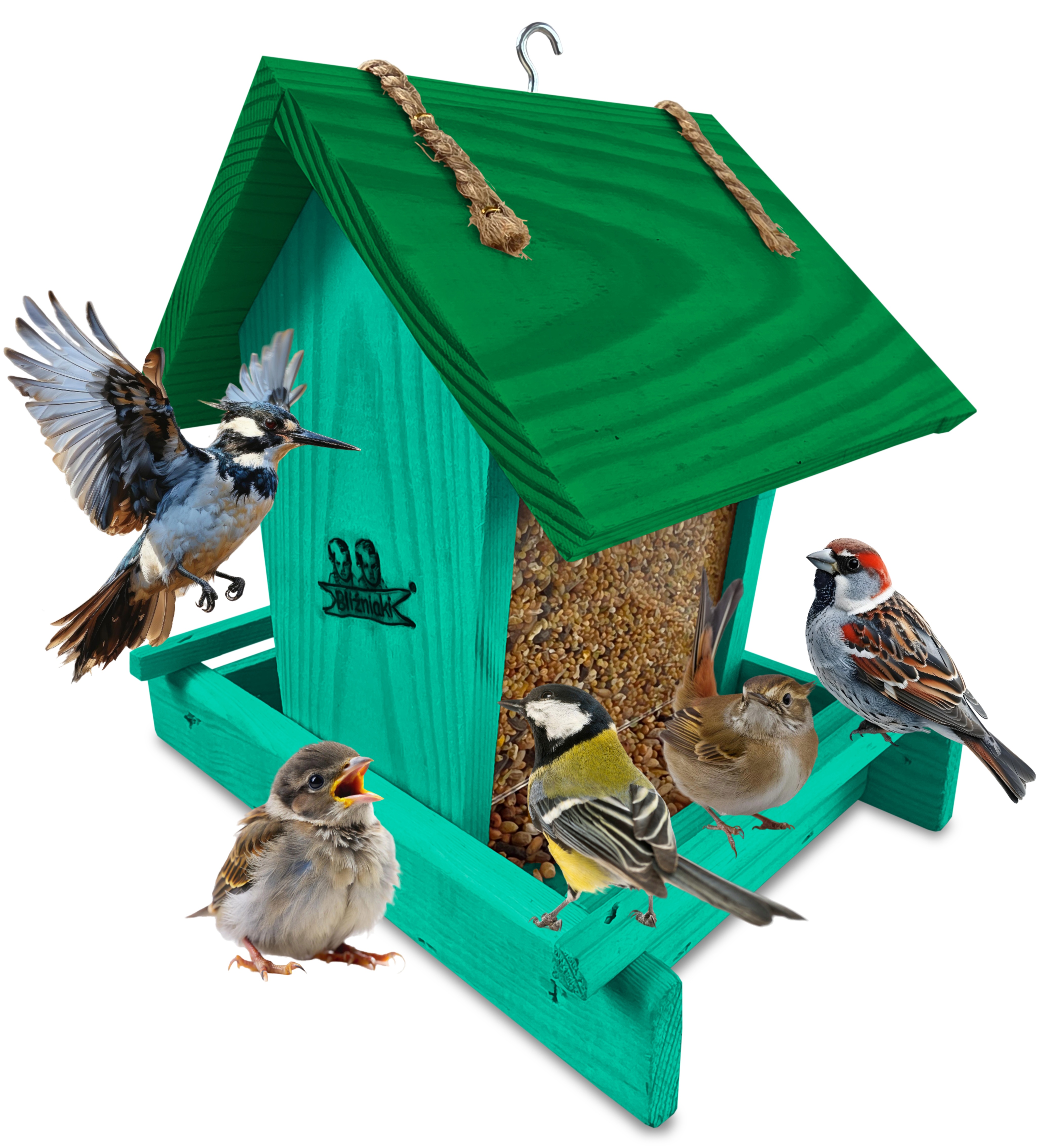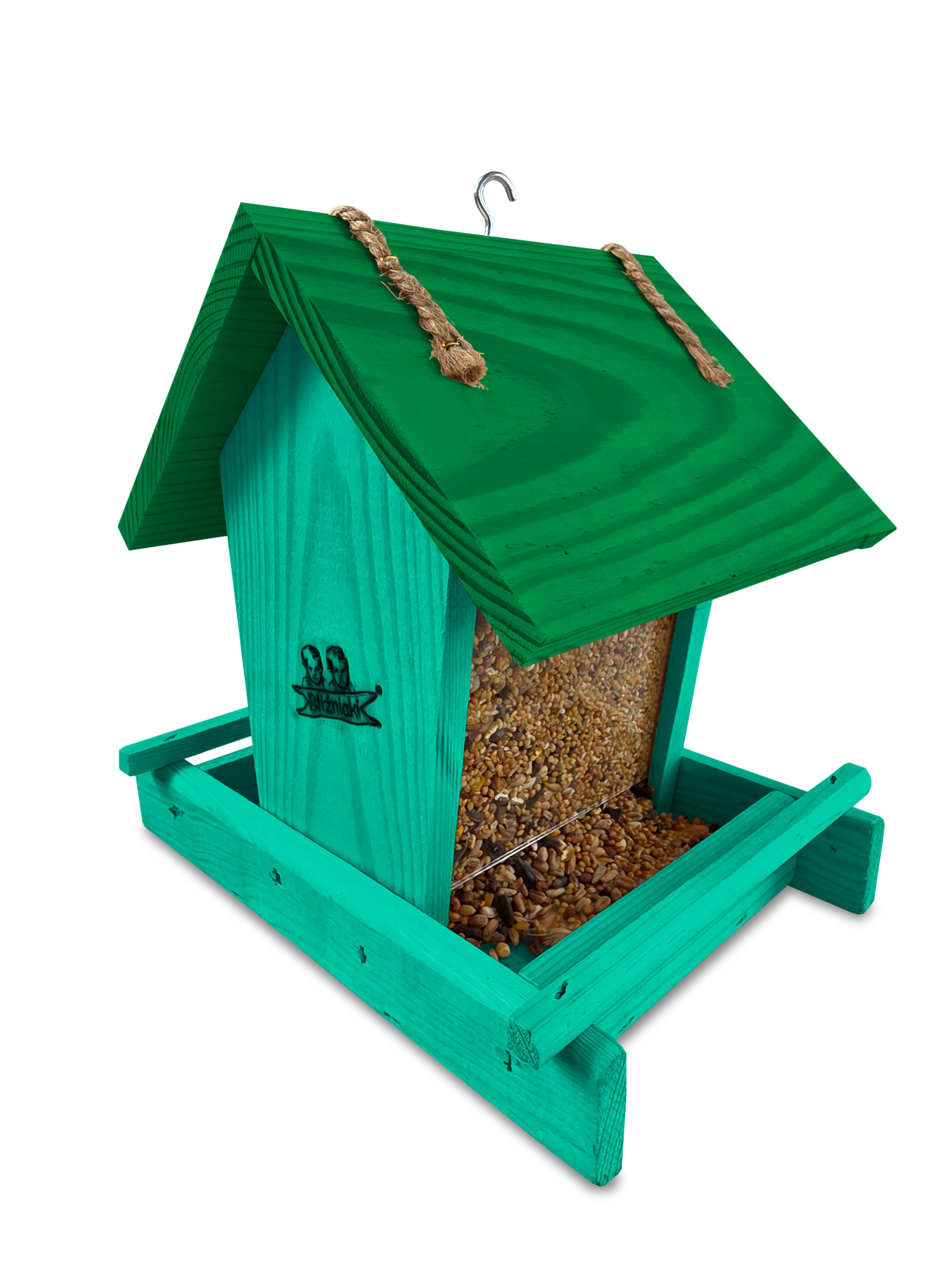 Przedmiotem sprzedaży jest ozdobny drewniany karmnik dla ptaków z dozownikiem ziarna model K29 MR K w kolorze morskiej zieleni z ciemnozielonym dachem
