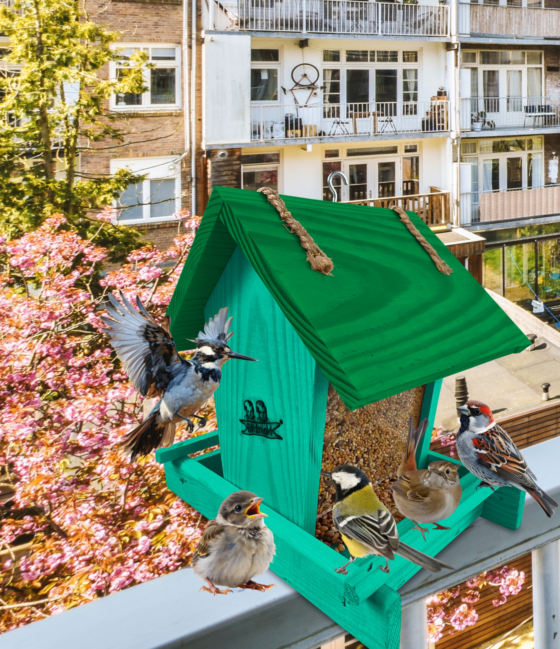 Karmnik posiada haczyk, umożliwiający zawieszenie go na balkonie, drzewie, pod dachem altany. Dzięki temu przylatujące do niego ptaki nie staną się łatwym kąskiem dla kotów i innych zwierząt. Dzięki małym gabarytom, z łatwością można wkomponować go w elementy architektury ogrodowej, na balkonie czy nawet parapecie.