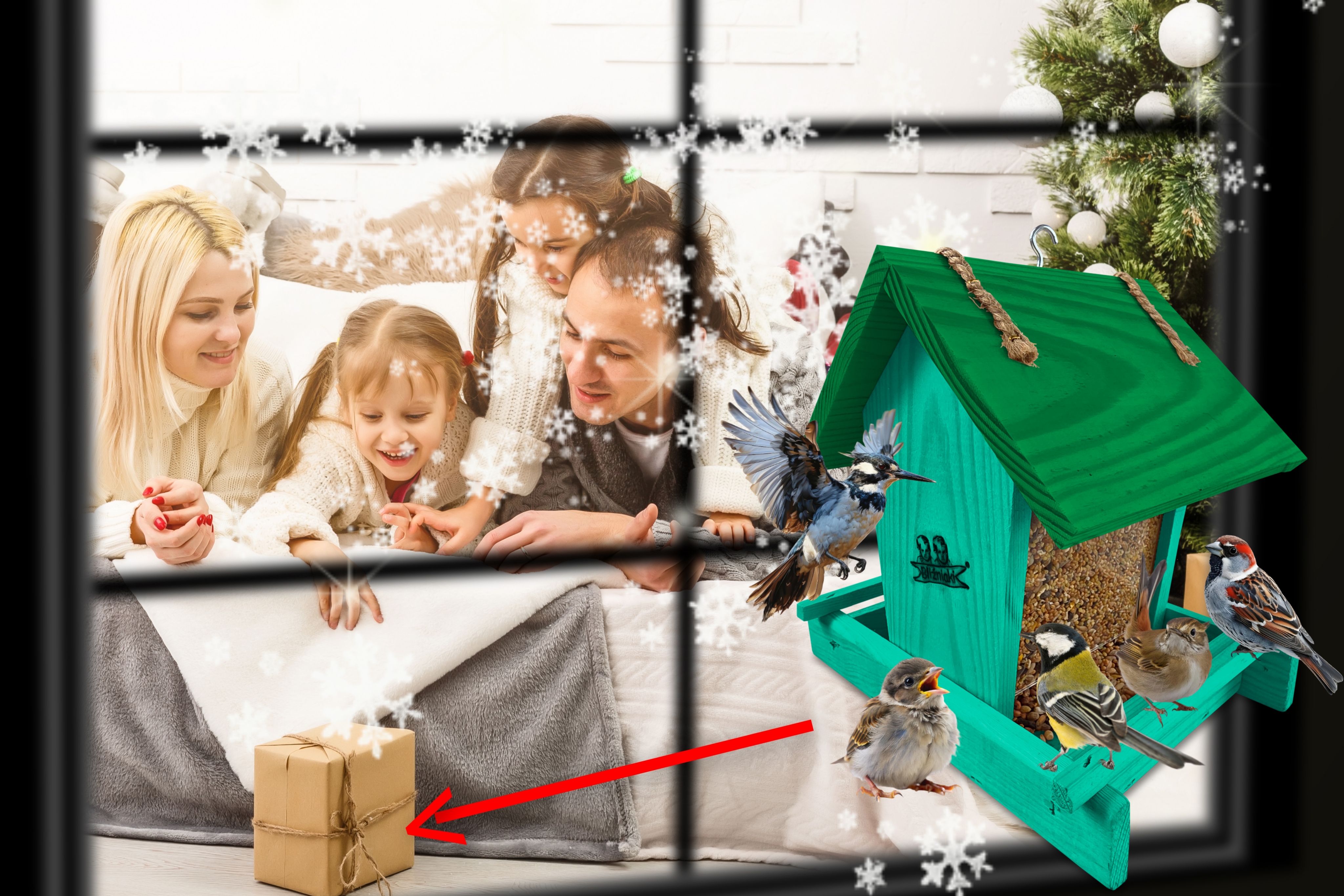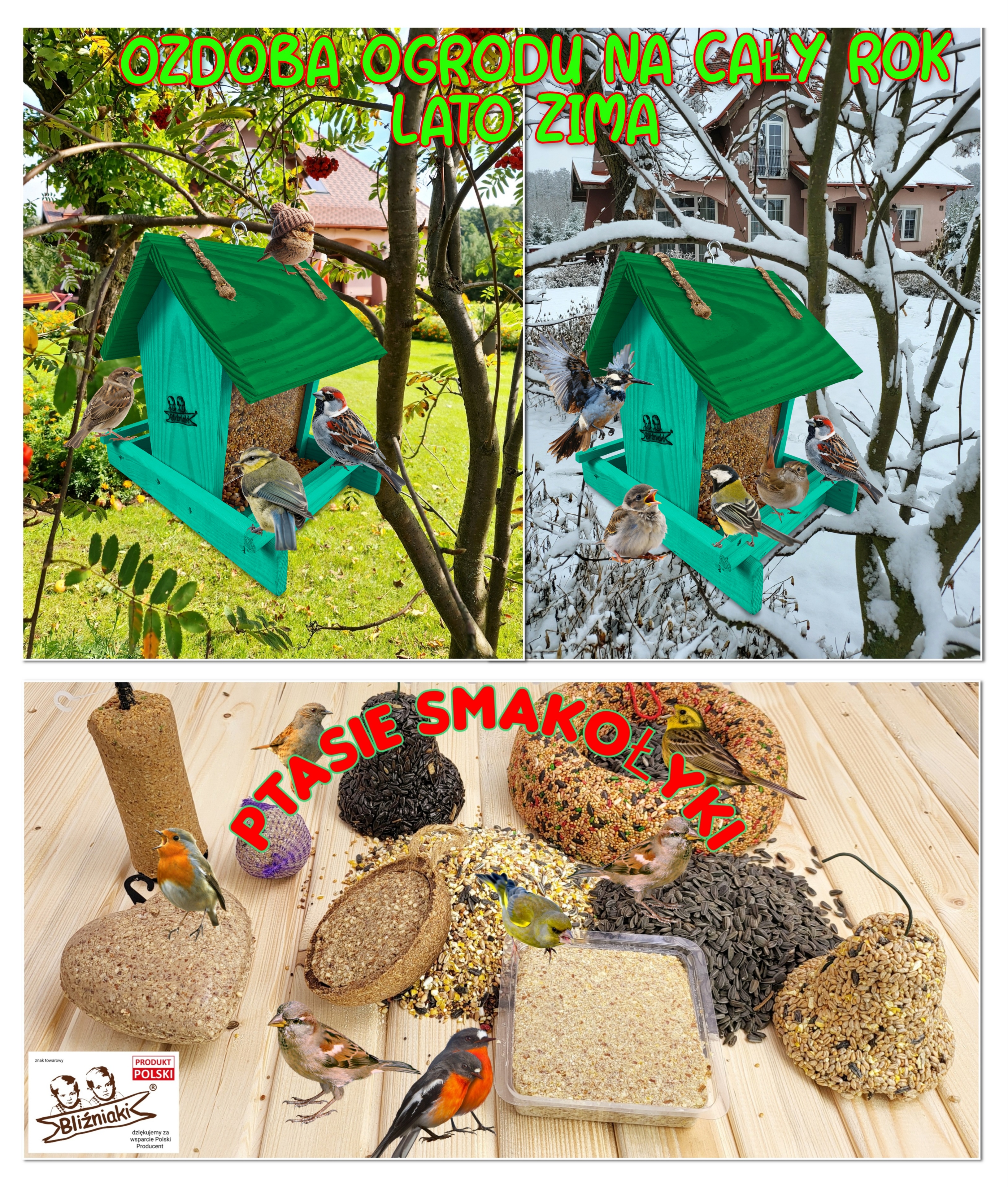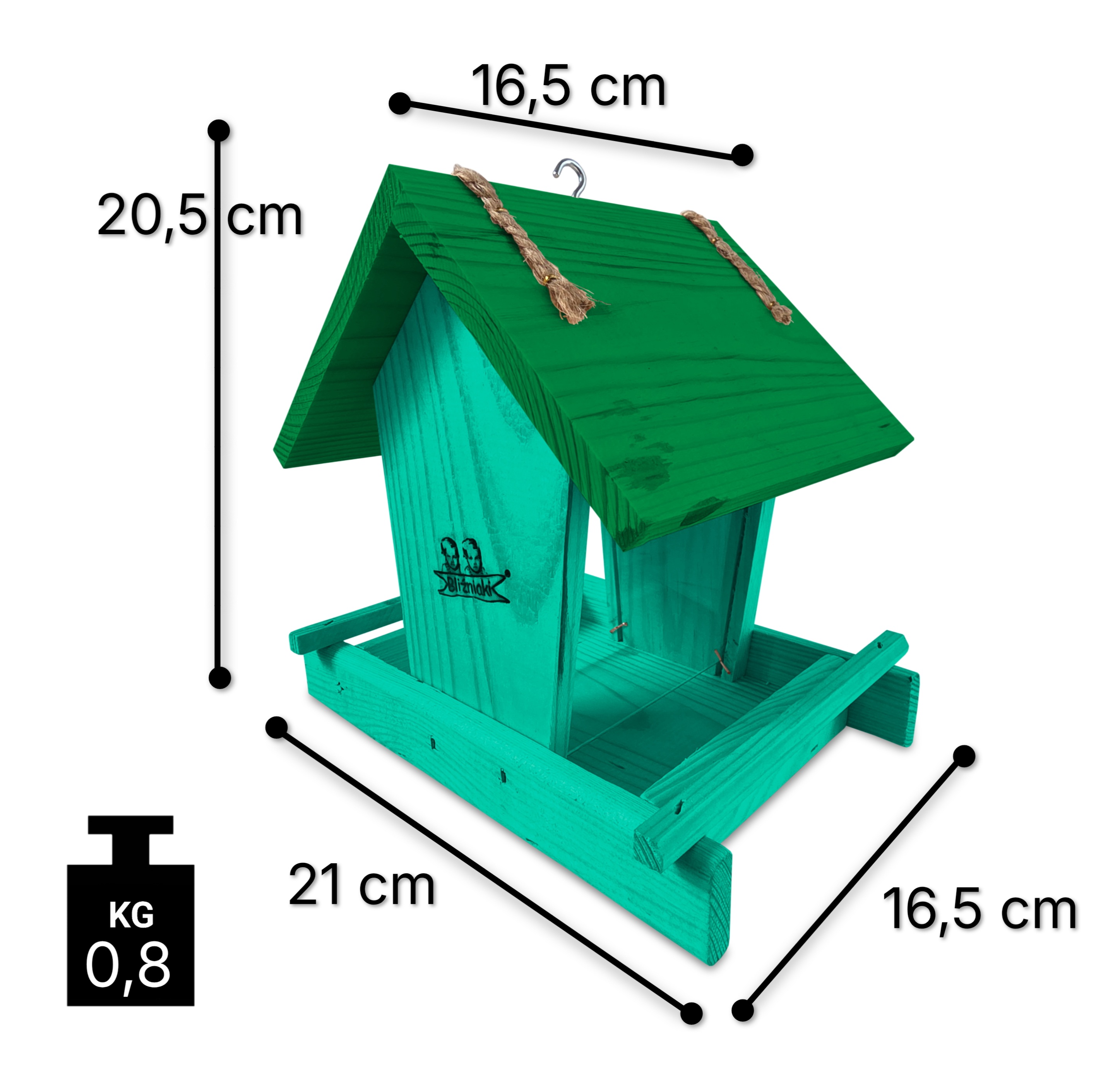 - Karmnik wykonany jest w całości z drewna iglastego, KOLOR MORSKA ZIELEŃ Z CIEMNOZIELONYM DACHEM