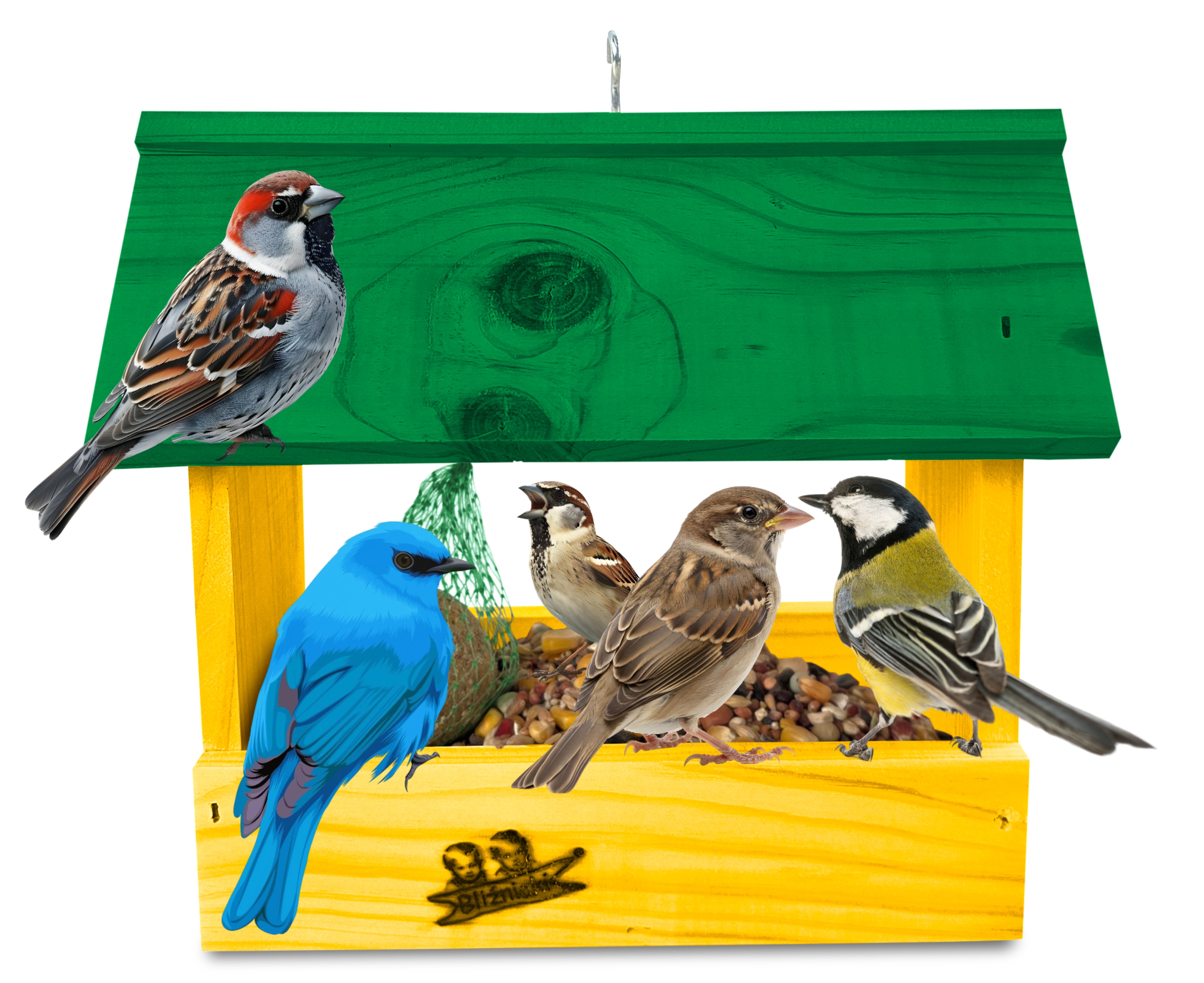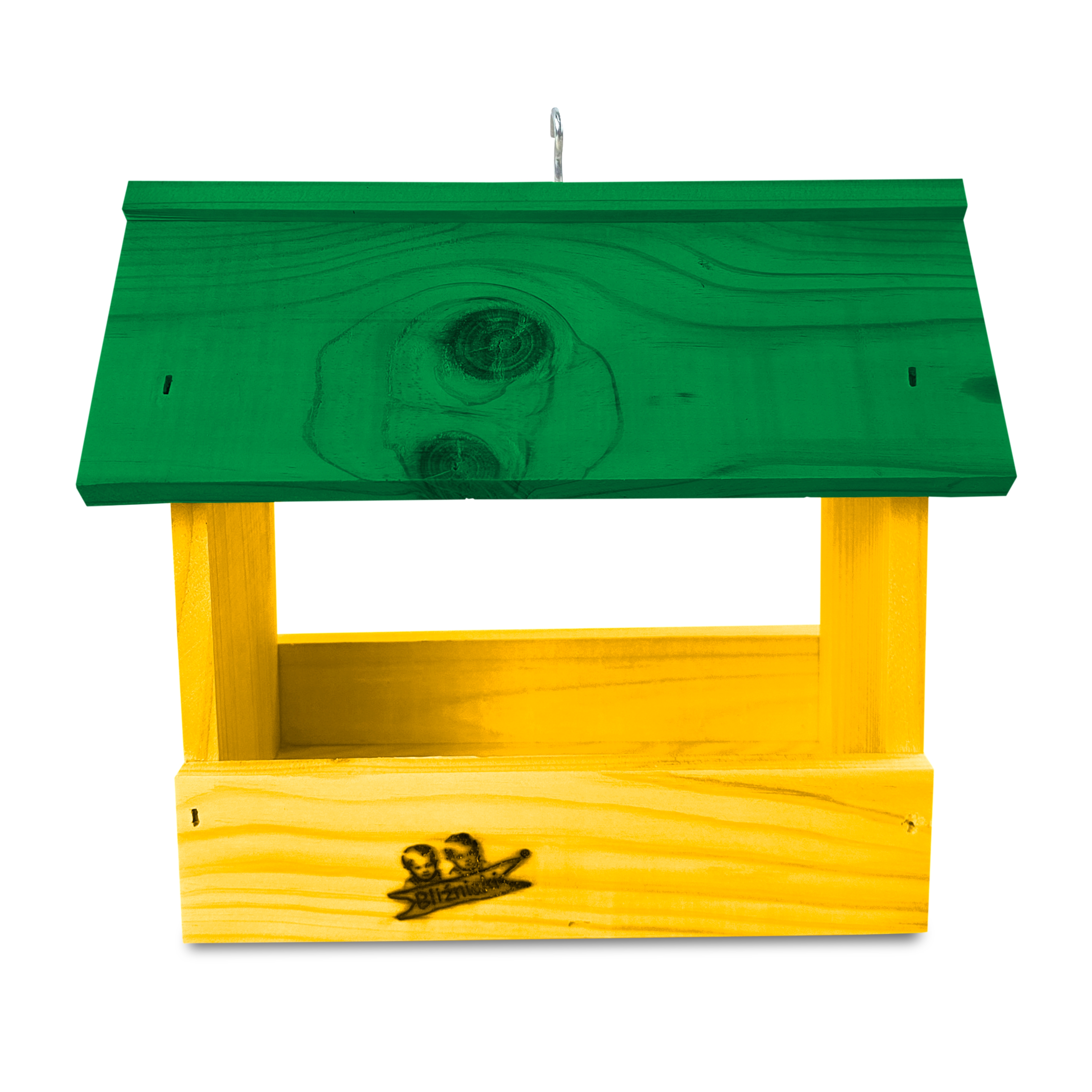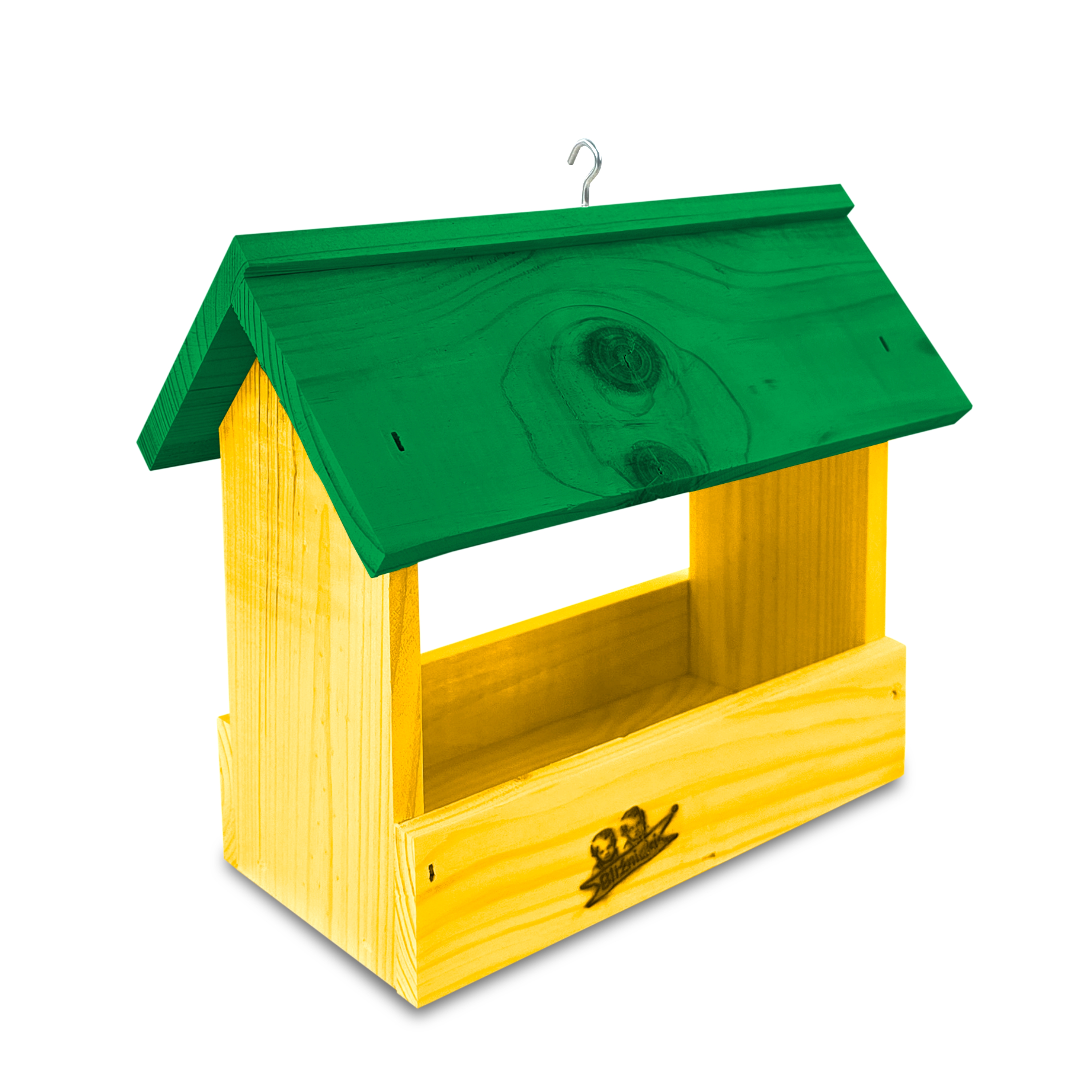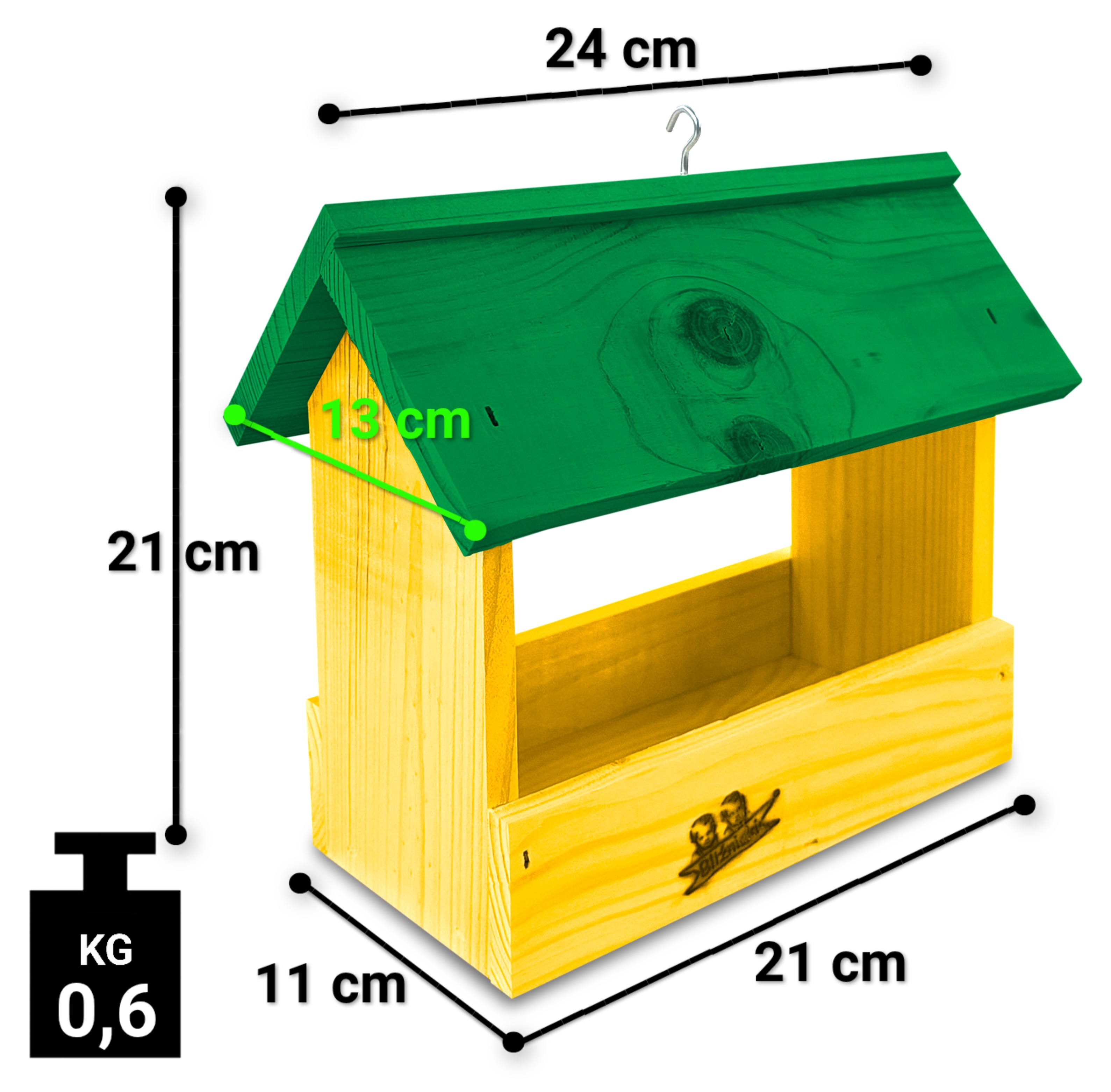 - Karmnik wykonany jest w całości z drewna iglastego, KOLOR ŻÓŁTY Z ZIELONYM DACHEM