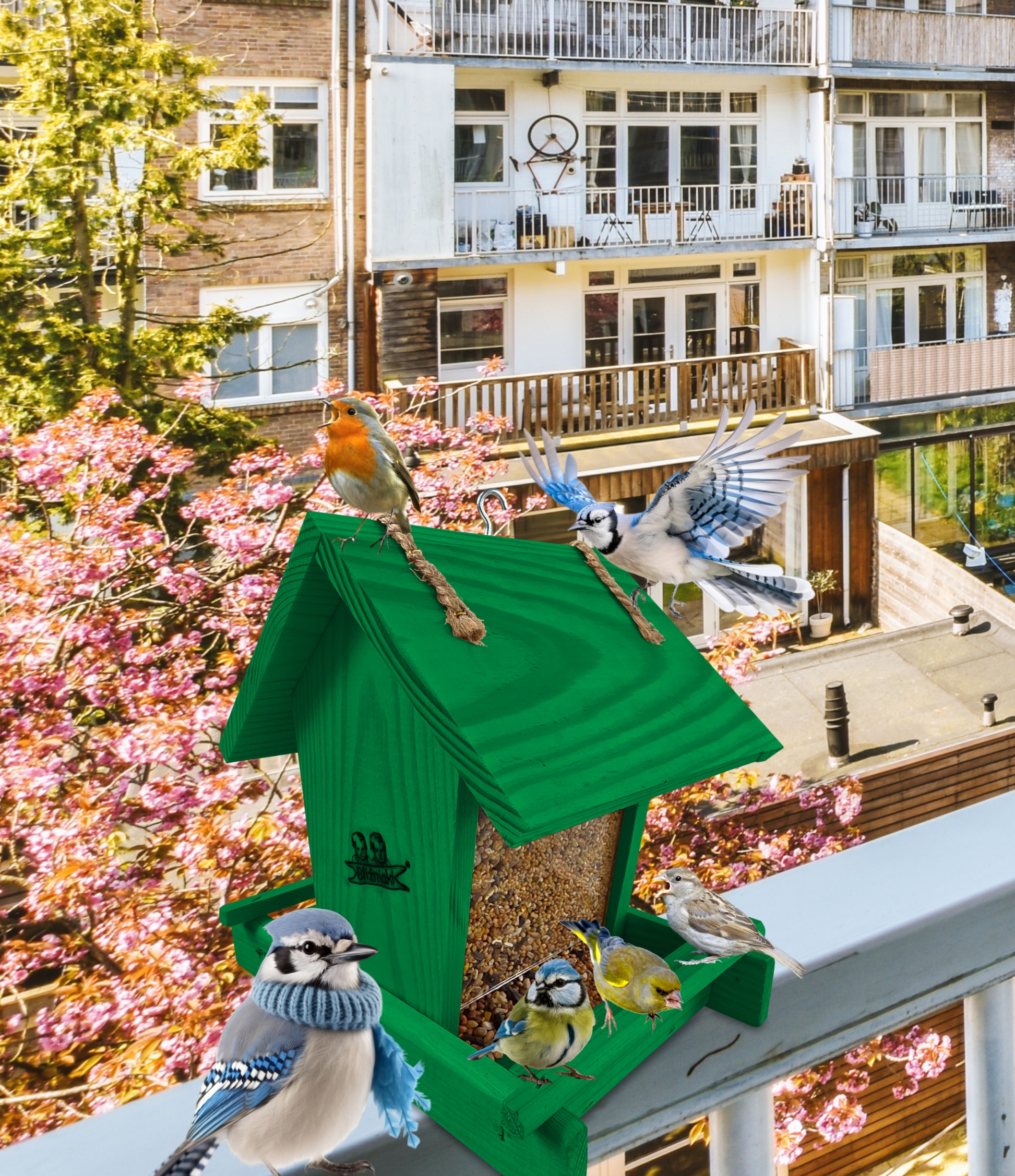 Karmnik posiada haczyk, umożliwiający zawieszenie go na balkonie, drzewie, pod dachem altany. Dzięki temu przylatujące do niego ptaki nie staną się łatwym kąskiem dla kotów i innych zwierząt. Dzięki małym gabarytom, z łatwością można wkomponować go w elementy architektury ogrodowej, na balkonie czy nawet parapecie.
