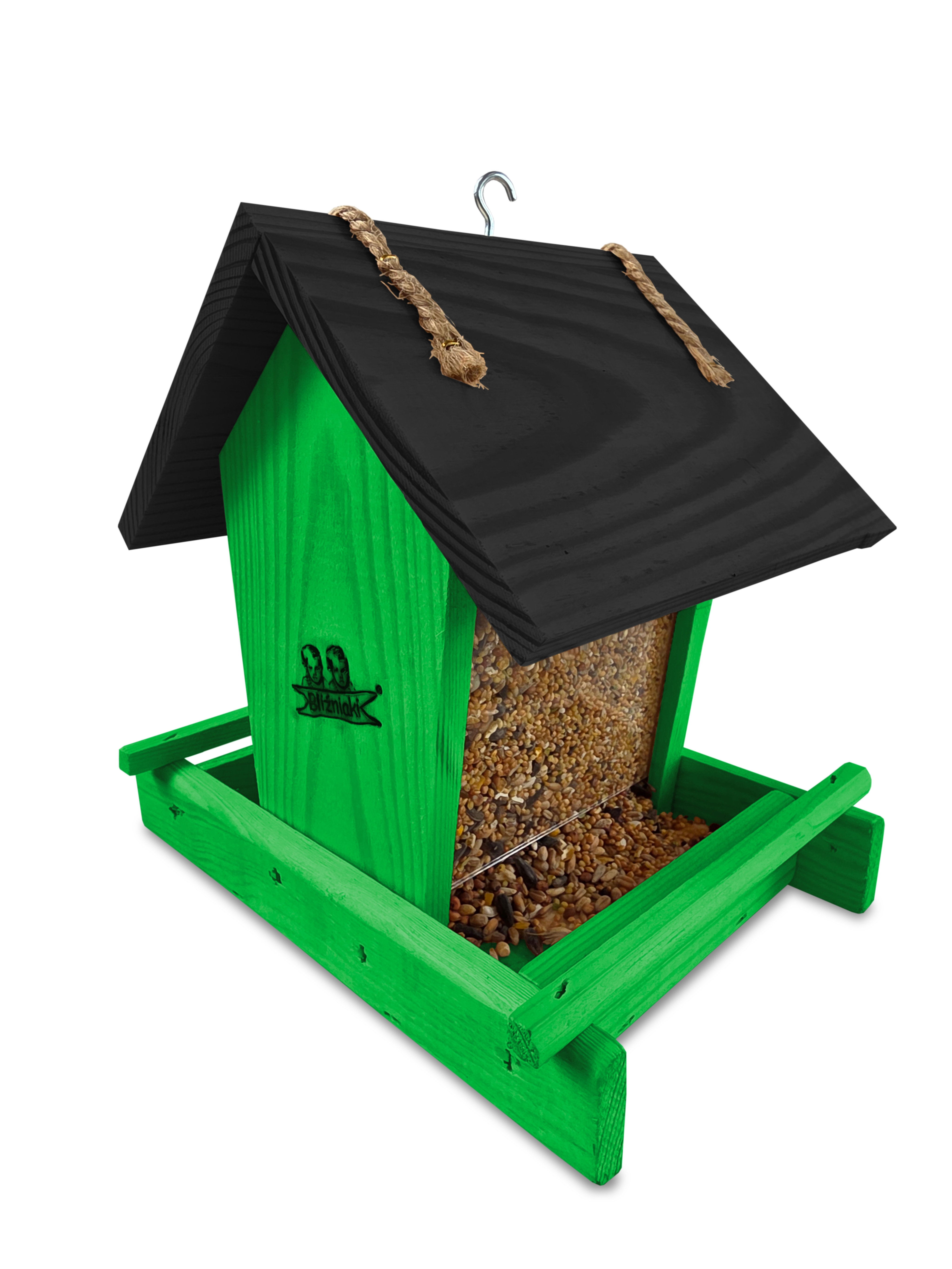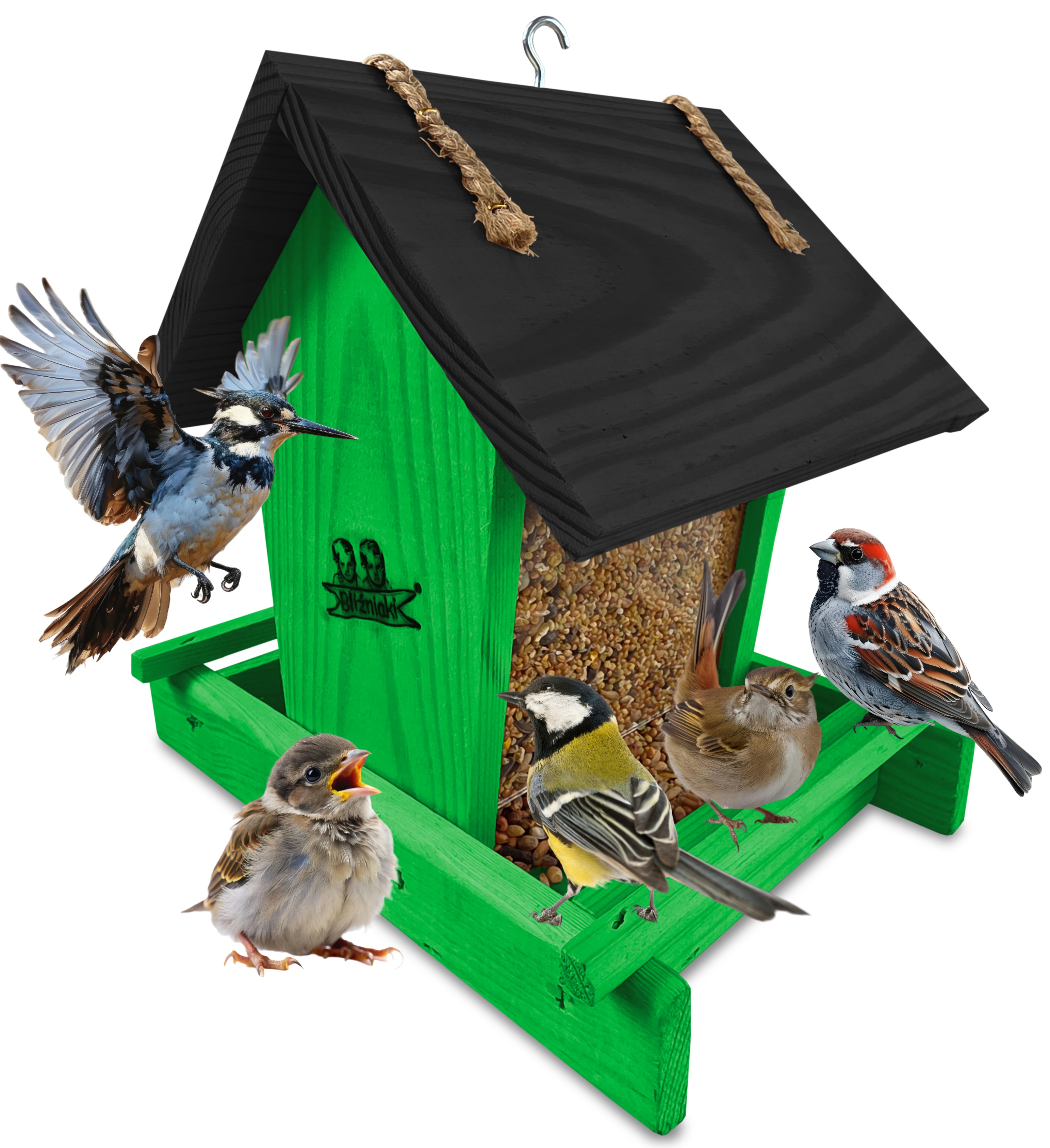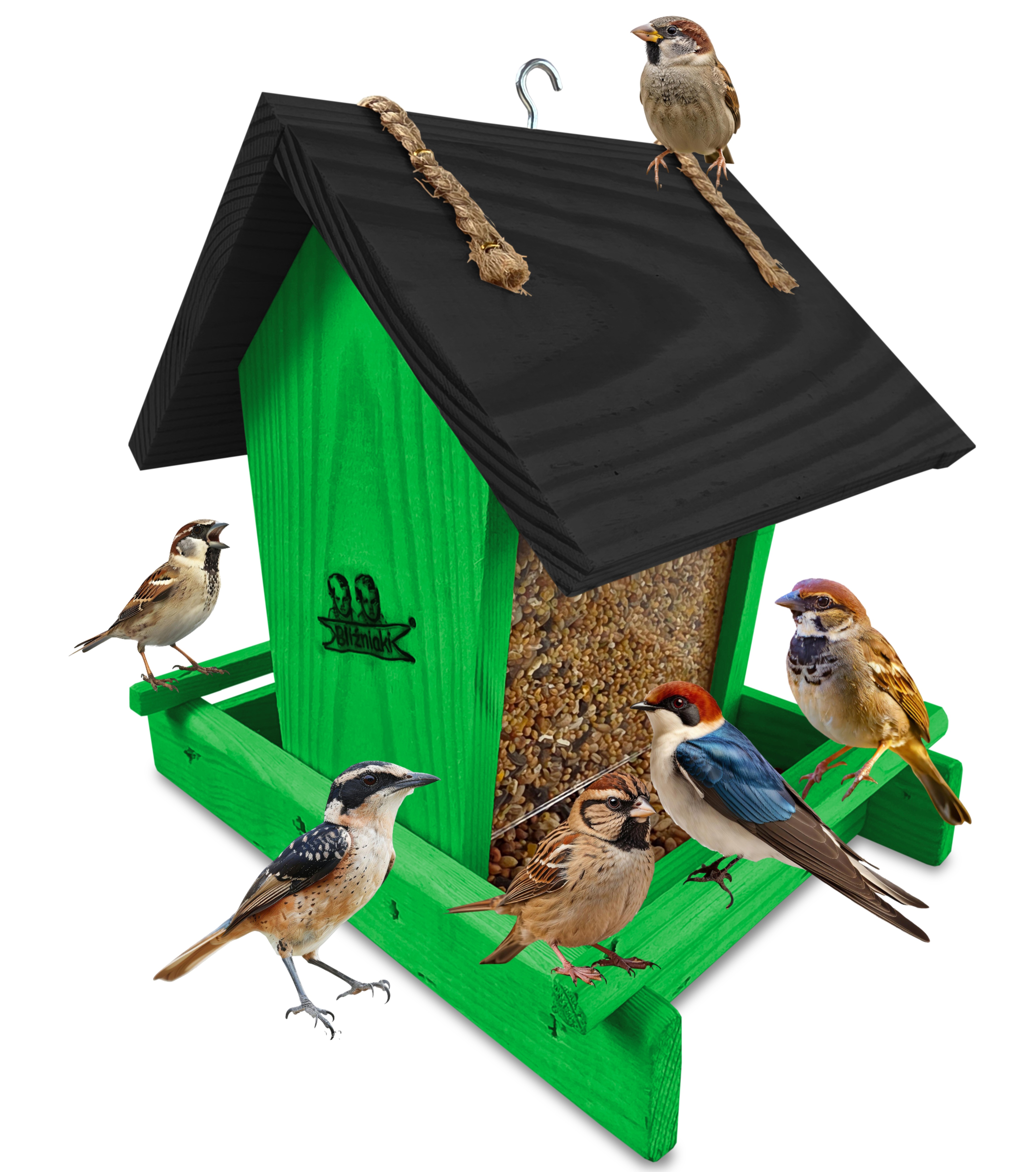 Przedmiotem sprzedaży jest ozdobny drewniany karmnik dla ptaków z dozownikiem ziarna model K29 ZZ CZ kolor zielony z czarnym dachem