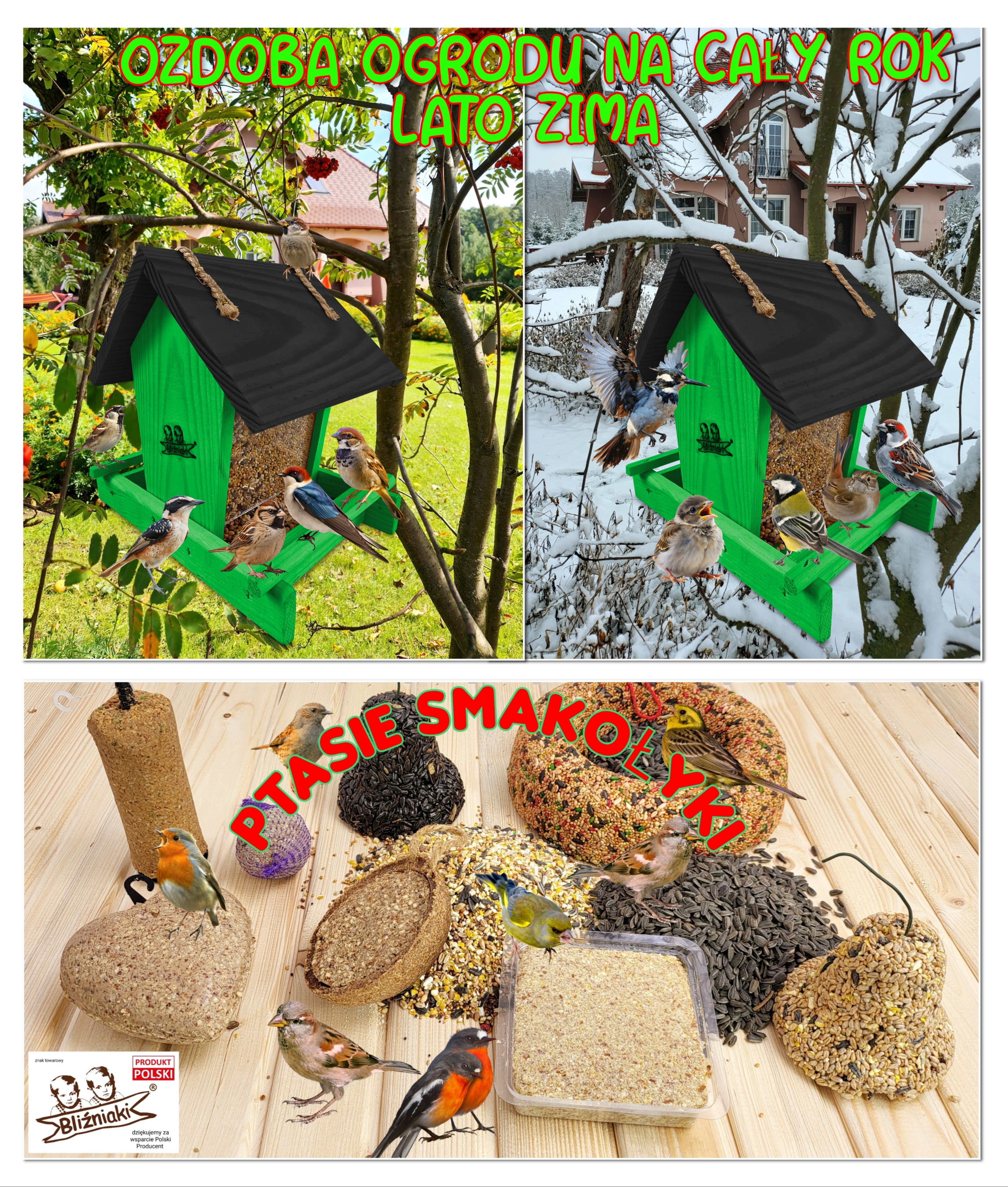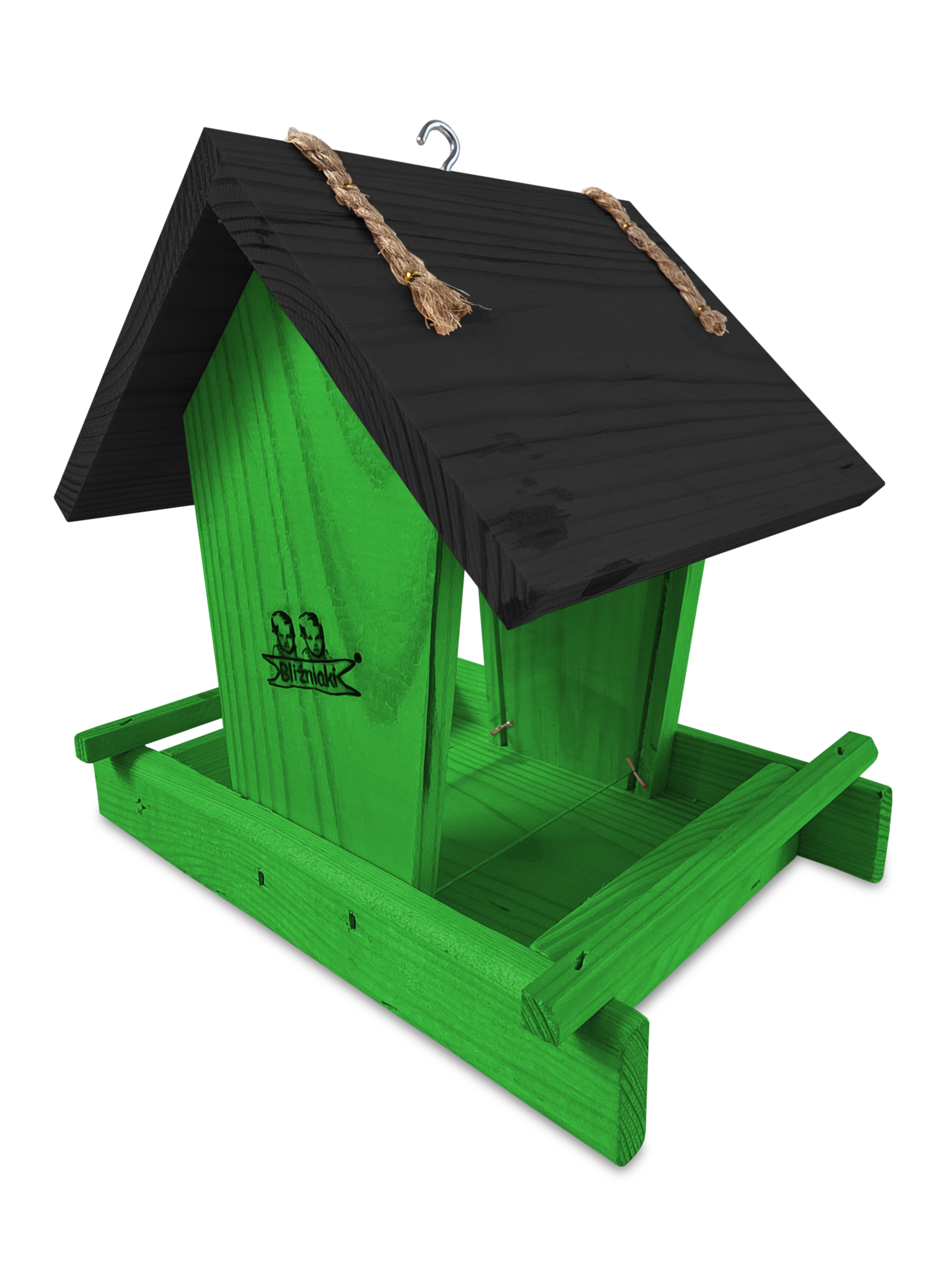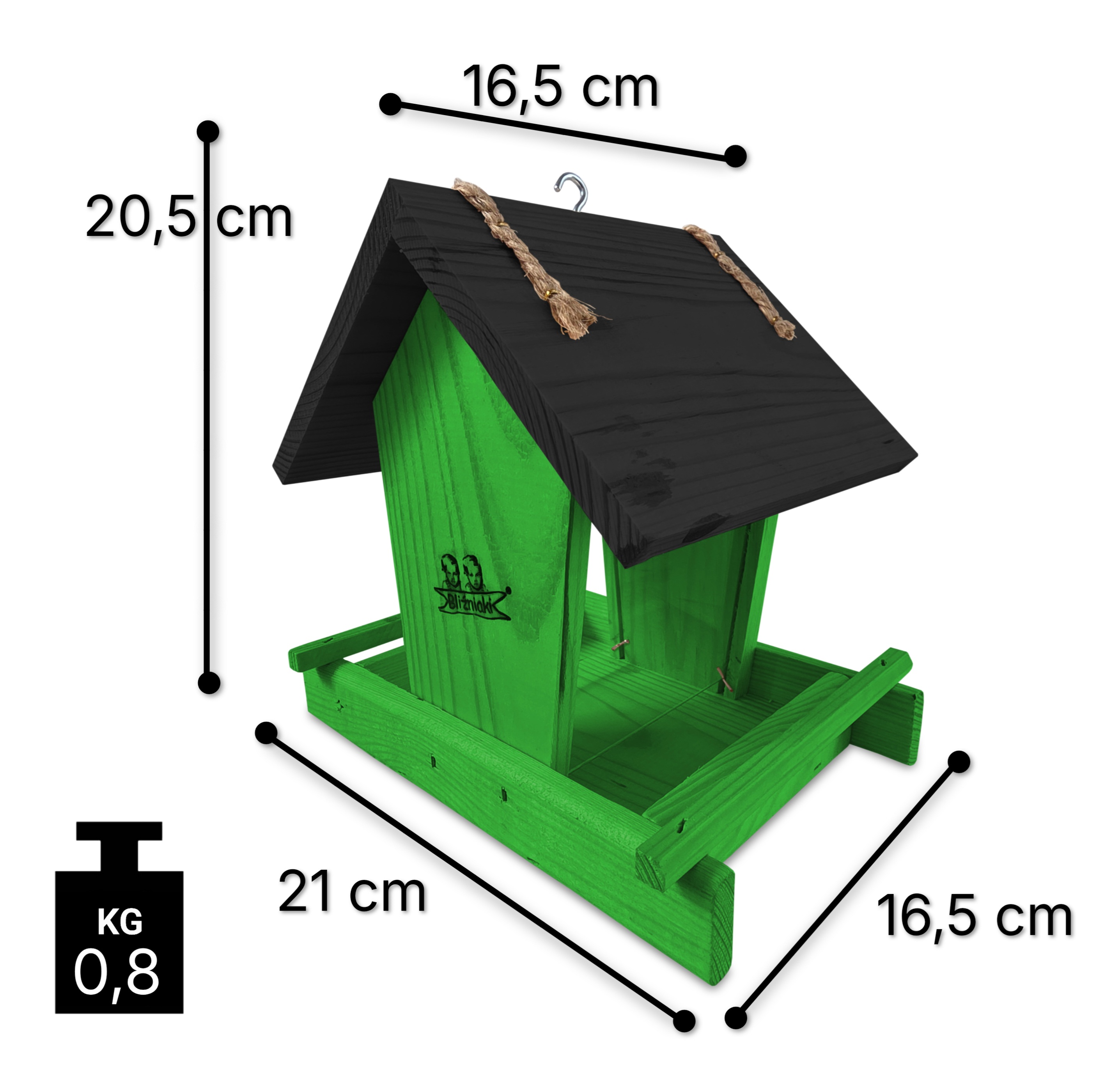 - Karmnik wykonany jest w całości z drewna iglastego, KOLOR ZIELONY Z CZARNYM DACHEM