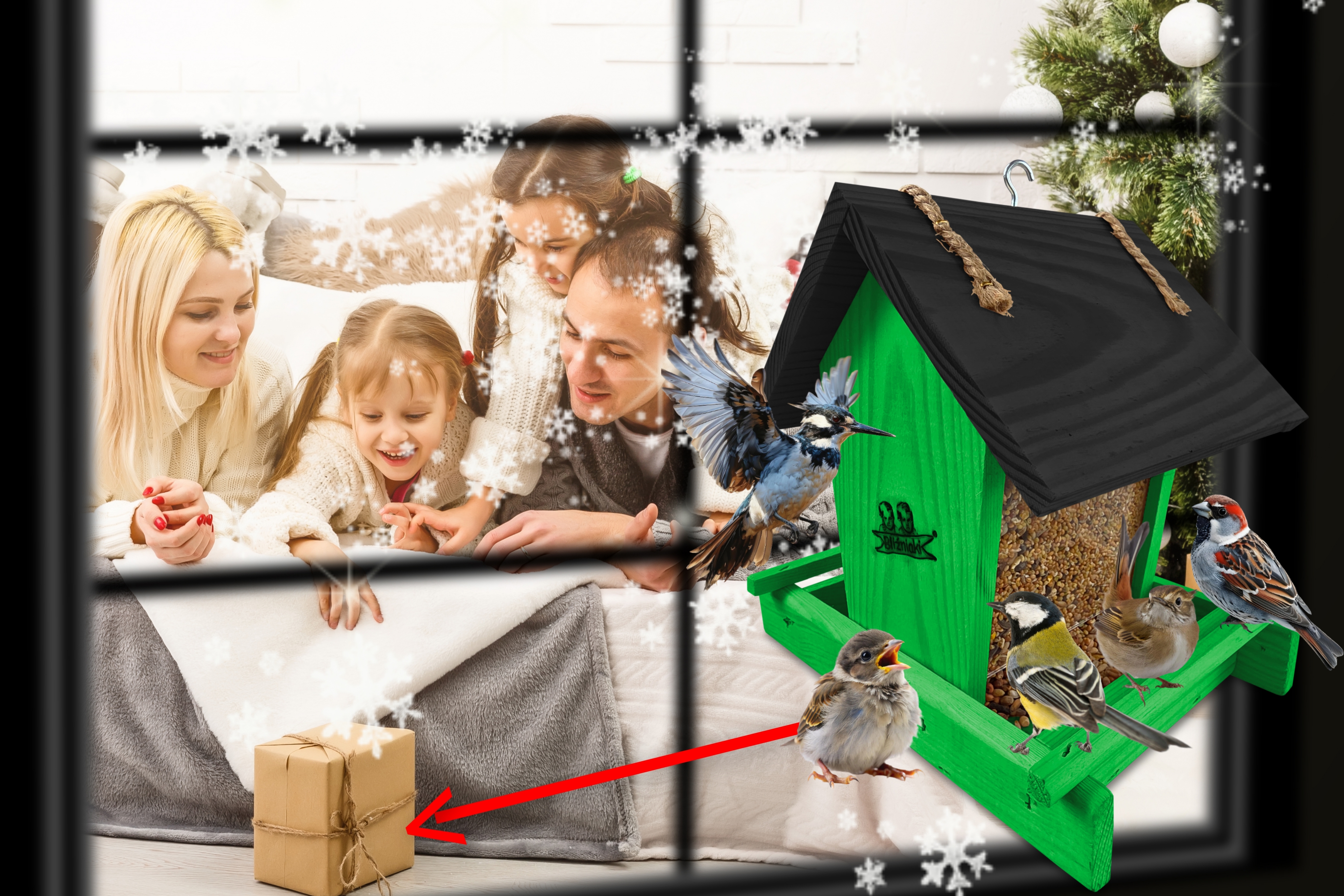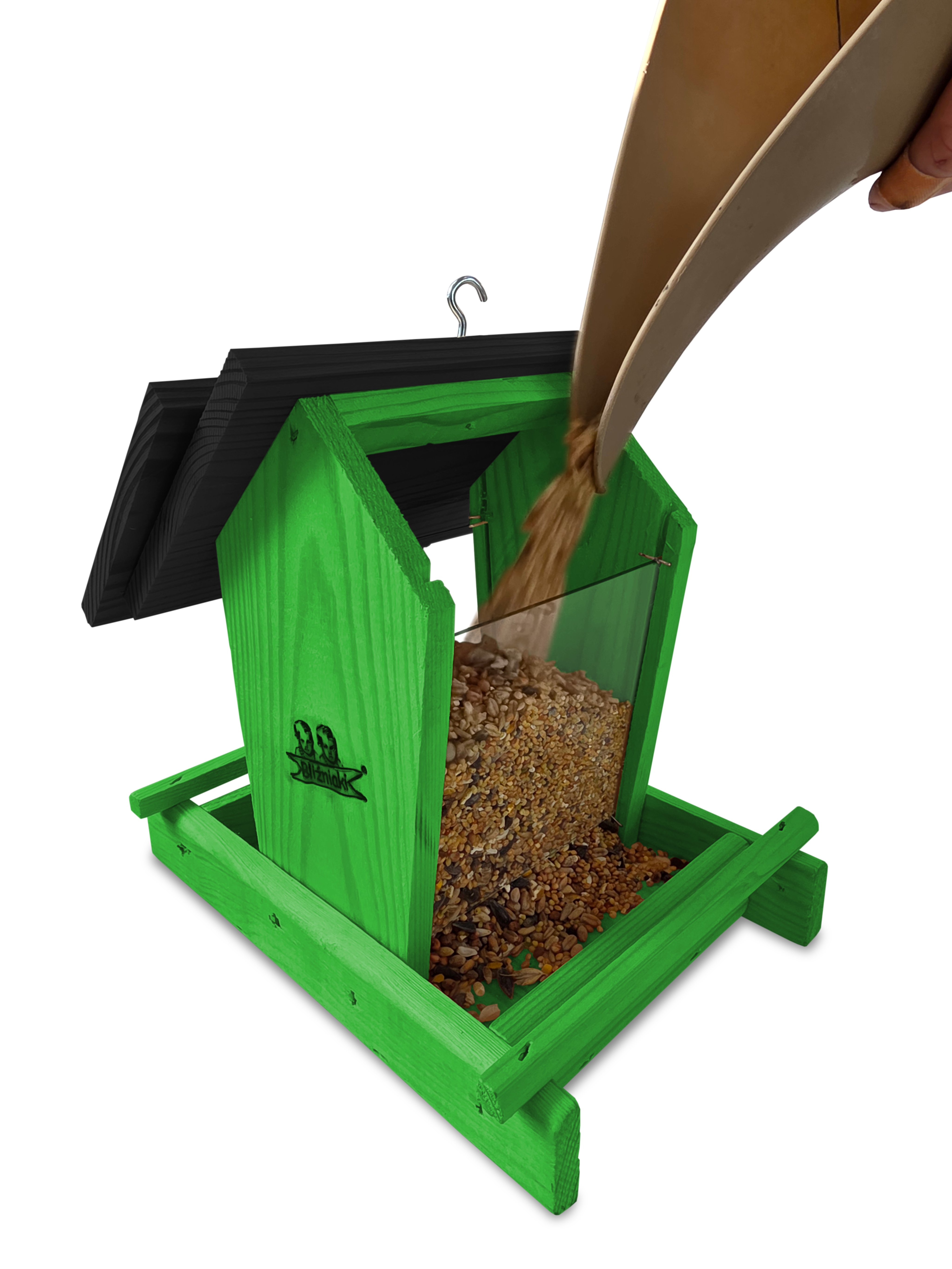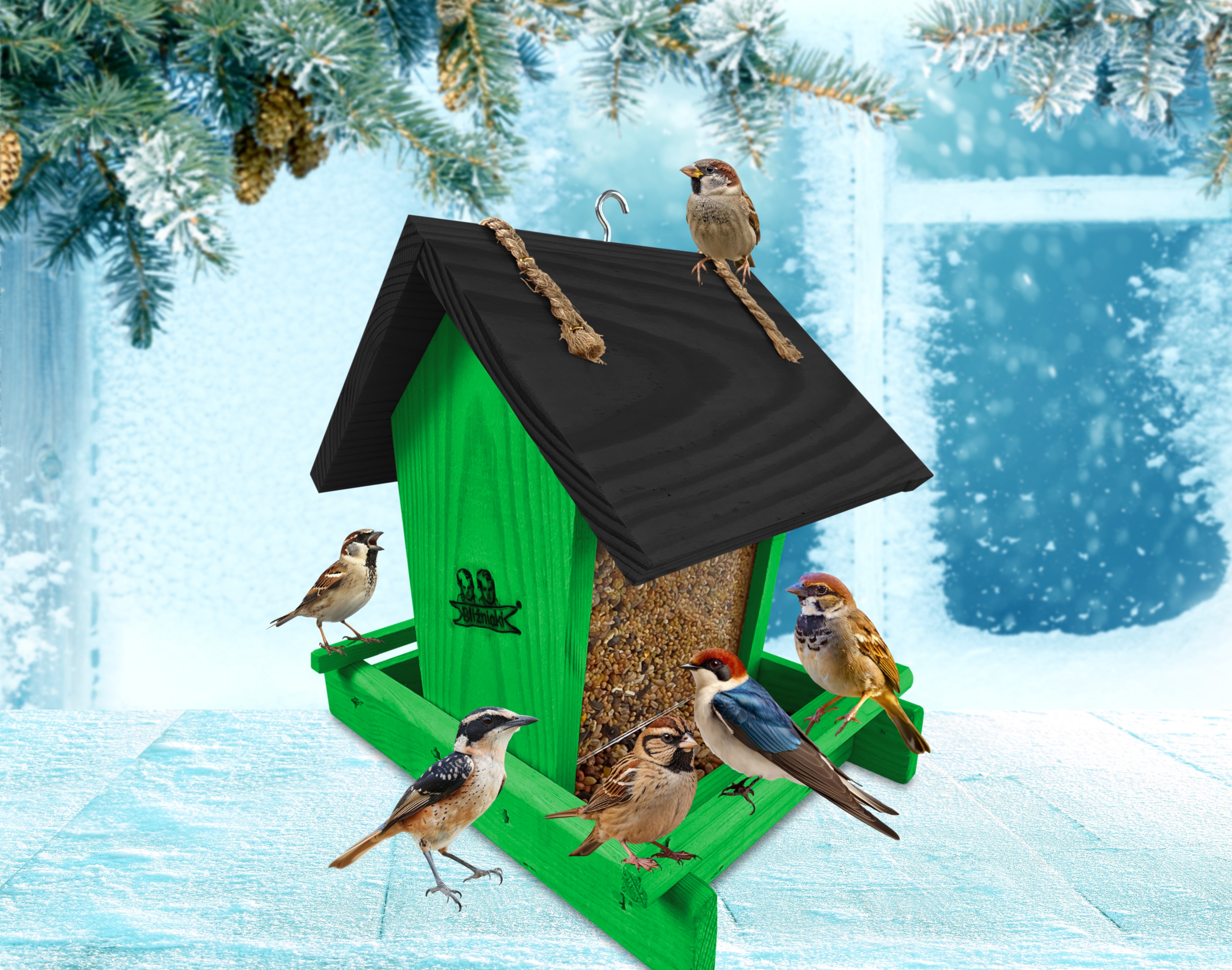 - Karmnik wykonany jest w całości z drewna iglastego, KOLOR ZIELONY Z CZARNYM DACHEM