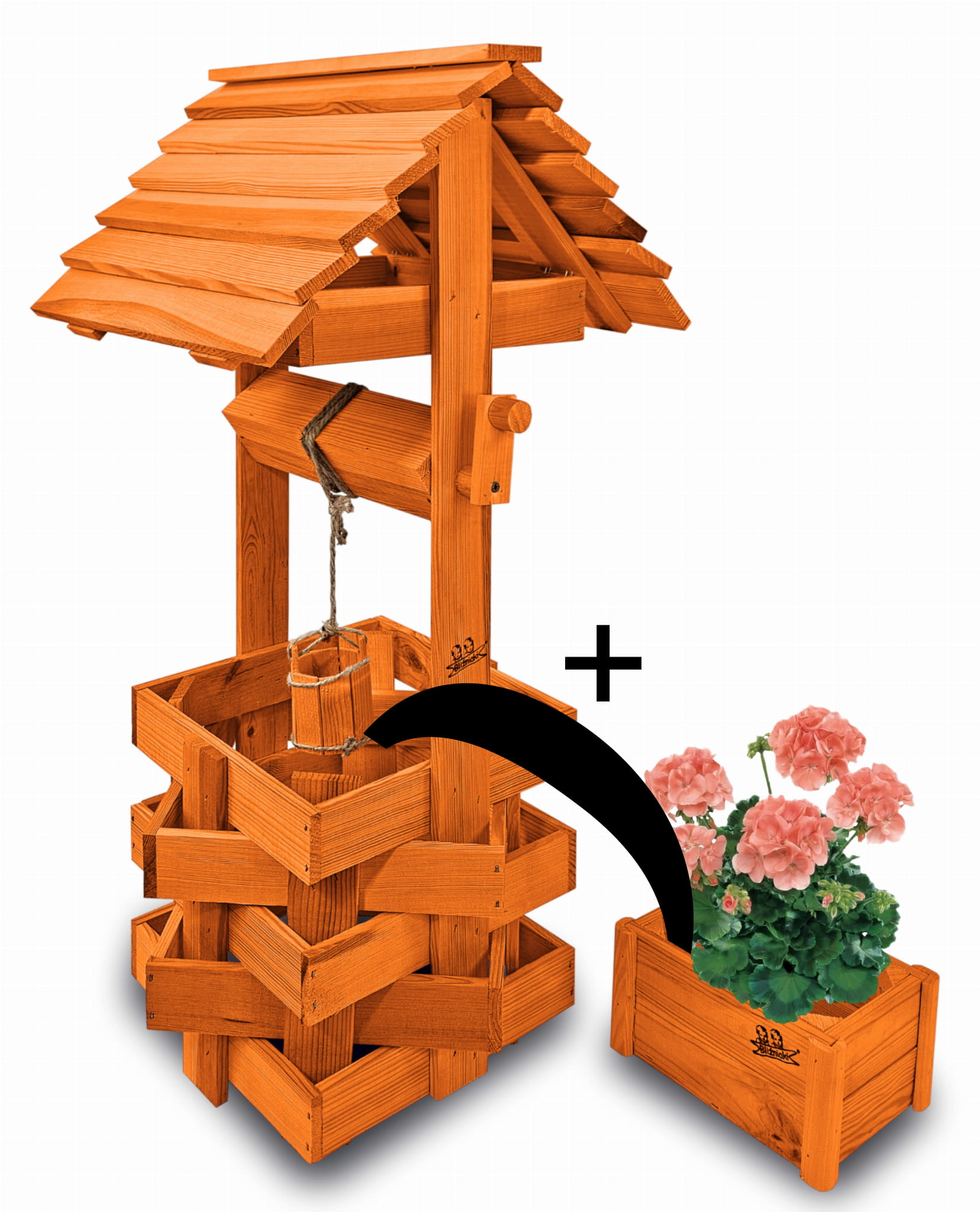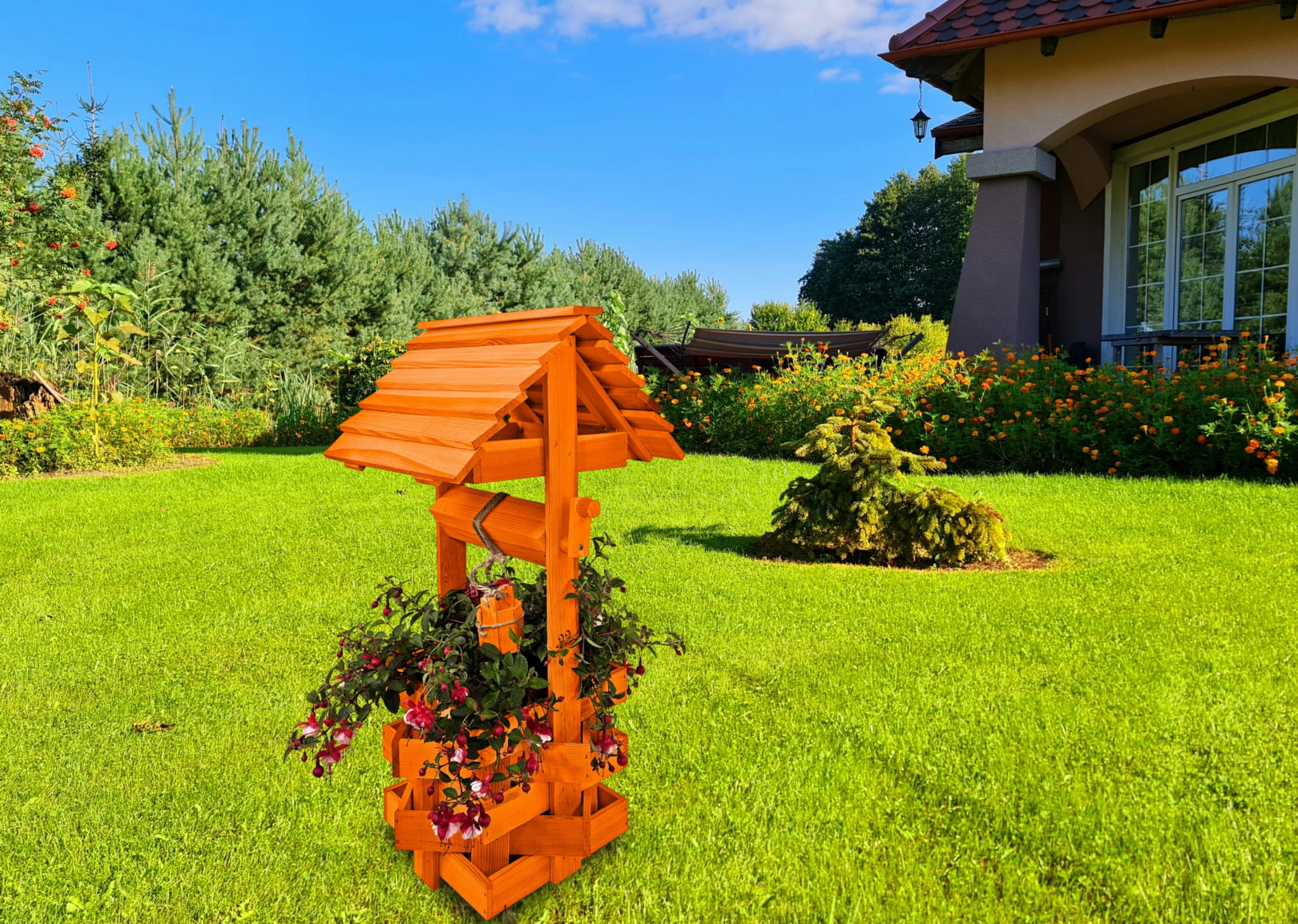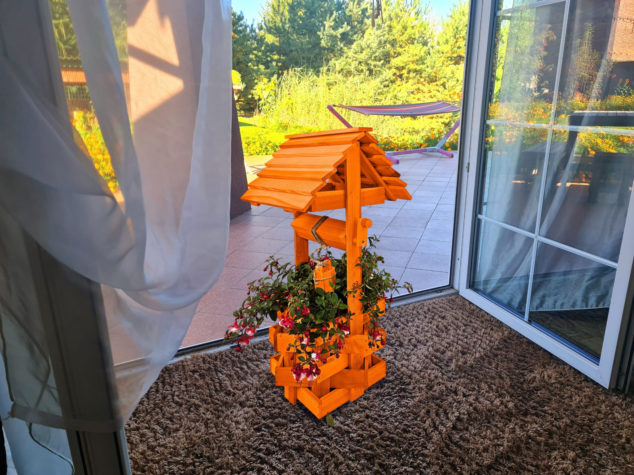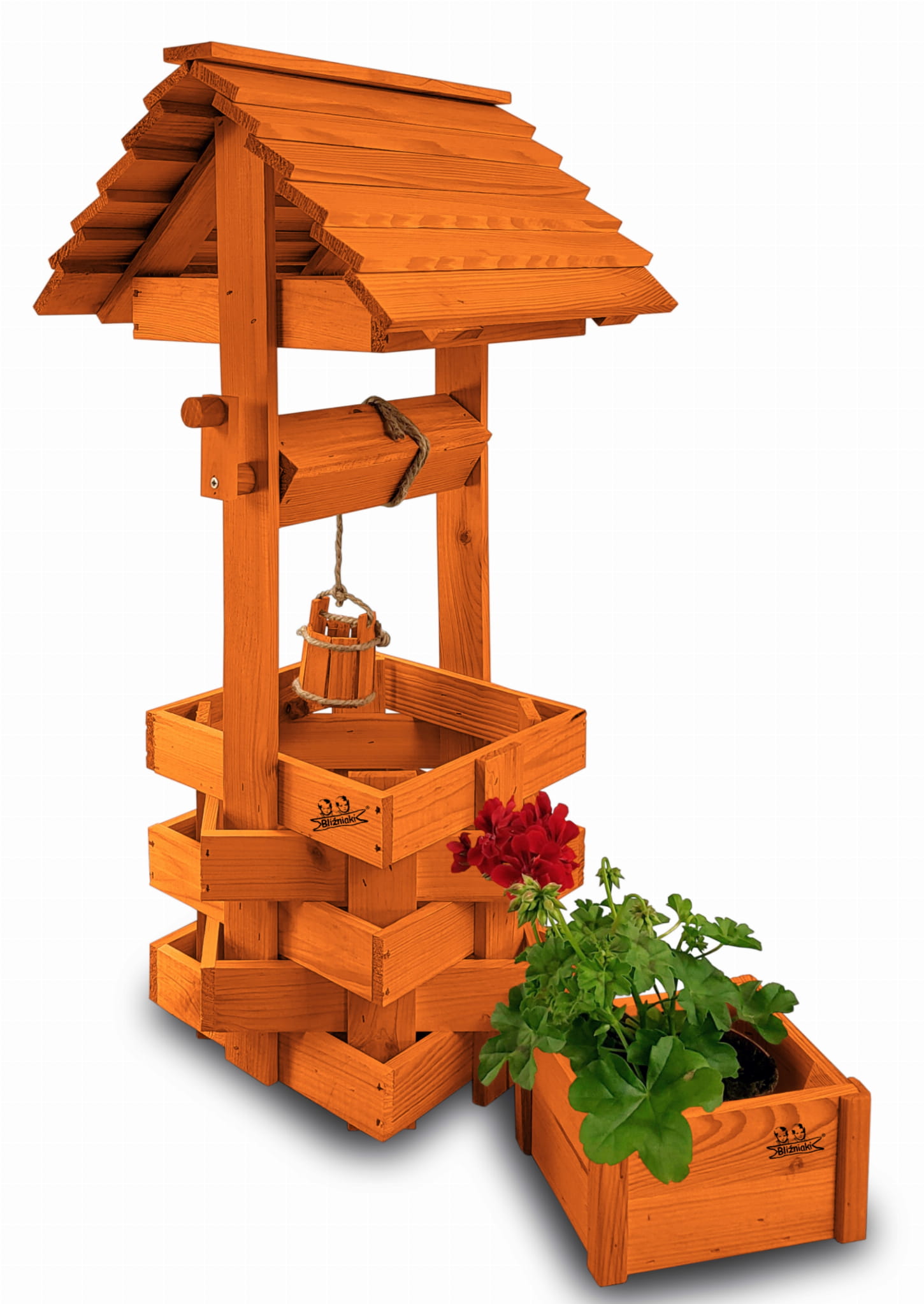 Do studni dołączona jest drewniana doniczka na kwiaty, utrzymana w tej samej estetyce, tworząc spójną i harmonijną całość.