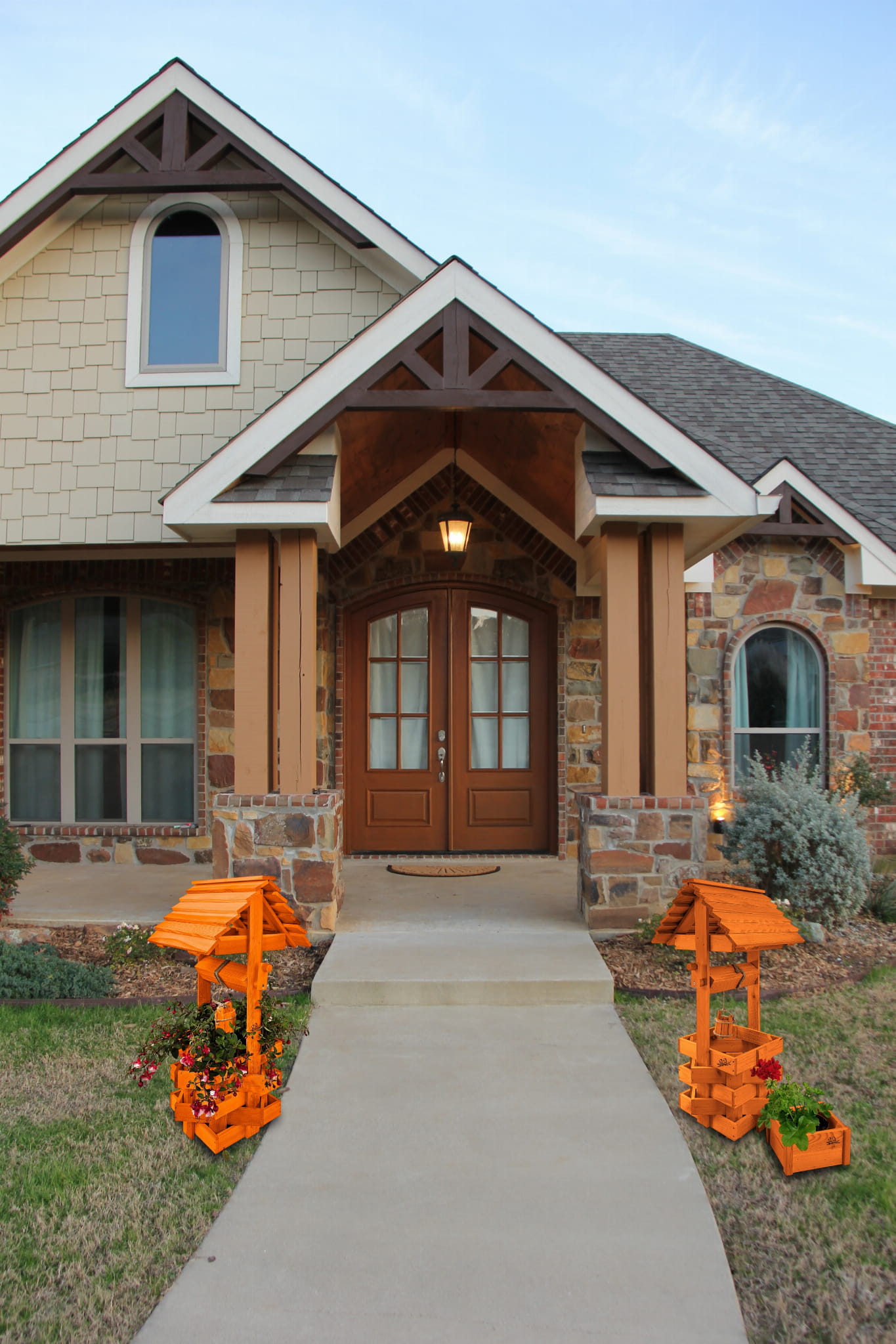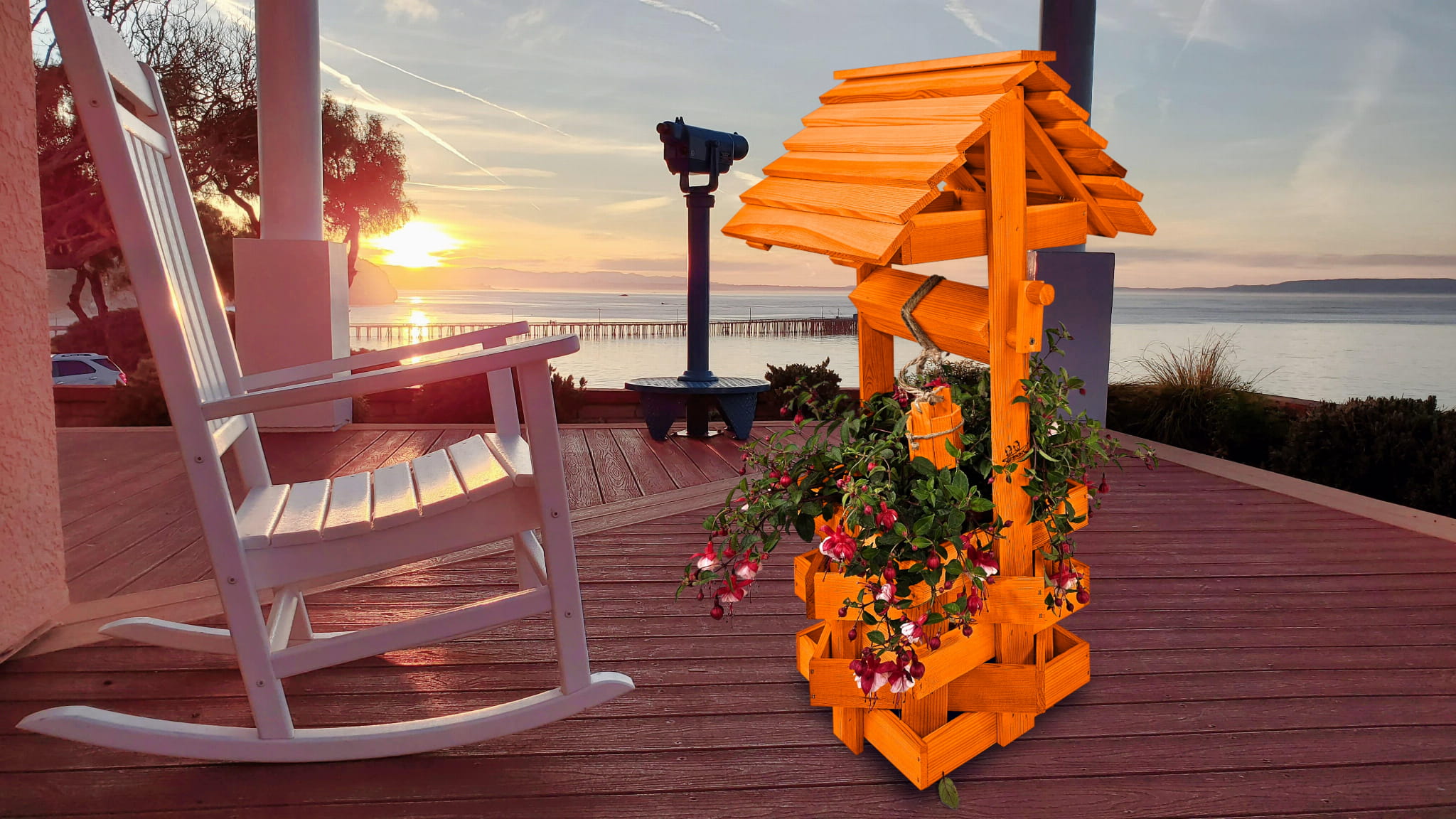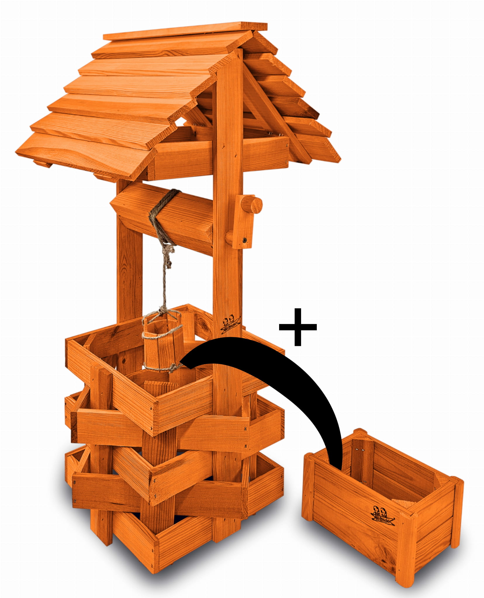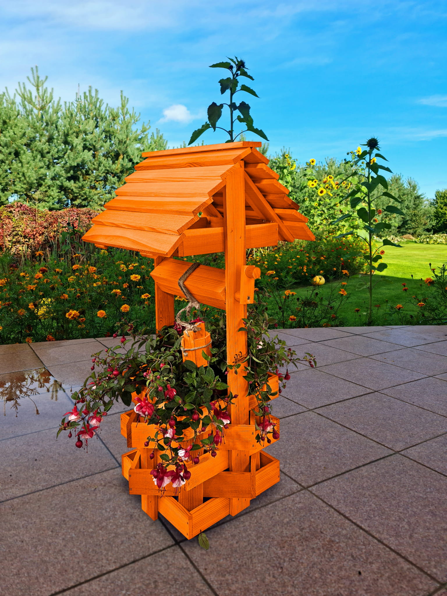 Do studni dołączona jest drewniana doniczka na kwiaty, utrzymana w tej samej estetyce, tworząc spójną i harmonijną całość.